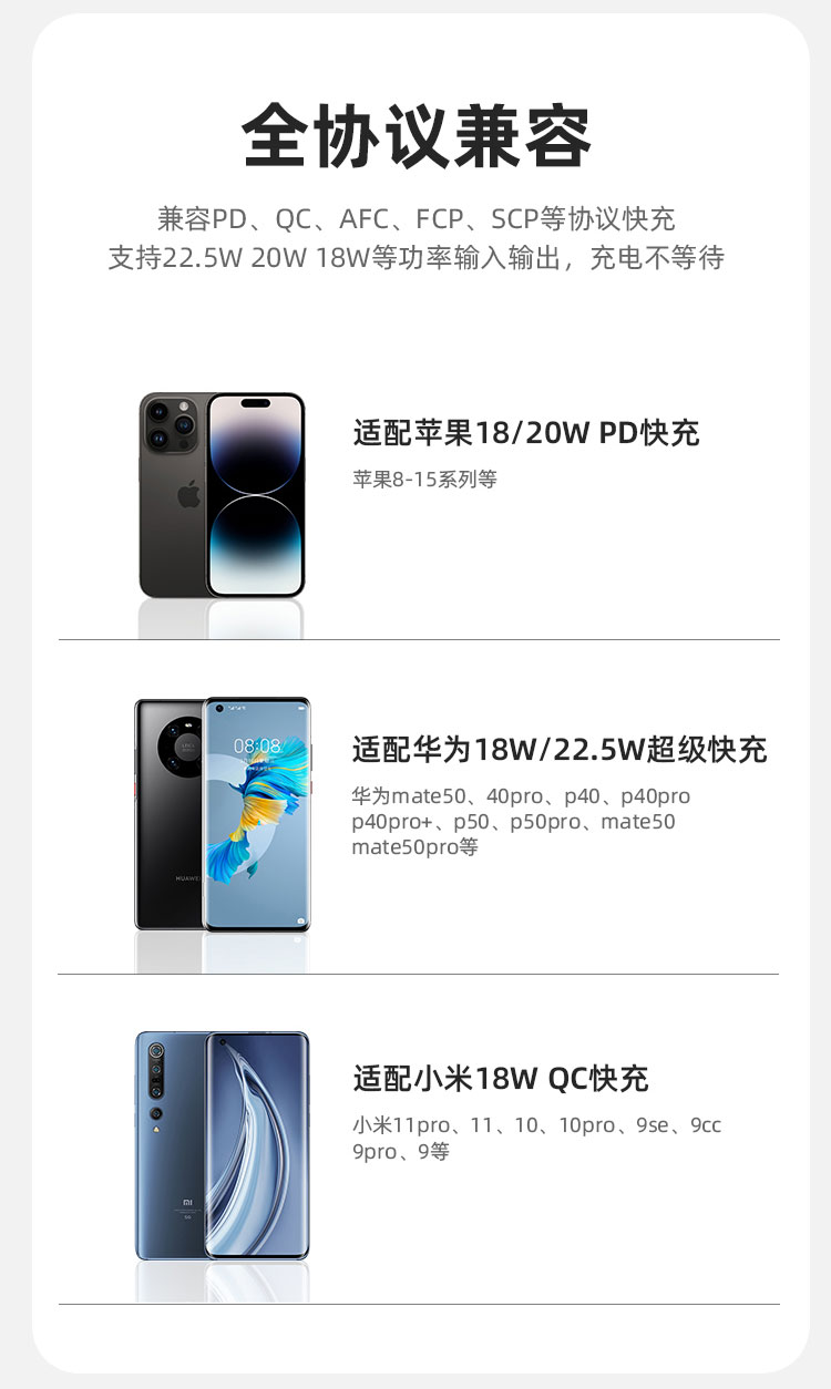 电芯容量:20000mAh(74Wh) 额定容量:11000mAh 输入(Type-C):5V-3A 9V-2A 12V-1.5A 输入(Micro-USB):5V-2A 9V-2A 12V -1.5A 输出(USB-A):10V- 2.25A 9V - 2A 12V- 1.5A 5V-3A 电芯类型:锂-聚合物电芯 1:随身自带线 、充电很方便 自带苹果、Type-C双快充线 2:Type-C线+lightning线+USB-A+Type-C输出口 可同时为4台设备输出充电,充电不等待 3:大容量 20000mAh 、持久续航 4:Type-C口支持PD 20W输出,搭配PD快充线,USB-A口支持22.5W输出 5:支持18W双向快充,蓄电时间大幅缩减