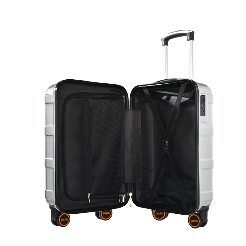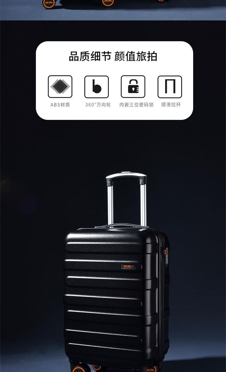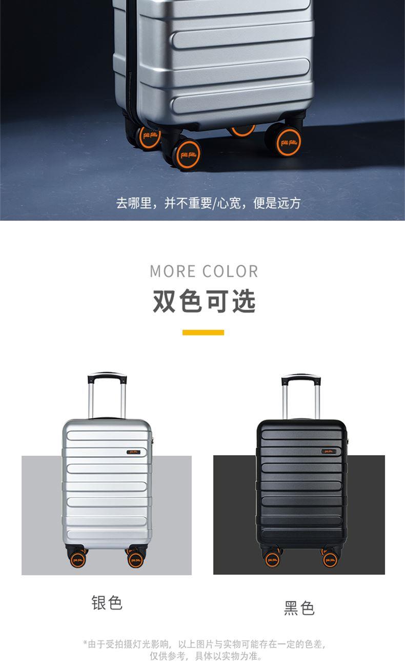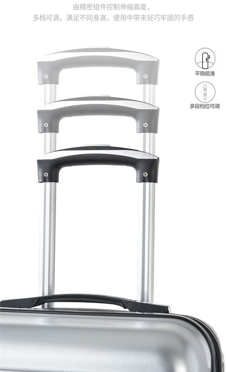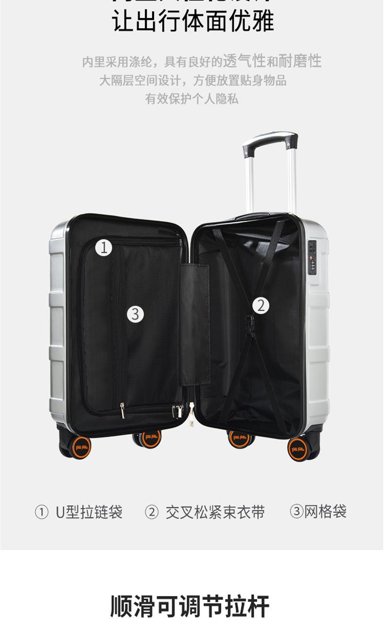 加厚ABS+PC箱体均衡分散受力,增固抗压双重; 360°万向轮顺滑静音,灵活平纹,减震降噪; 安全便捷,稳妥可靠; 材质: ABS+PC 产品配锁:内嵌三位密码锁 轮子:静音万向轮 拉杆:合金拉杆 颜色:银灰色、黑色 尺寸:20英寸