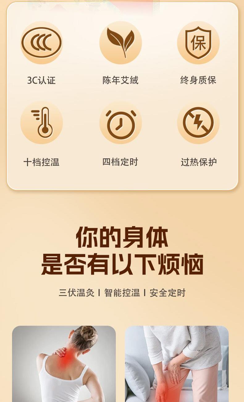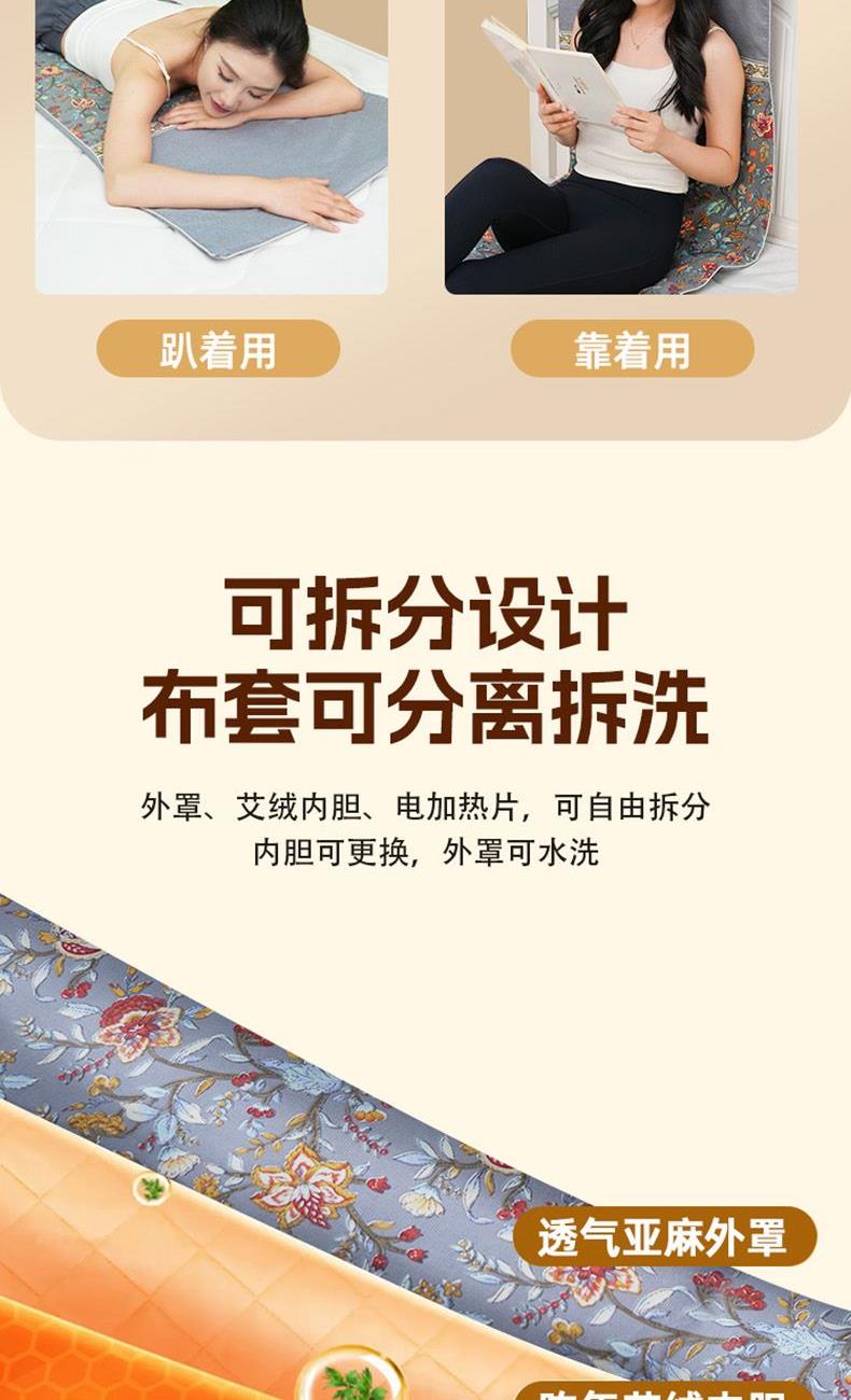 产品主题:不内卷 躺着赢 礼盒规格:600*420*125mm 产品配置:艾绒床垫*1套(含布套、加热芯、艾绒垫、 开关) 精美礼盒*1个 产品尺寸:1500-600mm 产品卖点: 1、电热温灸艾绒床垫是高科技电子艾灸产品,无火无烟艾灸,易操作,使用安全,效果好。 2、老粗布拼接床垫,撞色时尚。 3、艾绒垫填充陈艾绒为主的多味中草药,排湿除寒,疏经通络,改善亚健康。 4、超大国潮风礼盒,送礼有面子。 5、送健康好礼,享躺赢人生。