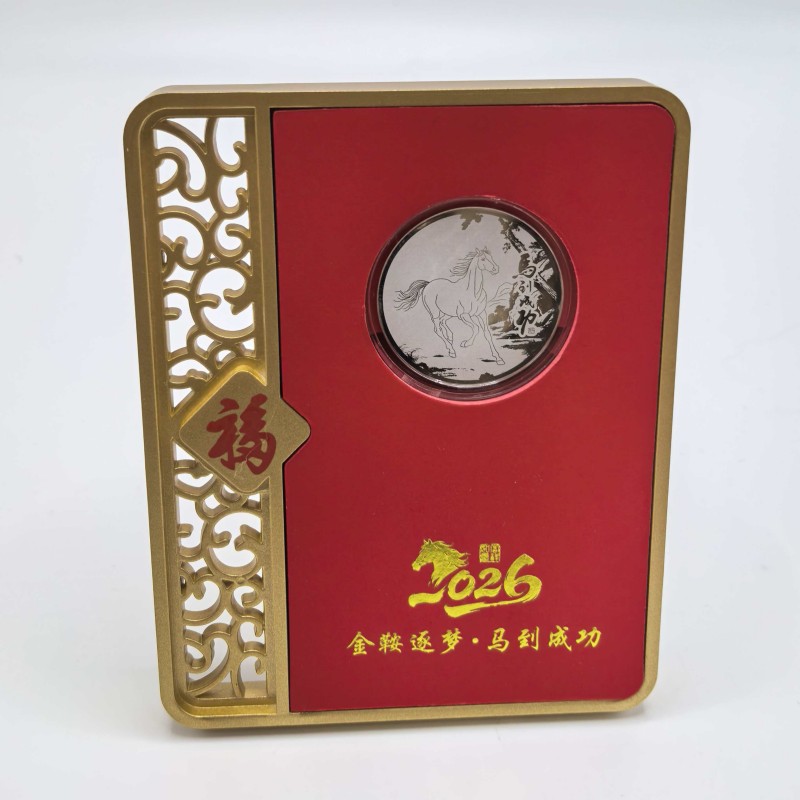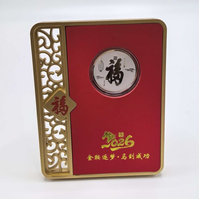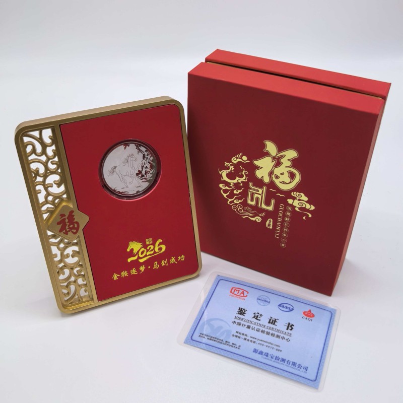 材质:足银999 产品规格:100*127*13mm 包装规格:110*40*138mm 银章规格35mm 以999纯银精铸,银章上骏马腾跃山水间,象征「金鞍逐梦」的奋进精神!镶嵌于赤红底台,边框环绕,镂空福纹点缀,搭配倒福牌饰,尽显东方祥瑞之气。 「福」字礼盒配权威鉴定证书,双证保障品质。2026马年专属印记,赠予挚友、长辈或商界伙伴,寓意马到成功、福泽万家,是新春、佳节、庆典的尊贵之选!