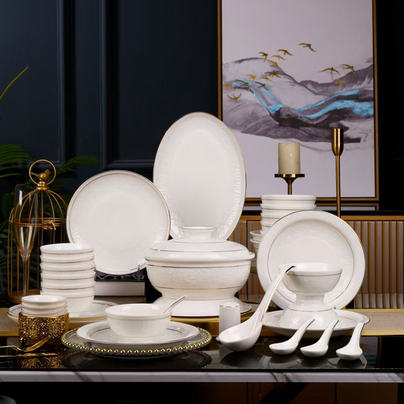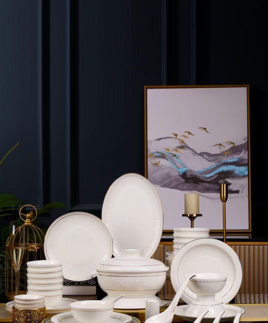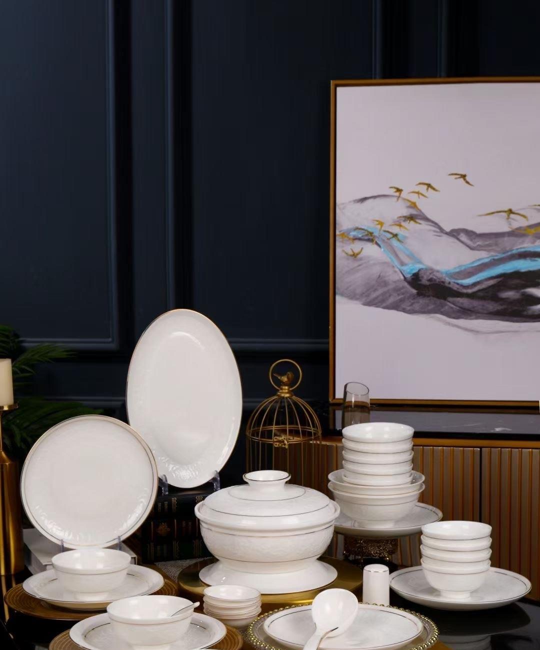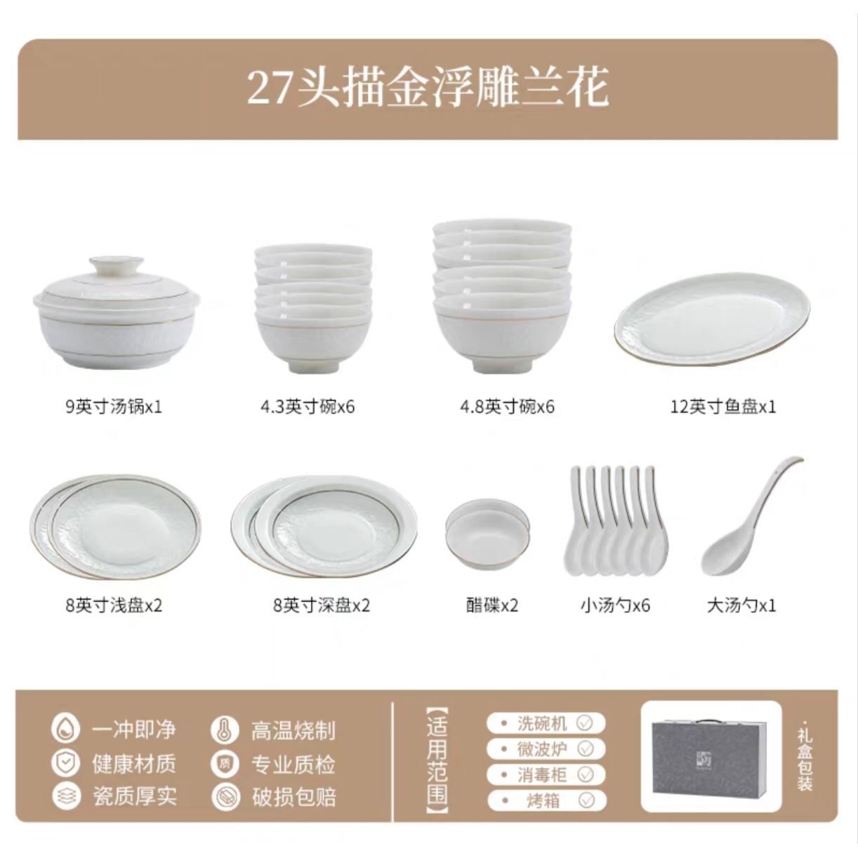 尾桥下窑羊脂玉瓷浮雕玉兰27头餐具套装白瓷描金年会节日伴手礼
