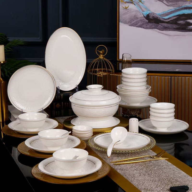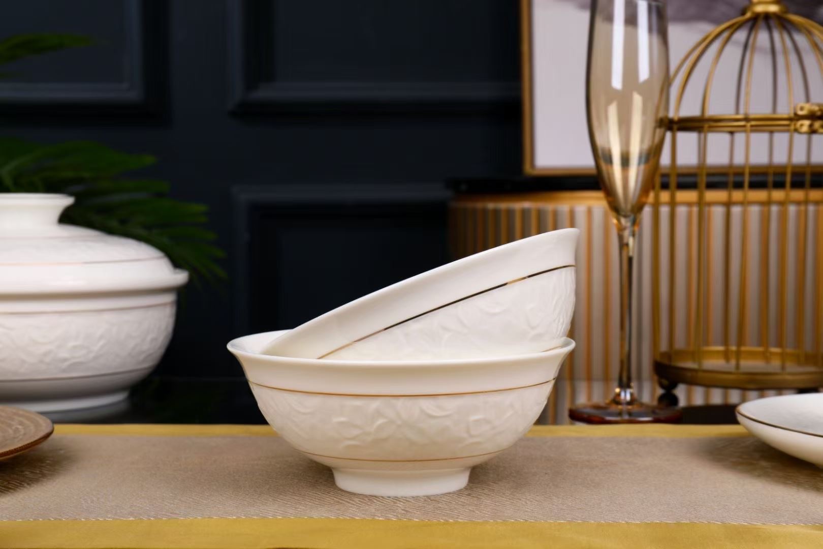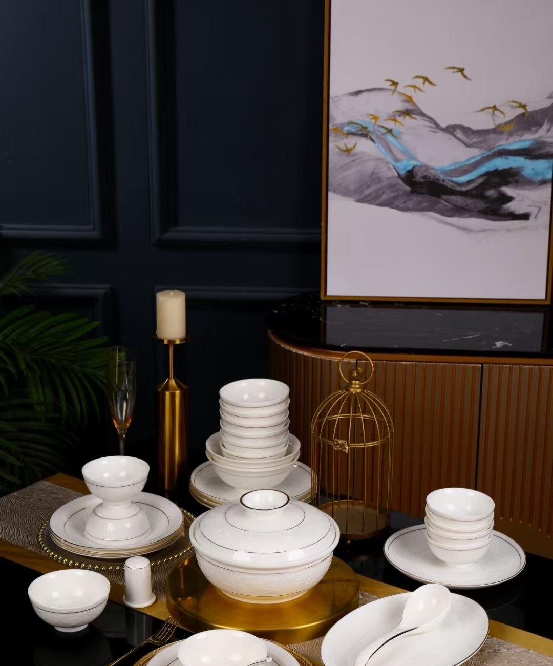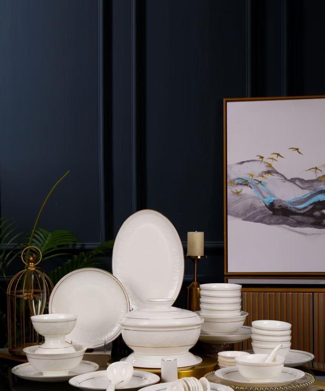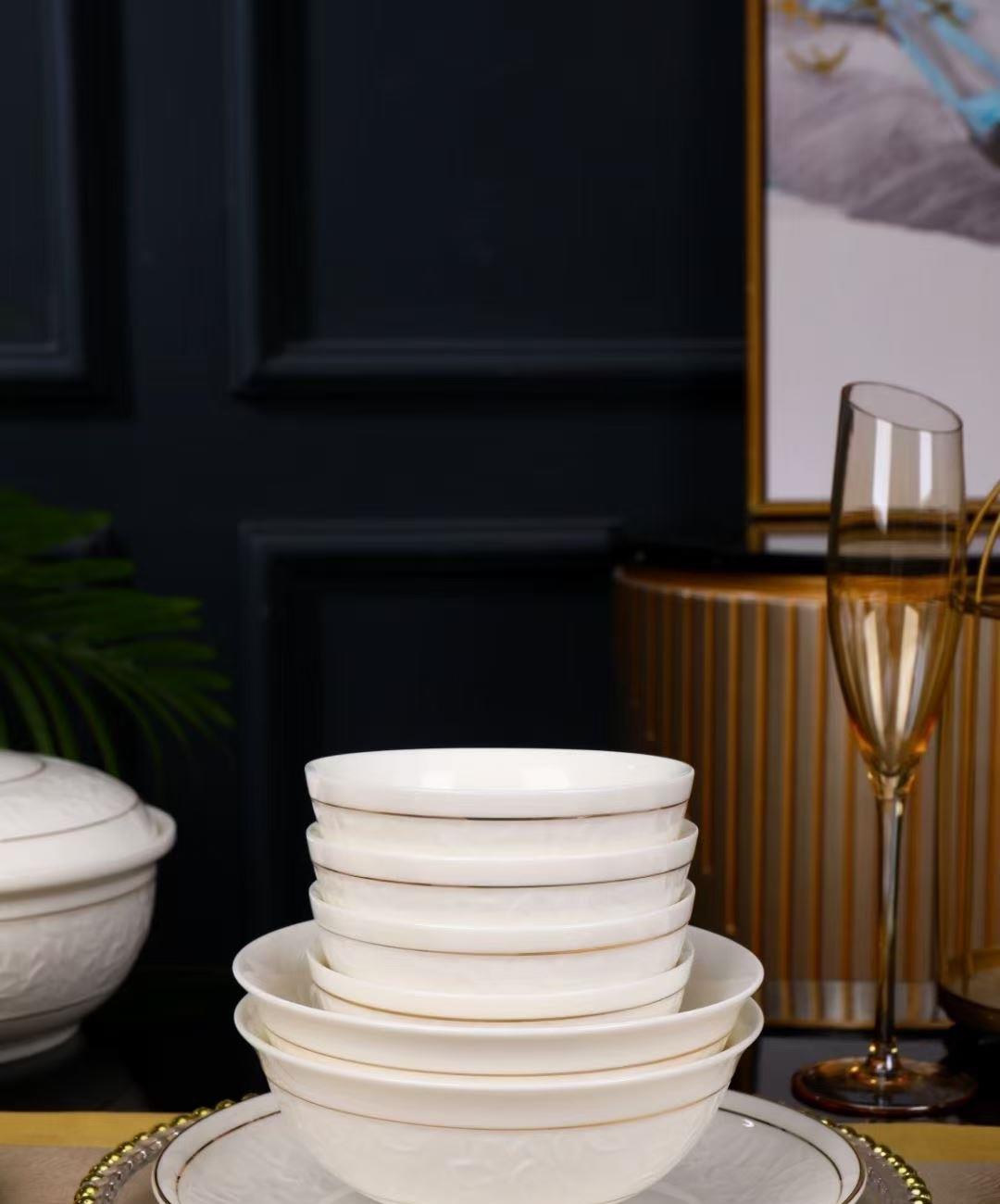 尾桥下窑羊脂玉瓷浮雕玉兰27头餐具套装白瓷描金年会节日伴手礼