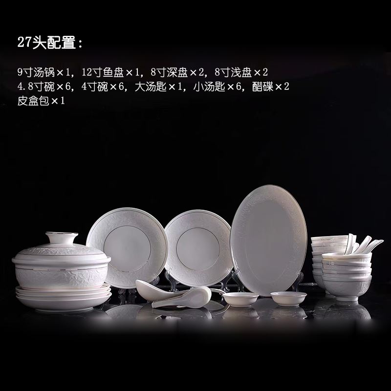 27头配置: 9寸汤锅×1, 12寸鱼盘×1, 8寸深盘×2, 8寸浅盘×2, 4.8寸碗×6, 4寸碗×6, 大汤匙×1, 小汤匙×6, 醋碟×2, 皮盒包×1。