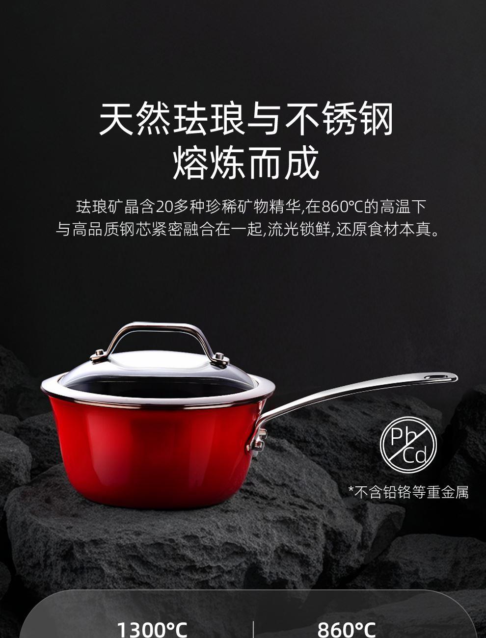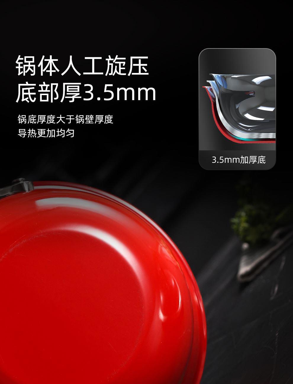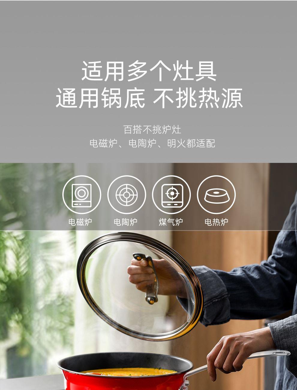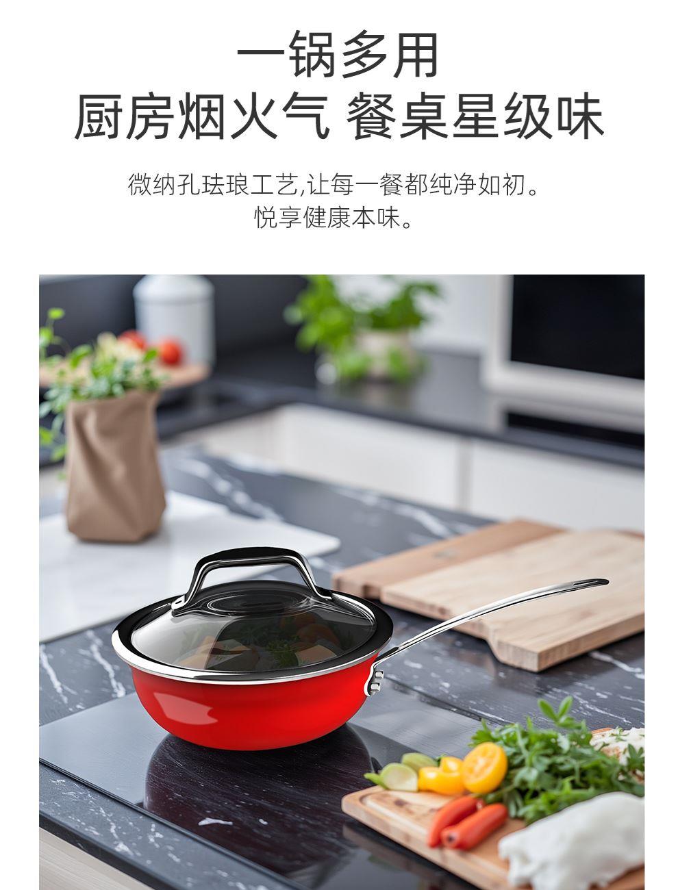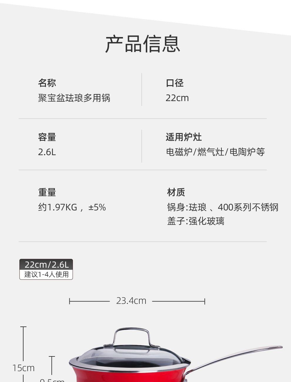 产品容量:2.6L 产品尺寸:410*255*160mm 产品颜色:红色 产品材质: 锅身:珐琅、400系列不锈钢 把手:201不锈钢 盖子:强化玻璃 1、德国进口珐琅与不锈钢,健康安心; 2、锅身一体成型,清洁无负,担一抹即净,可视化锁鲜锅盖,烹饪进程一目了然; 3、一锅多用,精煮善炖,全灶具通用,锅底不挑热源。