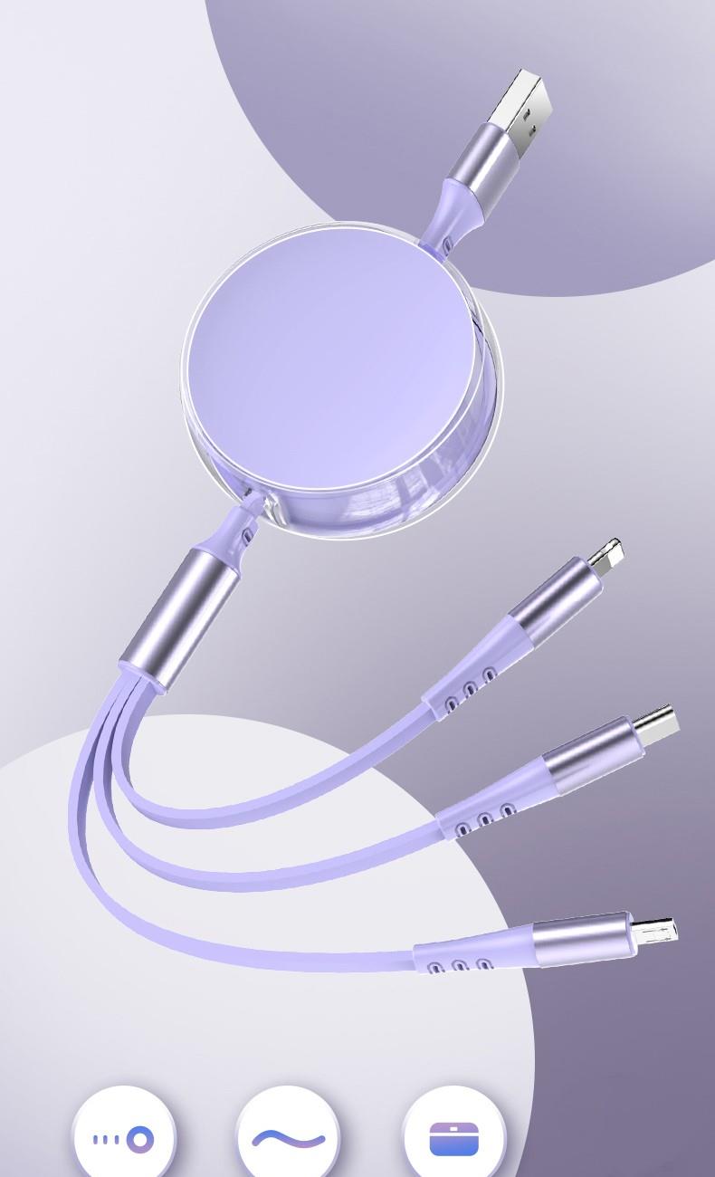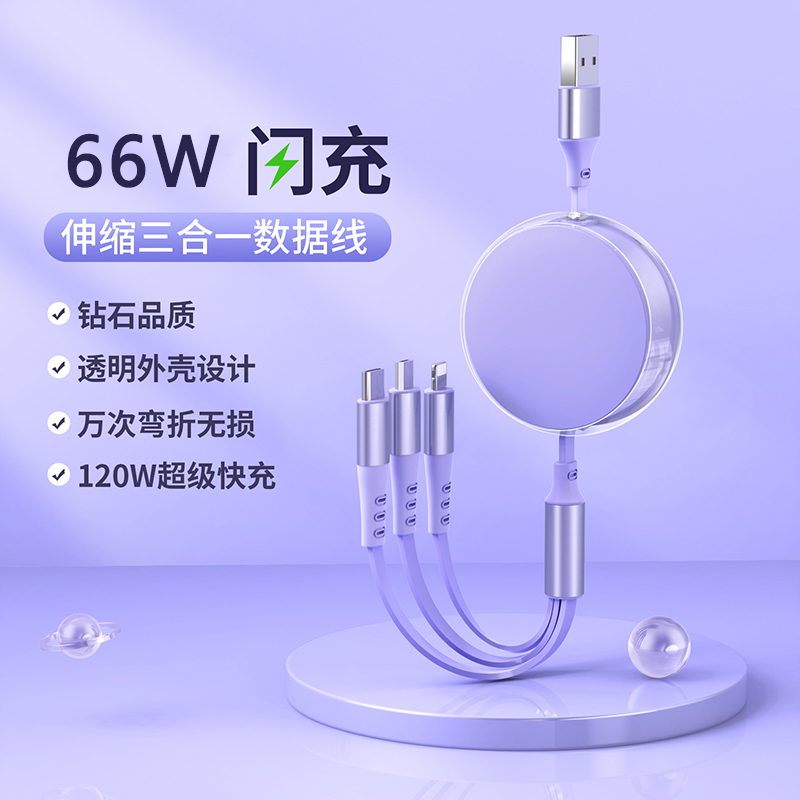 66W超级快充,马卡龙配色 三种接口满足各种手机 1.2米长度设计,使用方便 TPE材质耐用,不易折断 五档伸缩调节