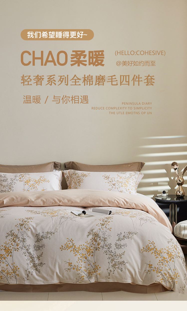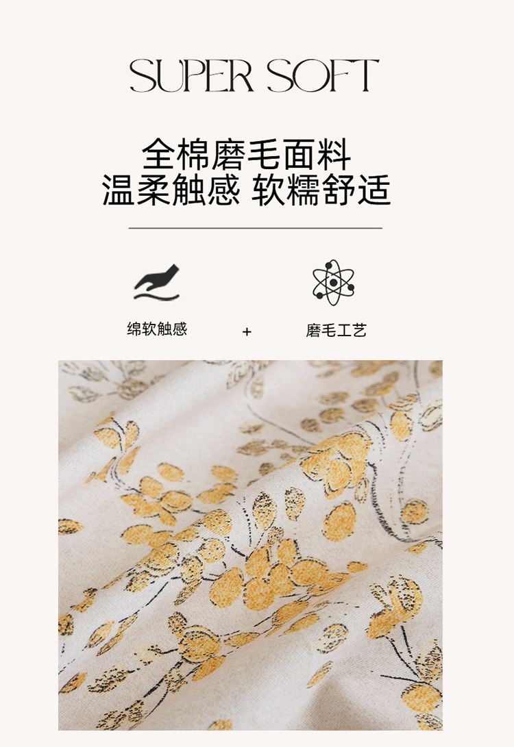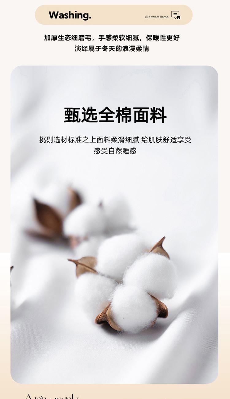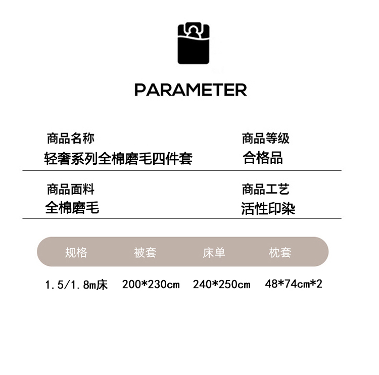 被套:200*230cm 床单:240*250cm 枕套:48*74cm*2 面料:全棉磨毛 ▶全棉磨毛,纤维柔长,绒毛更加丰盈密集,柔软细腻,亲肤呵护,保暖加倍。 ▶采用活性印染工艺,色彩靓玉,耐洗不易褪色,久用如新。