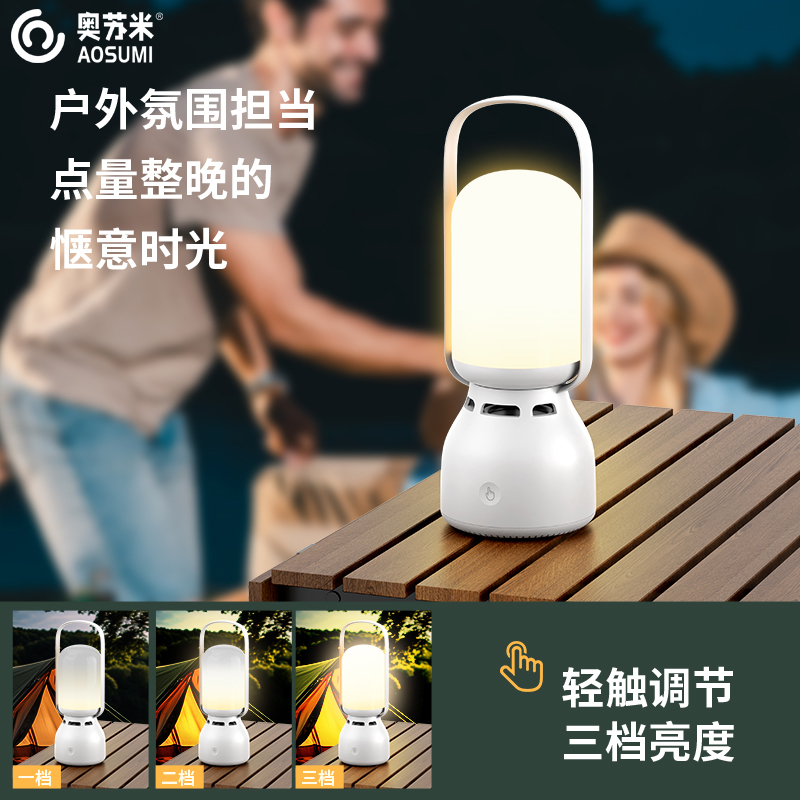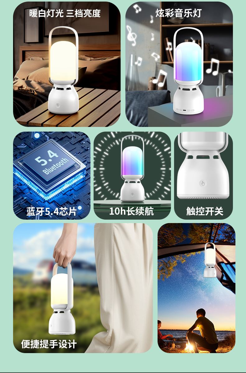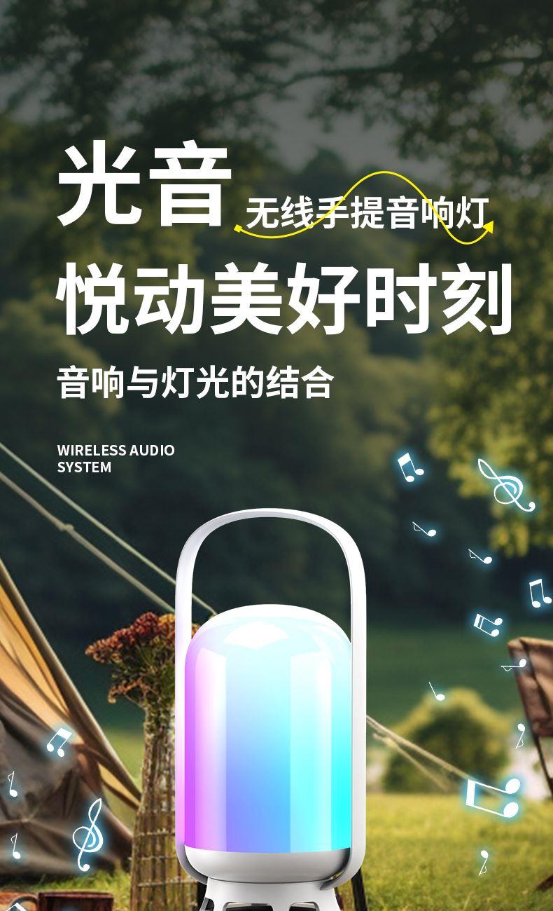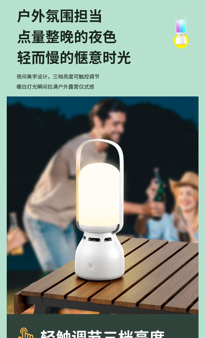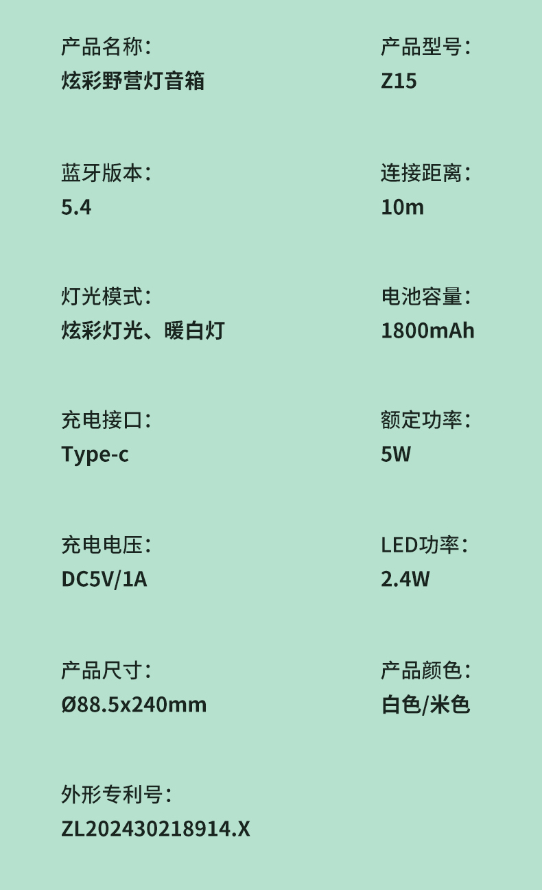 手提户外露营灯音箱 Z15 颜色:米色 白色 音响功率:5W 材质:ABS+PC 电池容量:1800毫安 尺寸:88.5*88.5*240mm 包装尺寸:90*90*250mm 包装:彩盒包装 【功能特点】: * 手提复古蓝牙音响续航久 * 幻彩光影:梦幻般的视觉盛宴 * 柔和暖光:温暖柔和的灯光设计 * 触控调光:三档亮度调节
