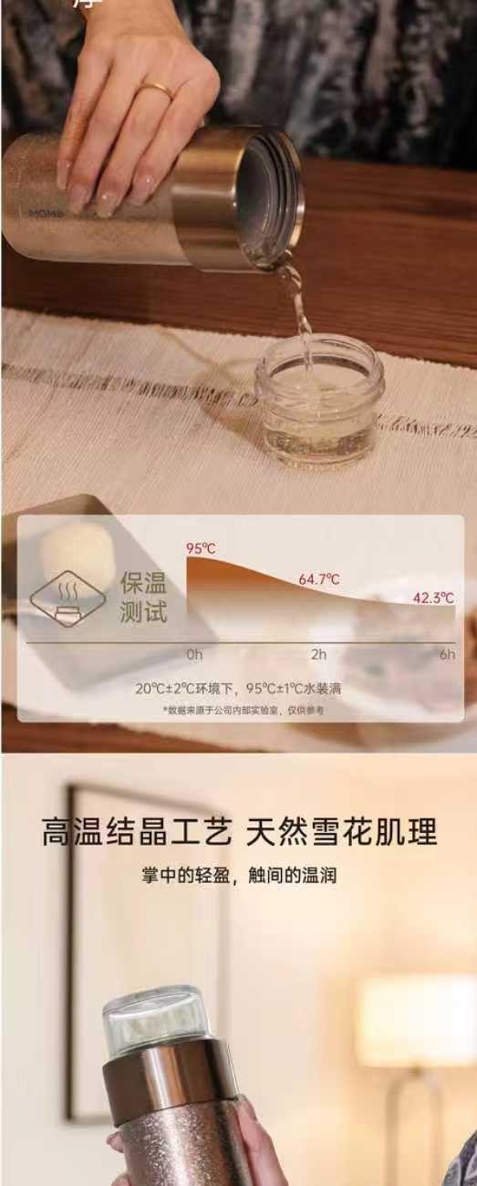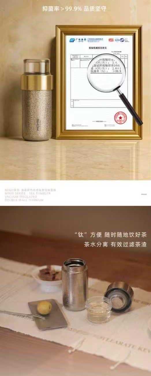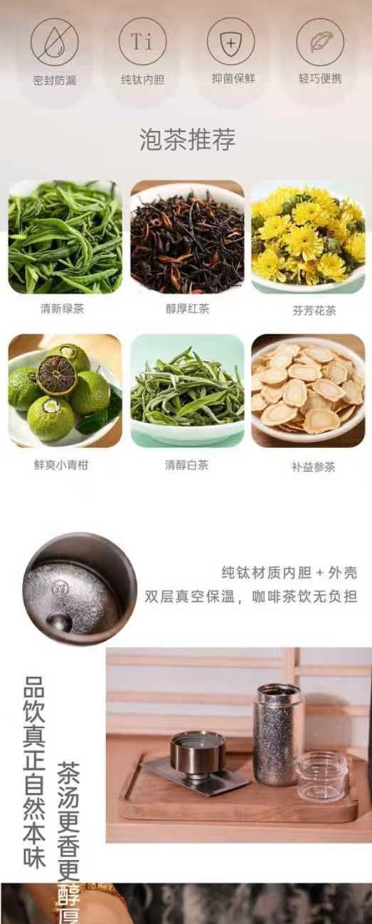 产品材质:纯钛(含钛99%以上)杯体内胆-钛TA1杯体外壳-钛TA1中盖金属圈-奥体304不锈钢中盖茶隔-钛TA1中盖盖体-食品接触用PP上盖茶仓-Tritan(改性PCT)