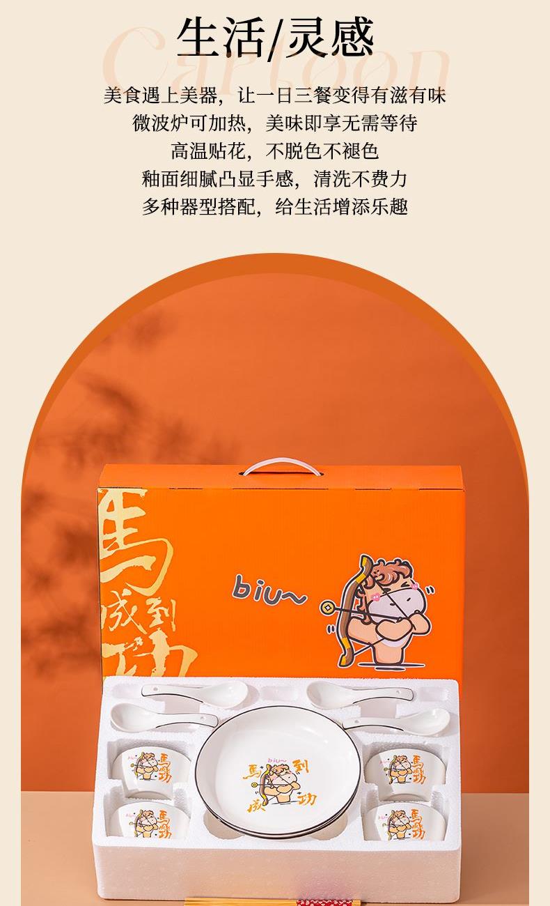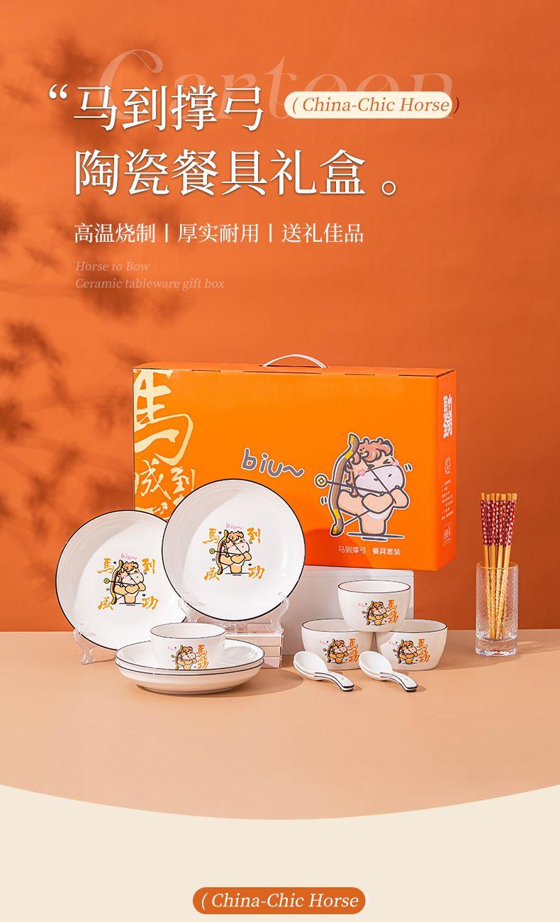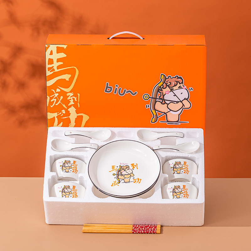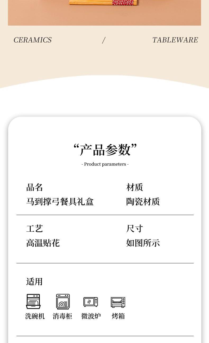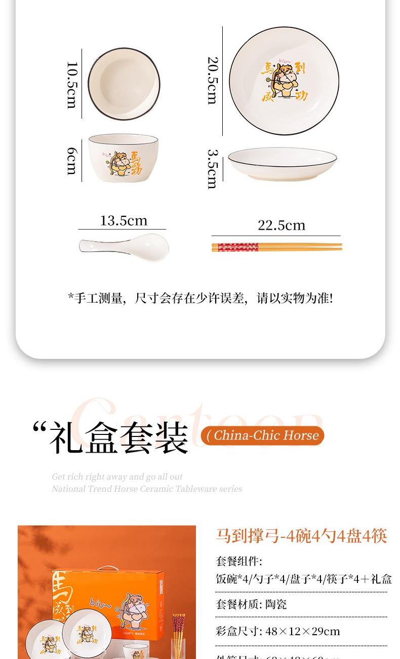 产品组成:整套=4碗4勺4筷4盘 产品材质:强化瓷 产品规格:陶瓷碗=口径10.5cm,高度6cm;盘子直径20.5cm, 高3.5cm;三弯勺=长13.5cm;筷子22.5cm; 彩盒尺寸:48×12×29cm 外箱毛重:30kg 外箱尺寸:68×48×60cm --------------- 马到撑弓,事事成功 喜欢这种把祝福藏进小细节里的感觉!小马到撑弓的憨劲,小萌马攥着劲拉弓的样子,连箭尖都像带着“能成”的底气。加上“马到撑弓 事事成功”这八个字,不管是贴在心里当念想,还是说给身边人听,都像在说“别怕用力,你想成的事,都会顺着这股劲成了”,简单却特别戳心。新的一年都能跟着这股攒劲的劲儿,件件成、事事顺。