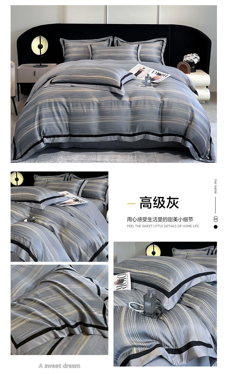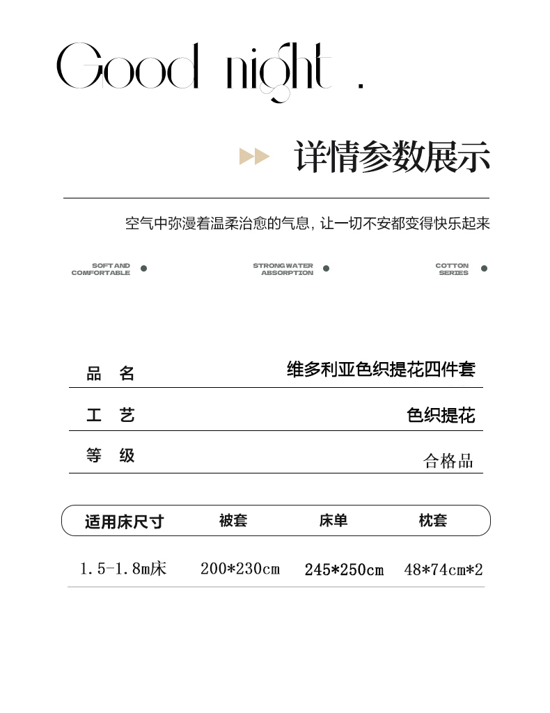 被套:200*230cm 床单:245*250cm 枕套:48*74cm*2 面料:色织提花 产品包装:精美礼盒 包装尺寸:43.5*33*10cm 1.色织提花质地柔软、细腻、爽滑,悬垂性及透气性好。 2.色织提花用于经典款式,更耐看,不易过时。