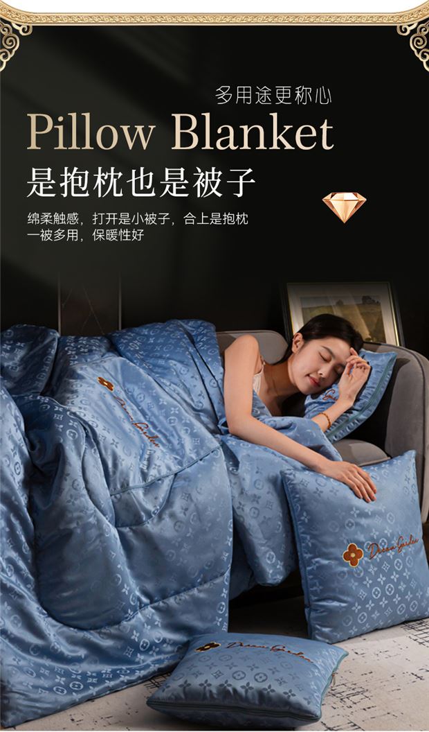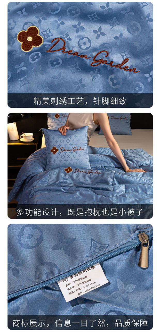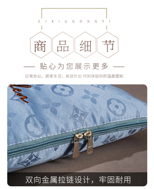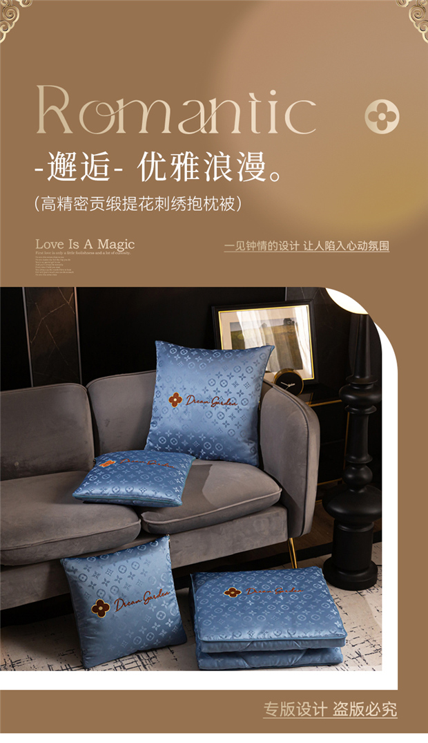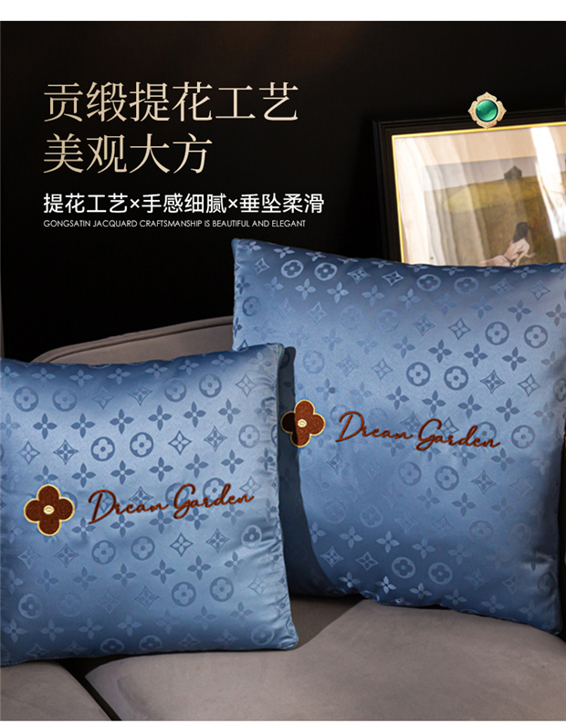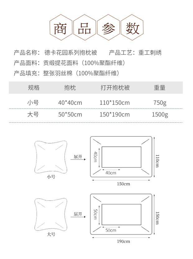 面料:贡缎提花 填充:整张羽丝棉 工艺:重工刺绣 尺寸:40*40cm 打开110*150cm 细腻柔软,亲肤柔和,跃然指尖的艺术美感!填充物采用高弹整张羽丝棉,持久使用不塌陷,经久耐用不变形!