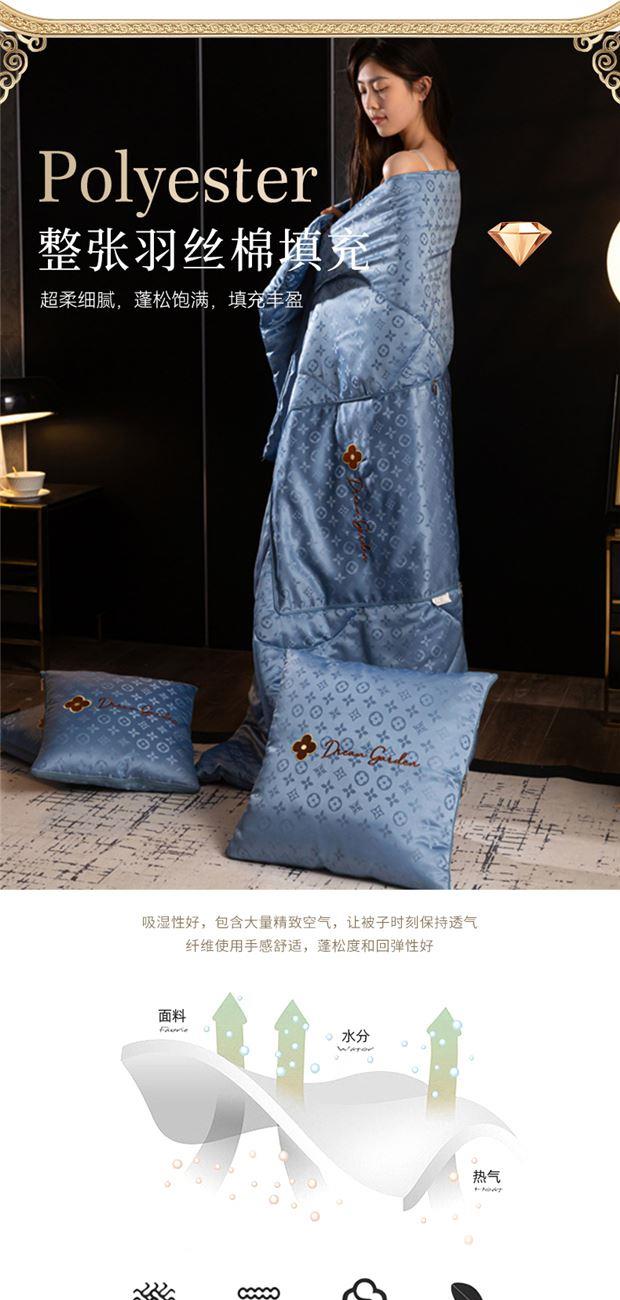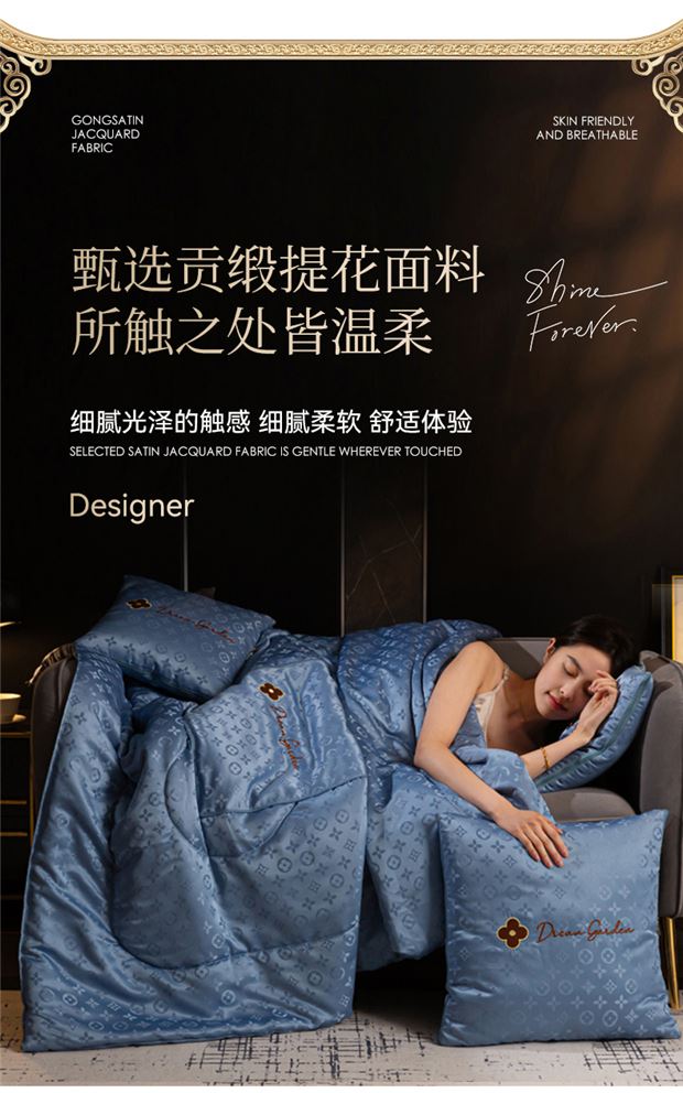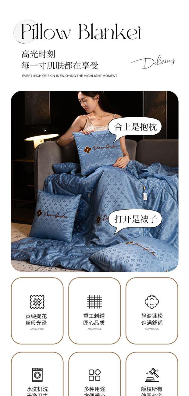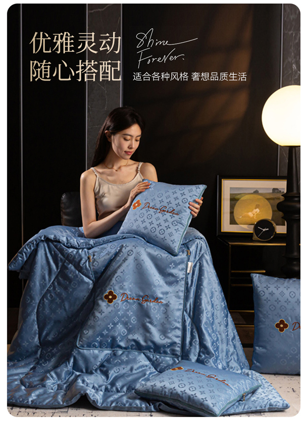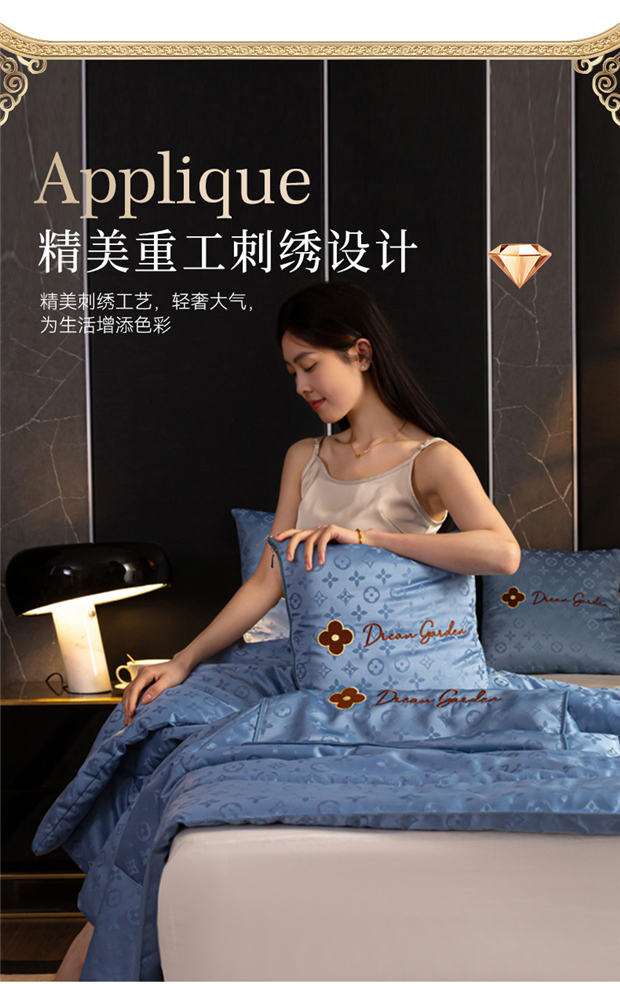 面料:贡缎提花 填充:整张羽丝棉 工艺:重工刺绣 尺寸:40*40cm 打开110*150cm 细腻柔软,亲肤柔和,跃然指尖的艺术美感!填充物采用高弹整张羽丝棉,持久使用不塌陷,经久耐用不变形!