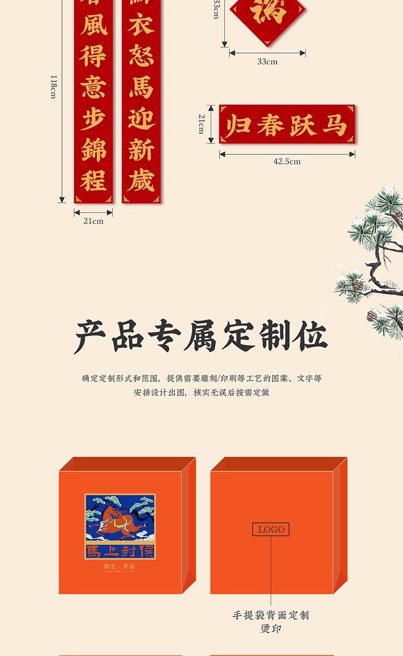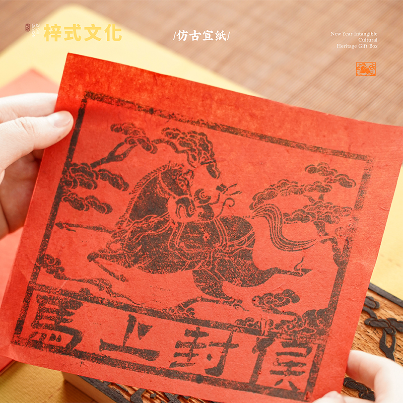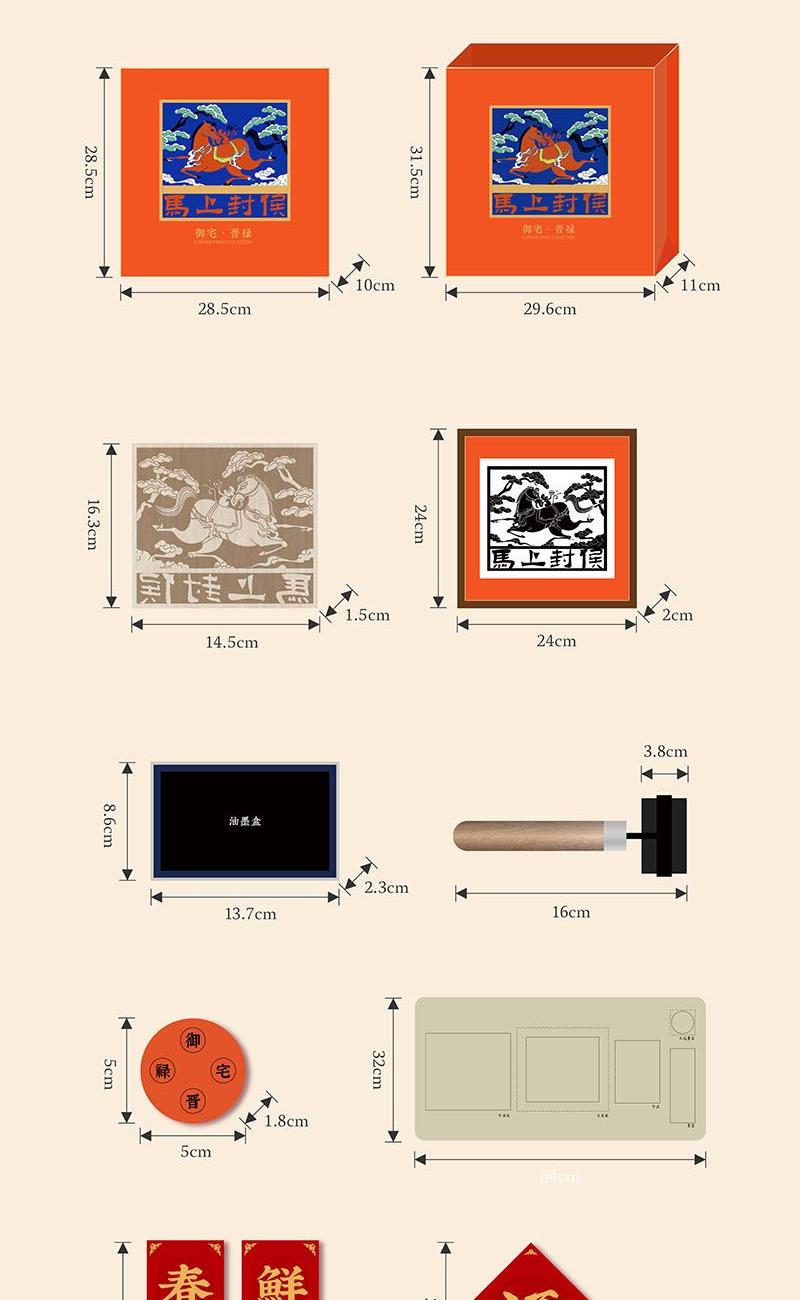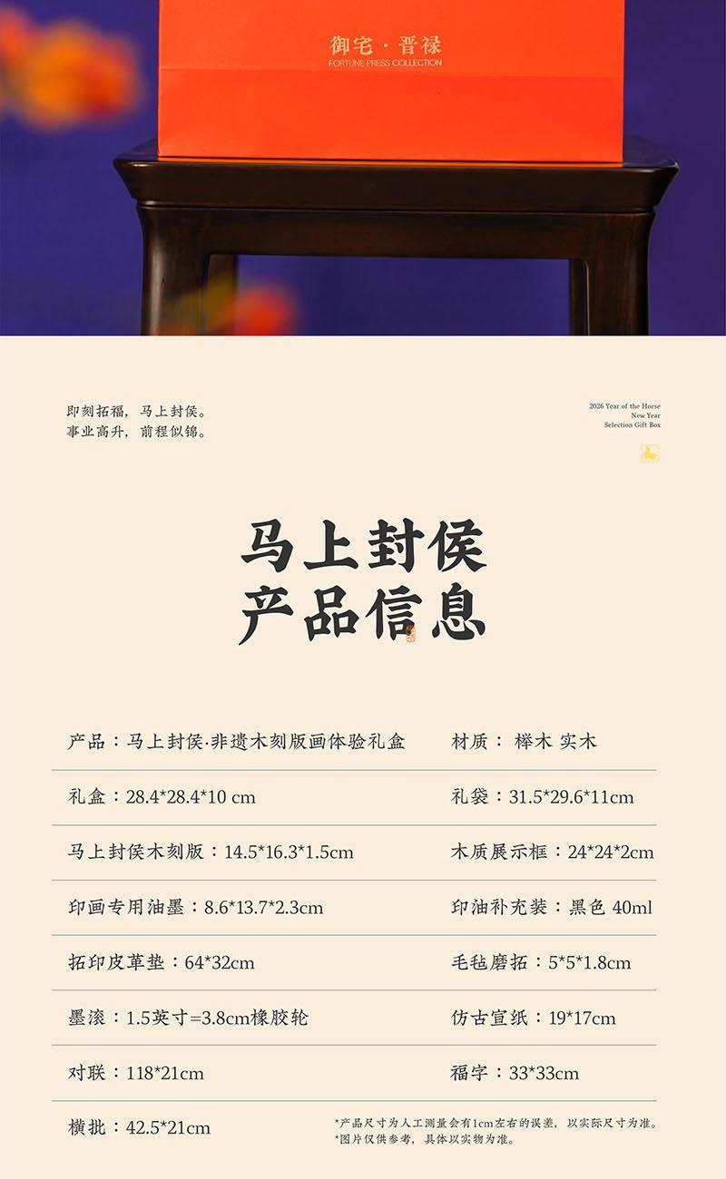 礼盒清单 马上封侯木刻版*1 实木相框*1 拓印皮革垫*1 印台*1 印油补充装*1 仿古宣纸*3色计18张 马年春联*1 礼盒*1 礼袋*1 产品信息 产品 / Product Mini 马上封侯·非遗木刻版画体验礼盒 材质 / Material 榉木 实木 规格 / Size 礼盒:28.4*28.4*10 cm 礼袋:31.5*29.6*11cm 木质展示框:24*24*2cm 印画专用油墨:8.6*13.7cm 印油补充装:黑色 40ml 仿古宣纸:19*17cm 拓印皮革垫:64*32cm 毛毡磨拓:5*5*1.8cm 墨滚:1.5英寸=3.8cm橡胶轮 对联:118*21cm 横批:42.5*21cm 福字:33*33cm *产品尺寸为人工测量会有1cm左右的误差,以实际尺寸为准