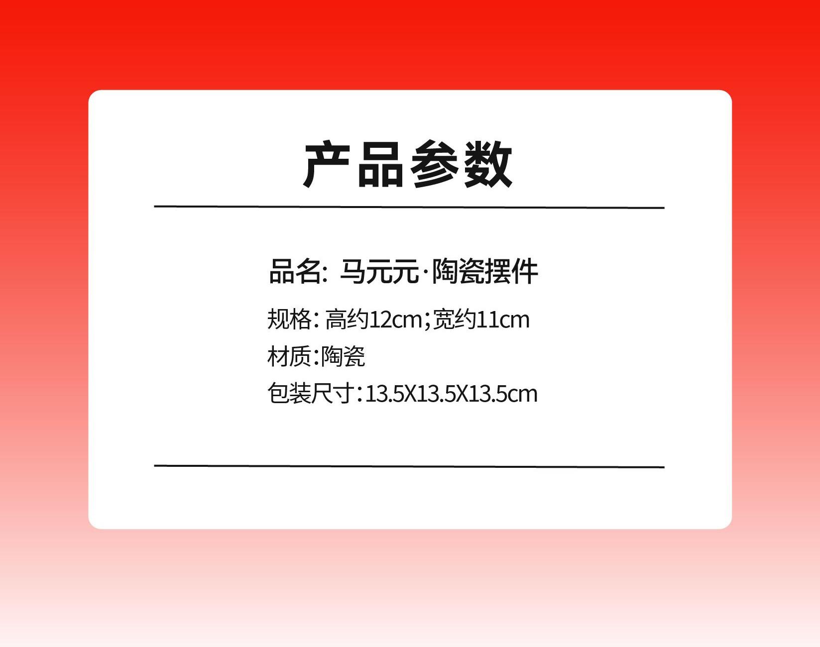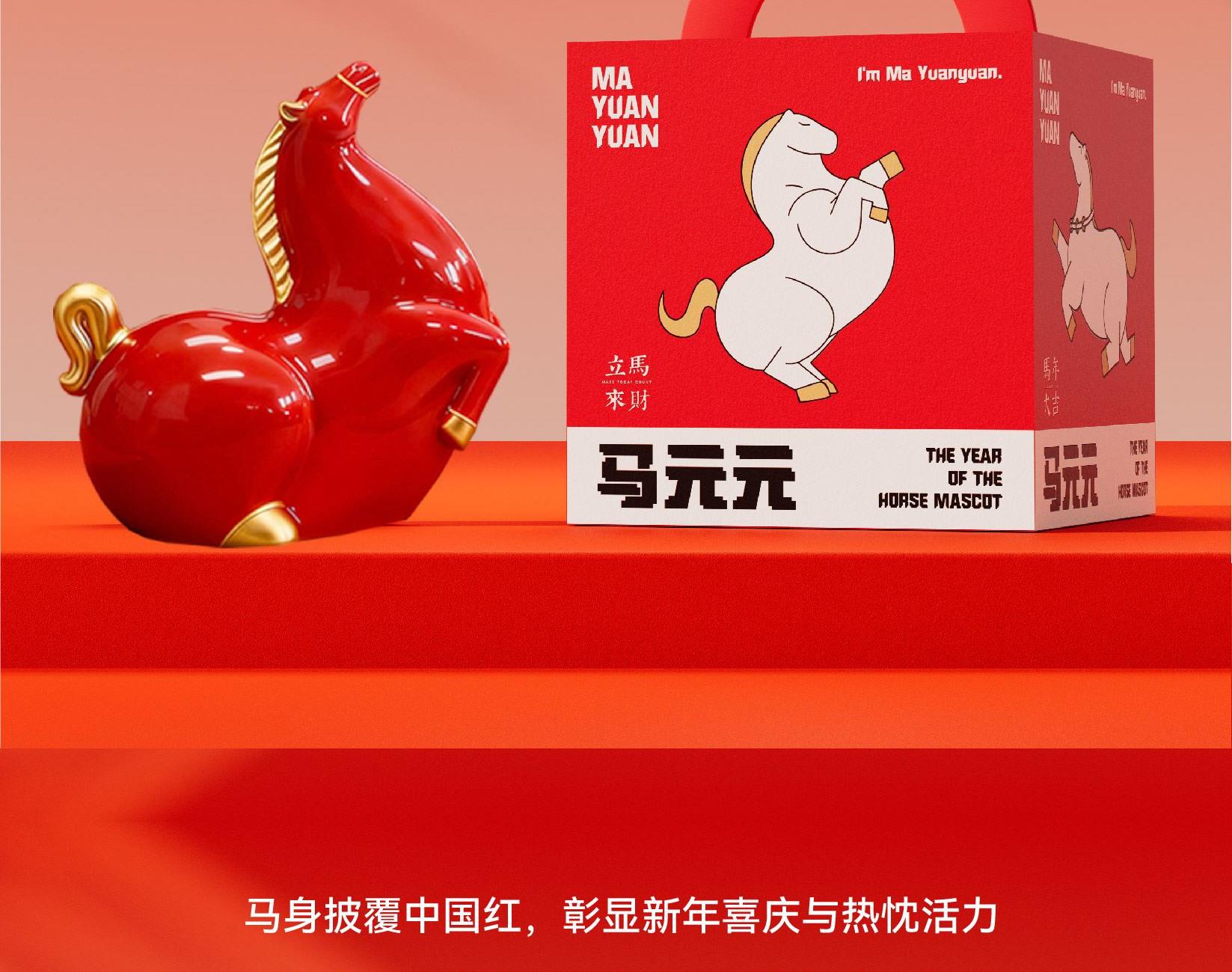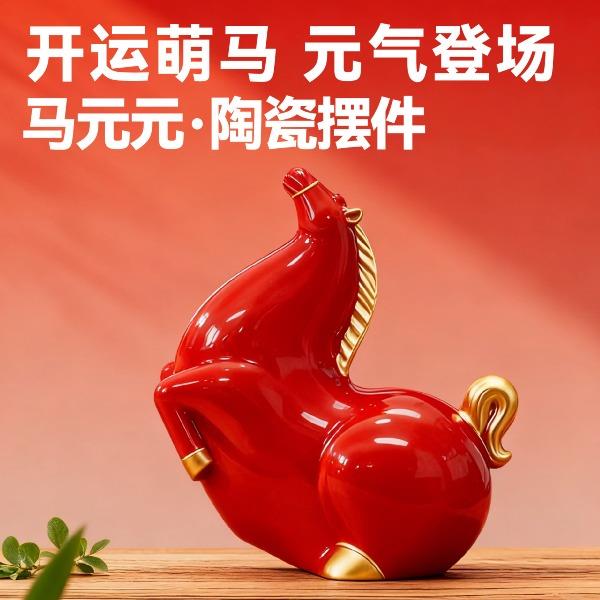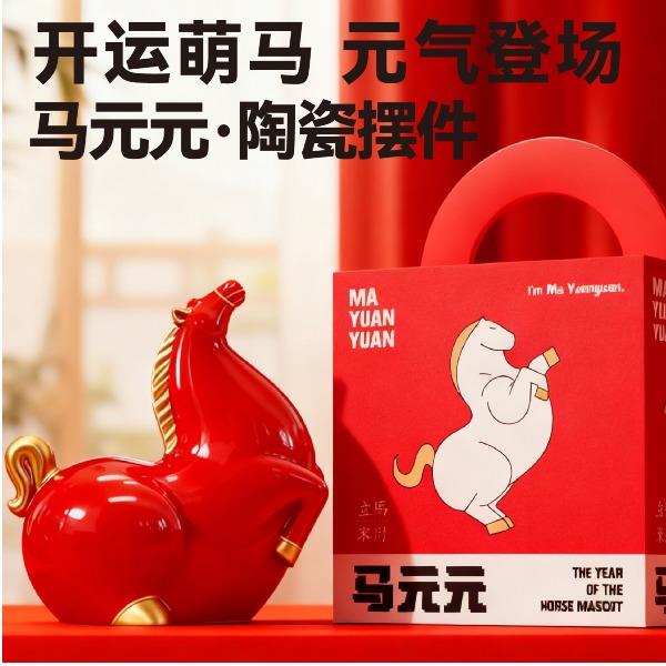 马身披覆中国红,彰显新年喜庆与热忱活力,局部点缀璀璨金,马蹄踏金,象征前程坚实;马尾熔金,寓意财富汇聚。 其名“马元元”,巧妙融合“元宝”的财运愿景与“元”字所代表的开端、本源与元气,寄愿新的一年:生活富足安康,事业一马平川,开启富足丰饶的新篇章。 规格: 高约12cm;宽约11cm 材质:陶瓷 包装尺寸:13.5✘13.5✘13.5cm
