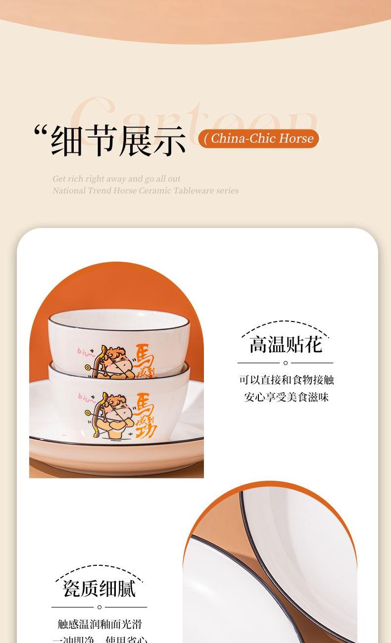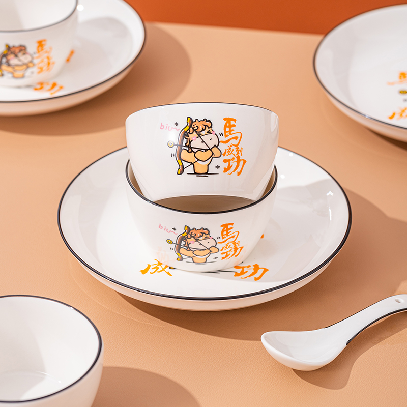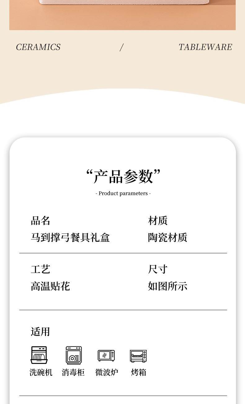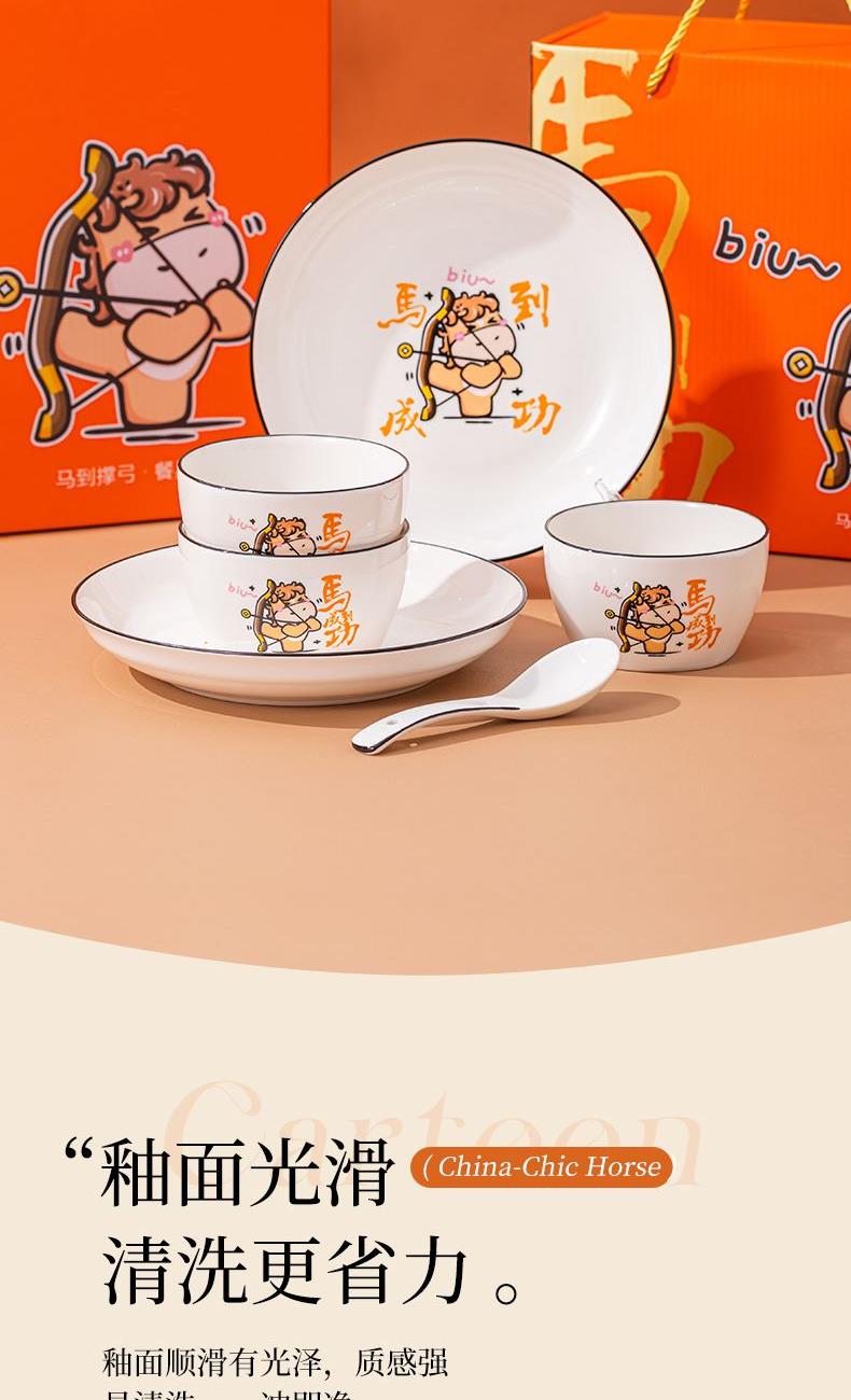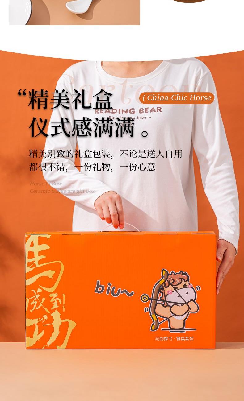 产品组成:整套=6碗6勺2盘 产品材质:强化瓷 产品规格:陶瓷碗=口径10.5cm,高度6cm;盘子直径20.5cm, 高3.5cm;三弯勺=长13.5cm 彩盒尺寸:48×12×29cm 外箱毛重:27公斤 外箱尺寸:68×48×60cm ------------ 马到撑弓,事事成功 喜欢这种把祝福藏进小细节里的感觉!小马到撑弓的憨劲,小萌马攥着劲拉弓的样子,连箭尖都像带着“能成”的底气。加上“马到撑弓 事事成功”这八个字,不管是贴在心里当念想,还是说给身边人听,都像在说“别怕用力,你想成的事,都会顺着这股劲成了”,简单却特别戳心。新的一年都能跟着这股攒劲的劲儿,件件成、事事顺。