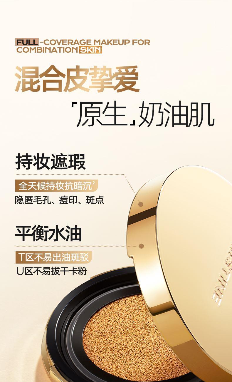 1.一拍遮瑕,高度服帖不假面,三段式遮瑕服帖 光感隐瑕:漫反射粉体,复配ANTIDARK-MICA 服帖遮瑕:亲肤氨基酸处理粉体,细腻贴肤 智能平瑕:大小粒径粉体组合,3D立体遮瑕,填平瑕疵不厚重,告别妆面斑驳 2.控油锁色,补妆不变色 三段式控油锁妆:控油+持色+平色差 3.妆养合一,带妆无负担 三维养肤,精华含量高达75%: 三重保湿(泛醇、水解胶原、4D玻尿酸)+舒缓(悦肤宁)+五重抗氧(依克多因、虾青素、生育酚乙酸酯、桃佗酚、肌肽)