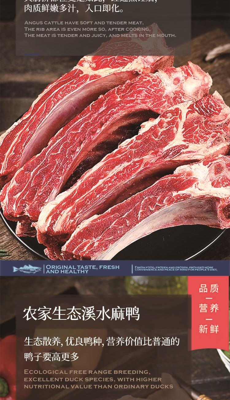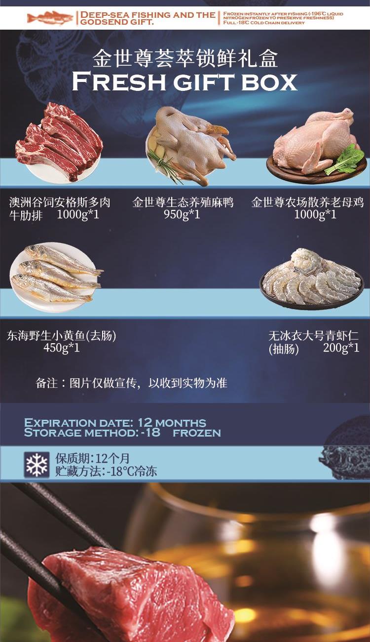金世尊X光明上海农场生态溪水麻鸭950g*1 金世尊X光明上海农场老母鸡1000g*1 澳洲谷饲安格斯多肉牛肋排1000g*1 无冰衣大号青虾仁(抽肠)200g*1 东海野生小黄鱼450g(去肠)*1 宅配到家服务