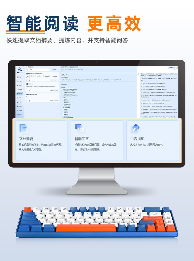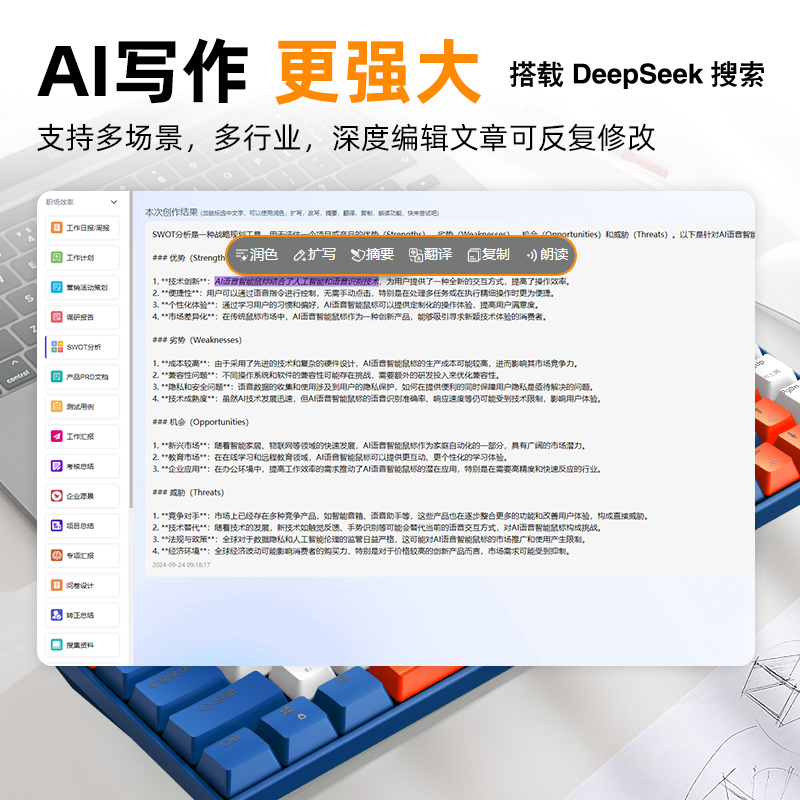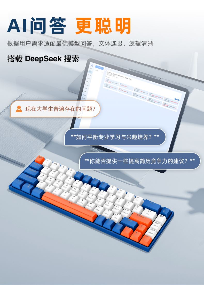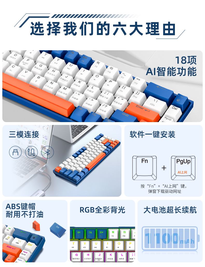 支持2.4G,有线,三蓝牙五台设备切换使用; 搭载四大AI模型,文心一言,KIMI,Deepseek,豆包等; 18项AI功能,超长电量使用时间,软件一键,不要。安装; 日常AI写作、PPT制作,aI设计绘画,智能阅读,文档转换,离线 高效出电商图等超强大功能 台式机,一体机,笔记本等多系统多种设备兼容; 对不起对