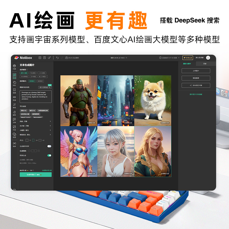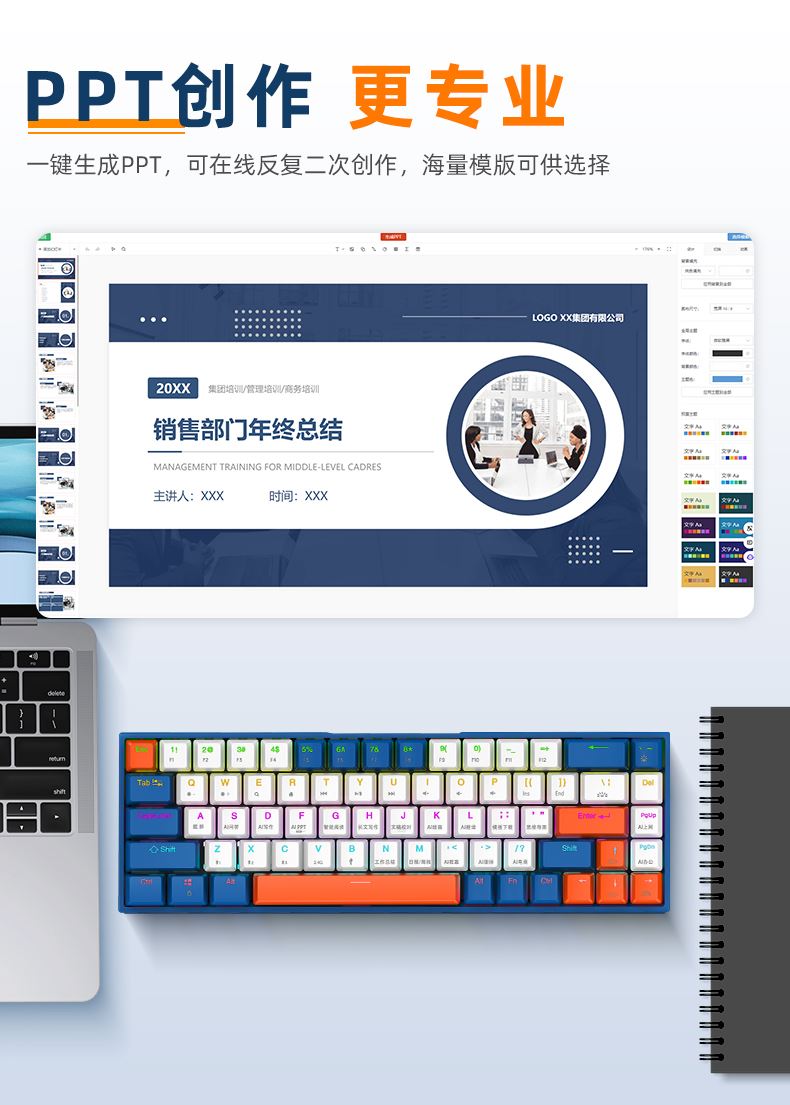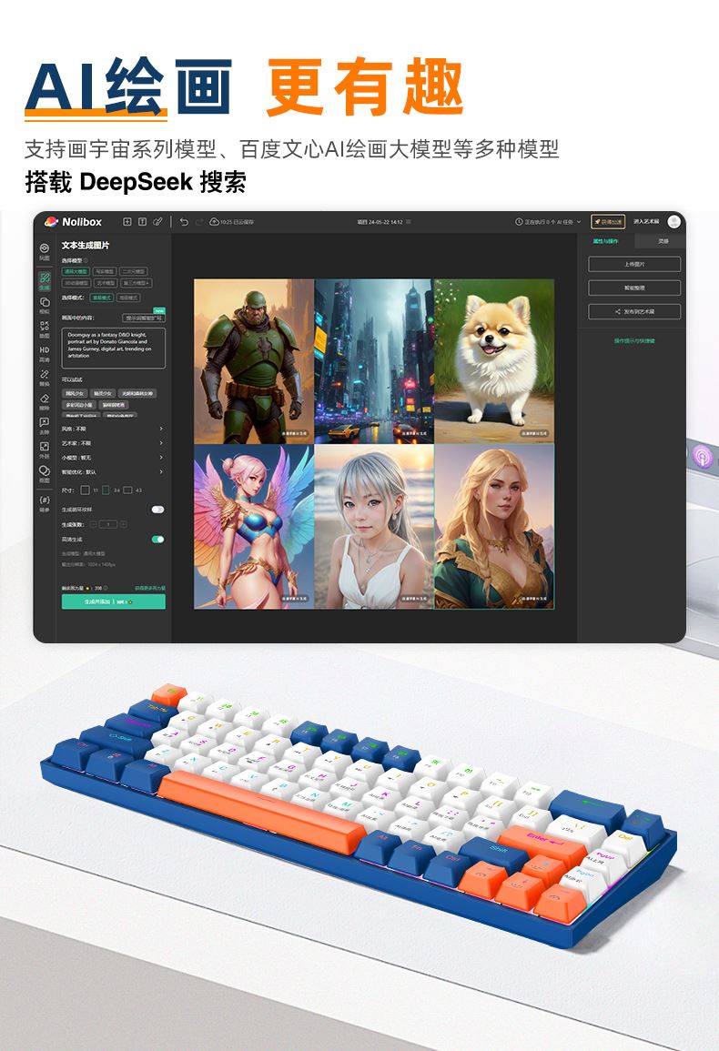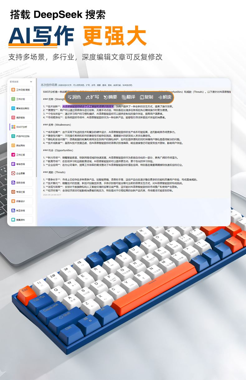 支持2.4G,有线,三蓝牙五台设备切换使用; 搭载四大AI模型,文心一言,KIMI,Deepseek,豆包等; 18项AI功能,超长电量使用时间,软件一键,不要。安装; 日常AI写作、PPT制作,aI设计绘画,智能阅读,文档转换,离线 高效出电商图等超强大功能 台式机,一体机,笔记本等多系统多种设备兼容; 对不起对