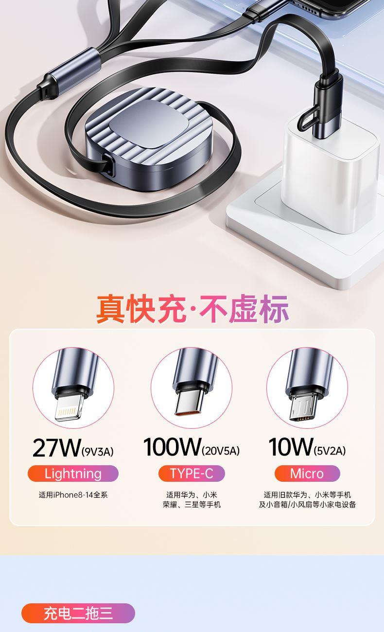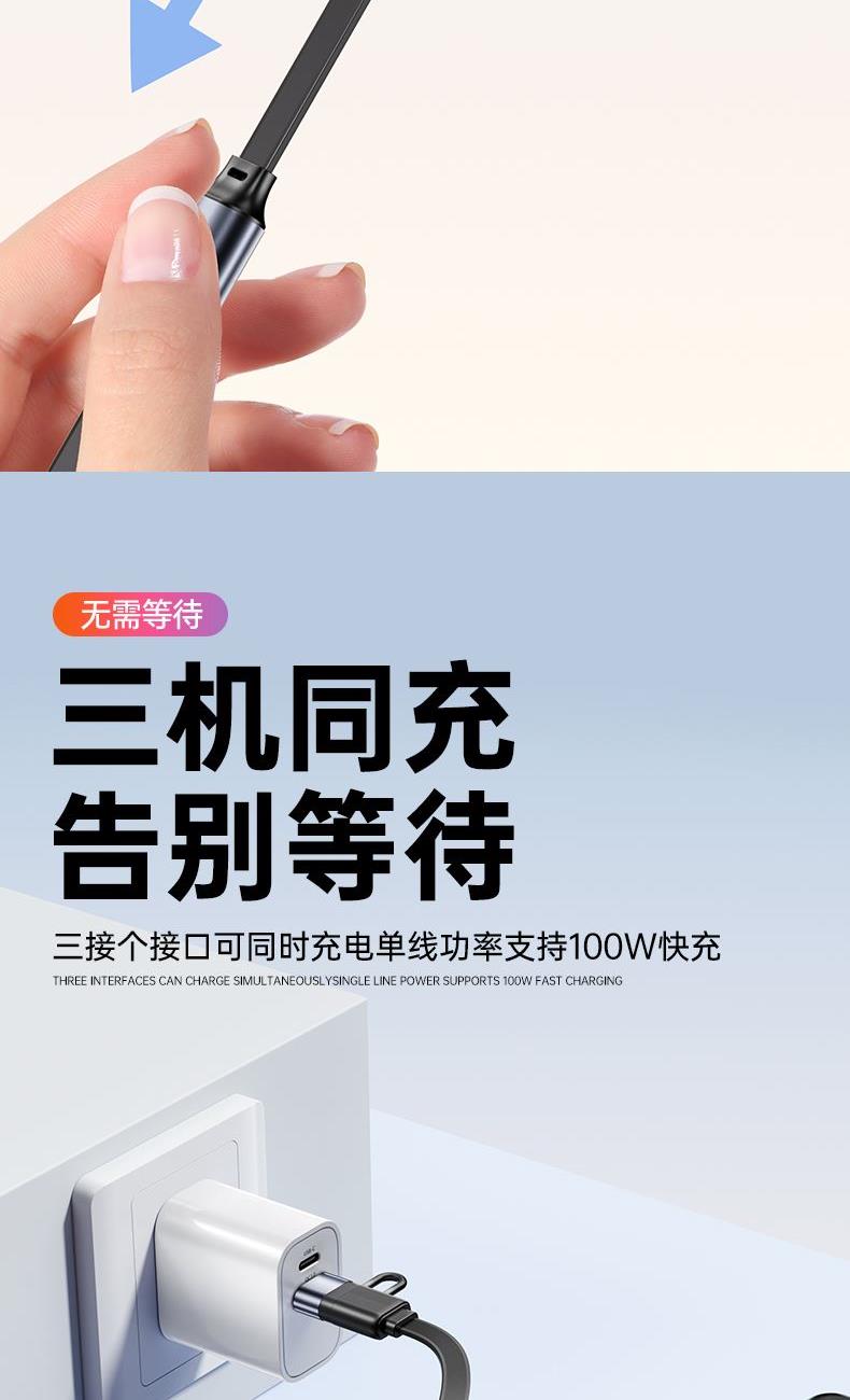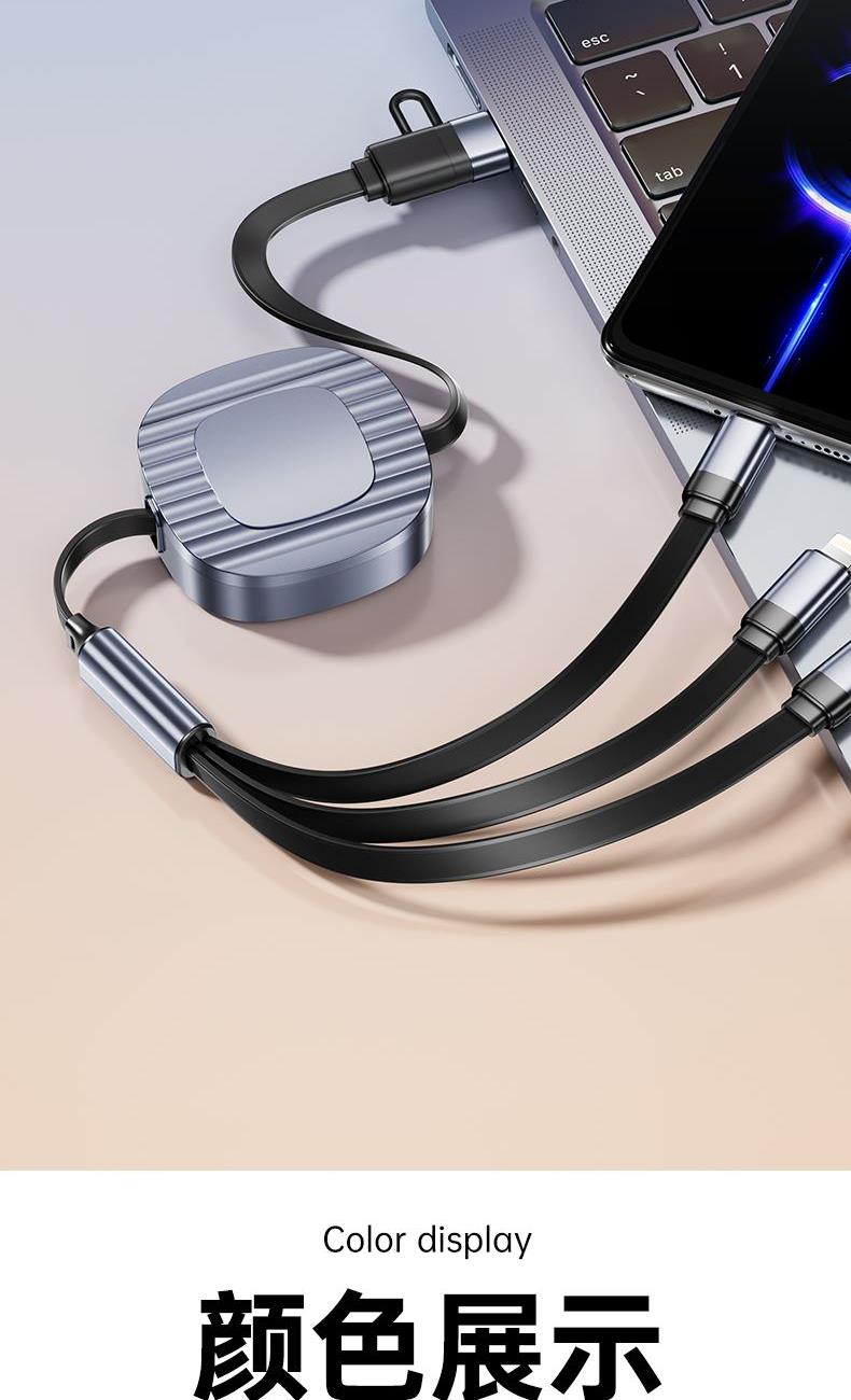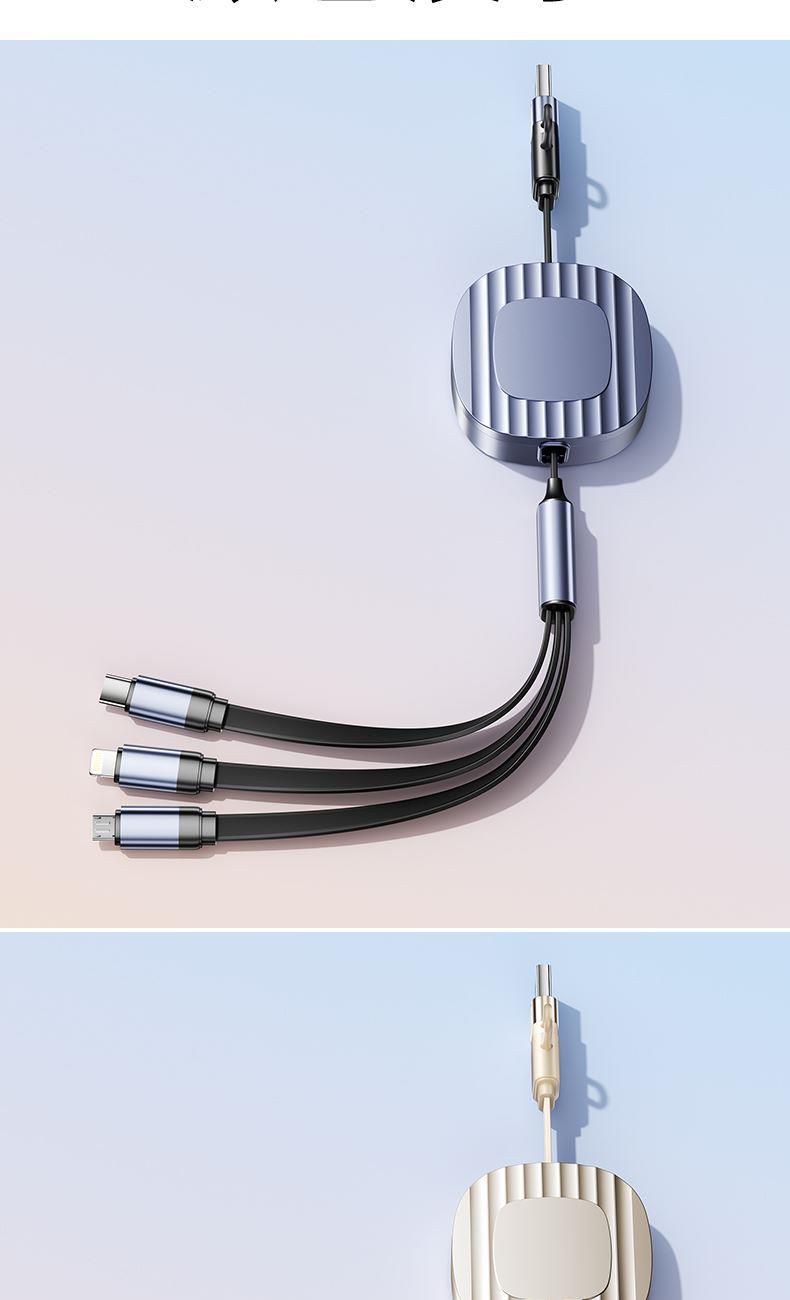 S15清雅100W快充伸缩数据线 颜色:金色 灰色 材质:TPE+ABS 尺寸:1.2M 包装:彩盒包装 【功能特点】: 二拖三伸缩设计,兼容苹果15系列 100W超级快充,充电更快 三种接口满足各种手机 1.2米长度设计,使用方便 TPE材质耐用,商务ABS面盖 五档伸缩调节 可充笔记本电脑