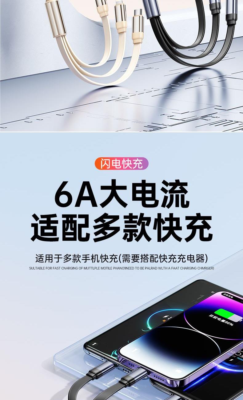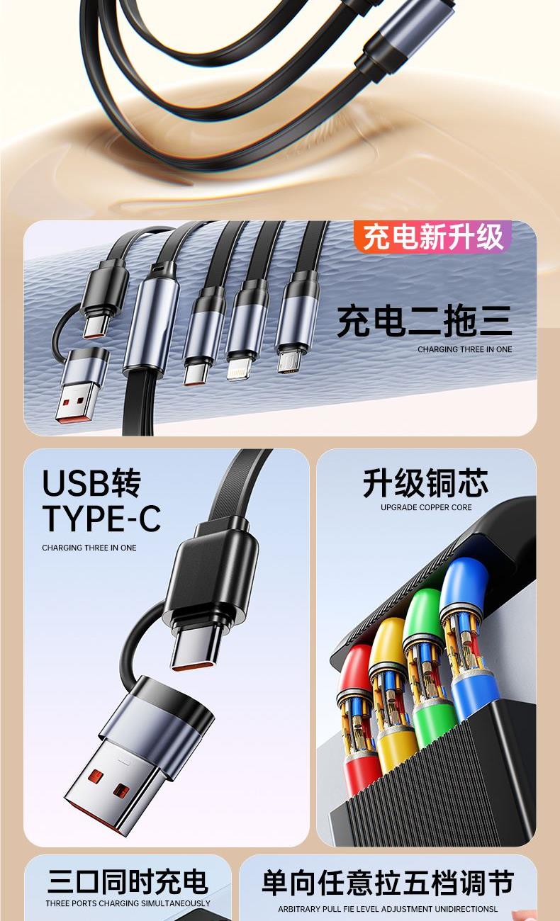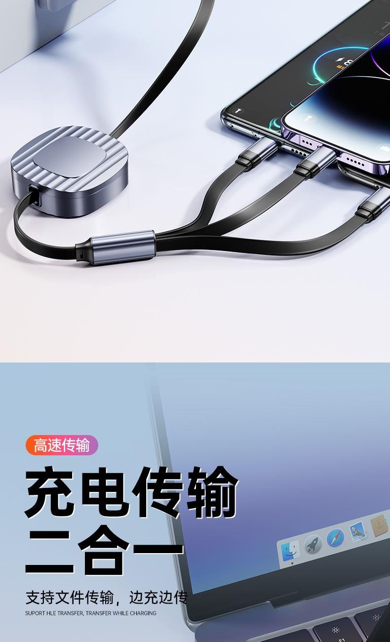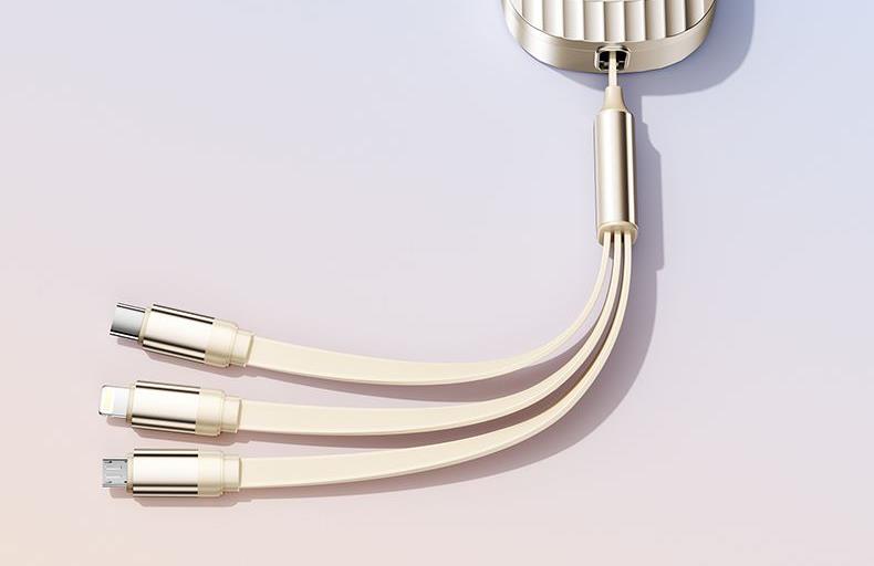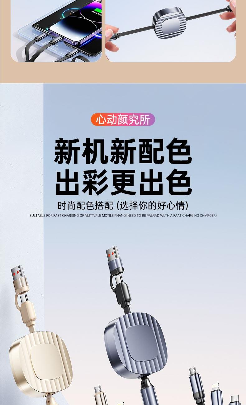 S15清雅100W快充伸缩数据线 颜色:金色 灰色 材质:TPE+ABS 尺寸:1.2M 包装:彩盒包装 【功能特点】: 二拖三伸缩设计,兼容苹果15系列 100W超级快充,充电更快 三种接口满足各种手机 1.2米长度设计,使用方便 TPE材质耐用,商务ABS面盖 五档伸缩调节 可充笔记本电脑