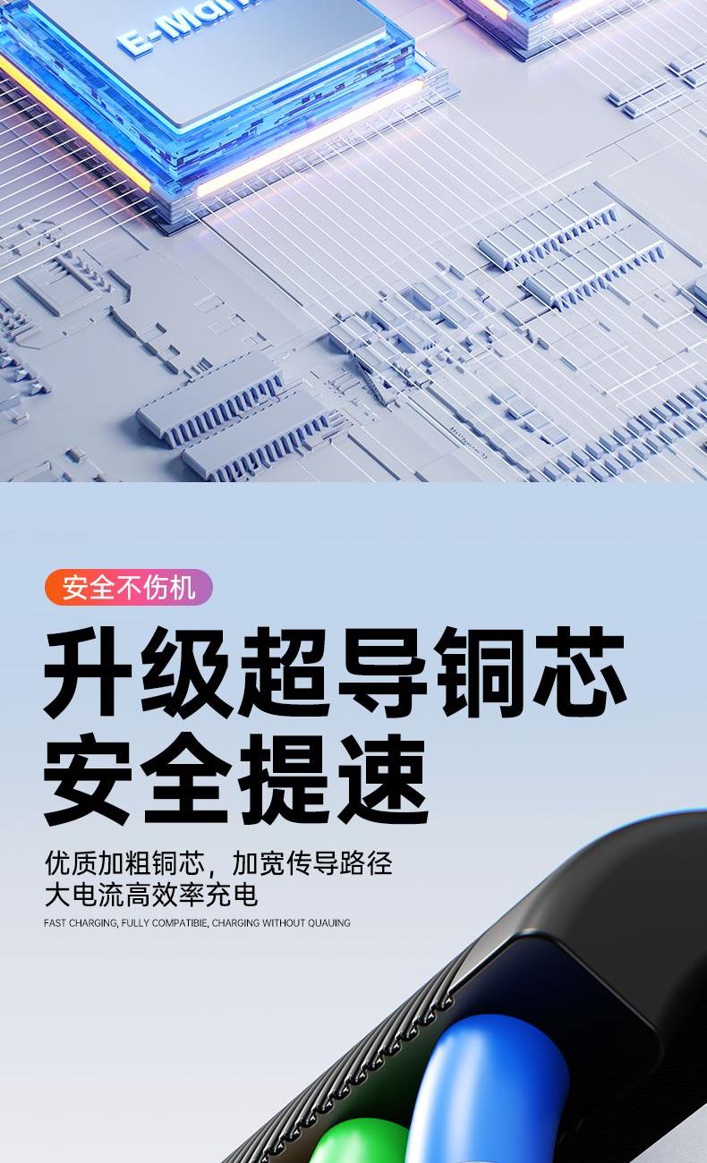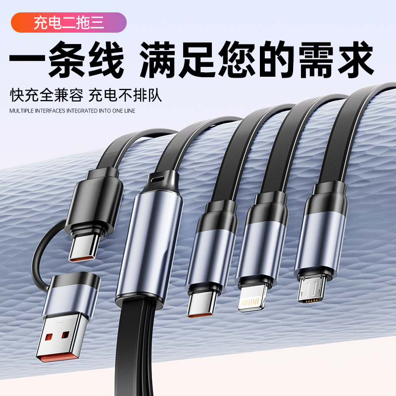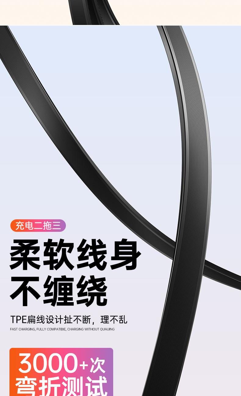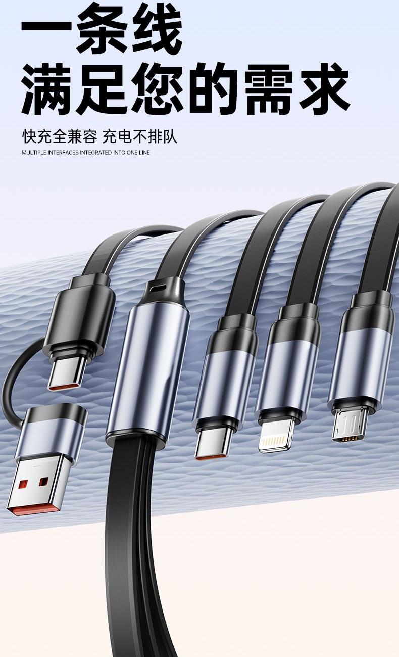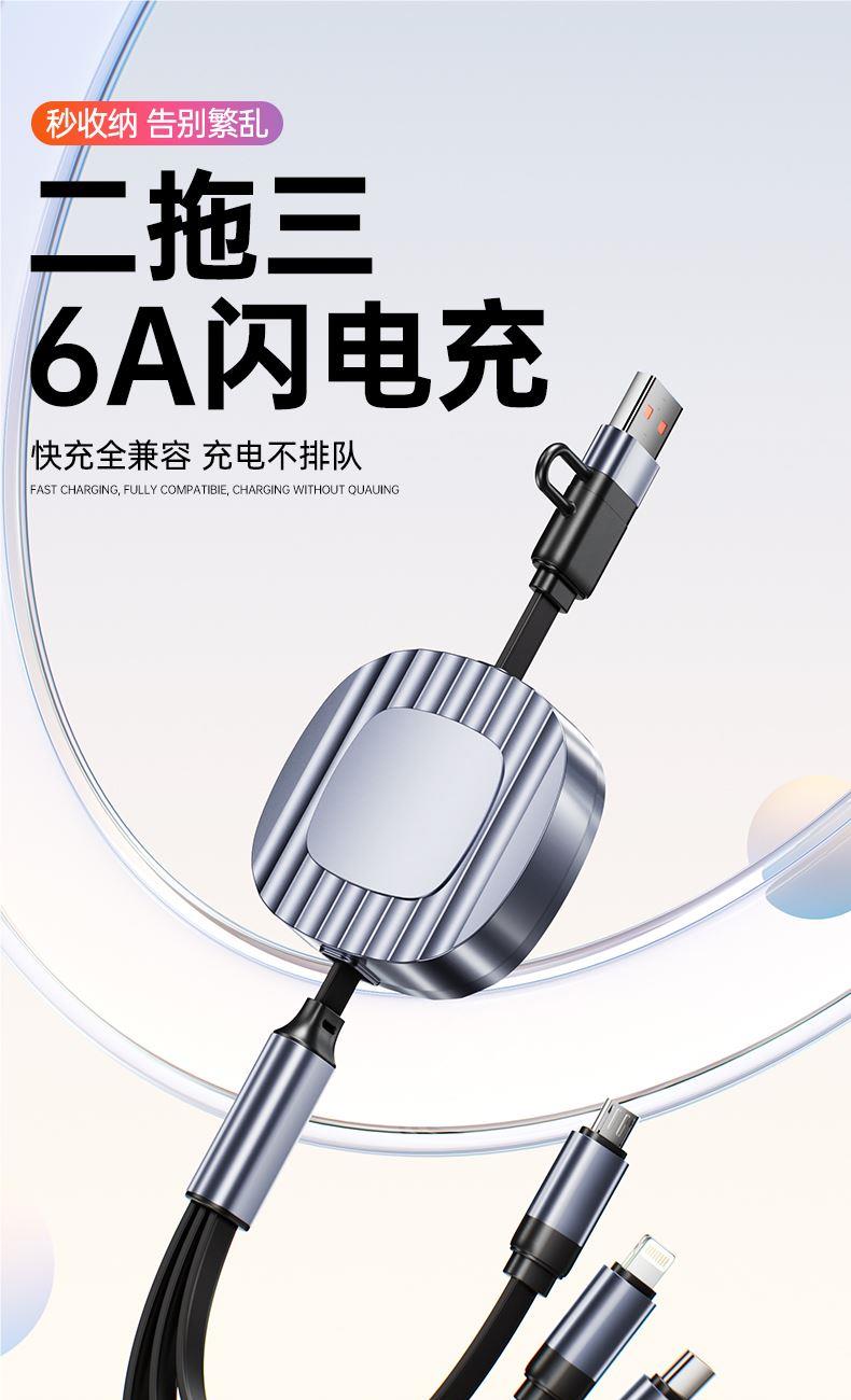 S15清雅100W快充伸缩数据线 颜色:金色 灰色 材质:TPE+ABS 尺寸:1.2M 包装:彩盒包装 【功能特点】: 二拖三伸缩设计,兼容苹果15系列 100W超级快充,充电更快 三种接口满足各种手机 1.2米长度设计,使用方便 TPE材质耐用,商务ABS面盖 五档伸缩调节 可充笔记本电脑