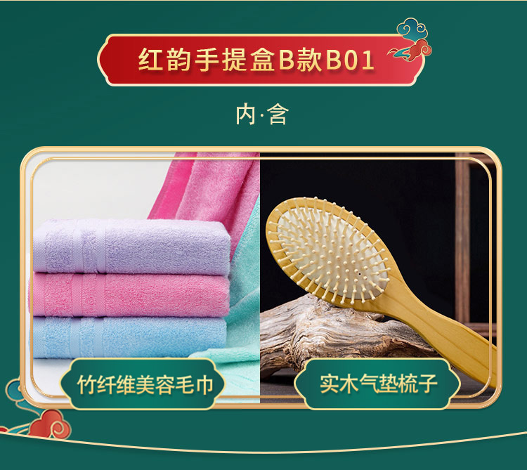 内含: 竹纤维美容毛巾*2 实木气垫梳子*1 手感舒适、柔软。 色泽亮丽、持久不变 竹子中的特质“竹醌”具有天然抗螨功能, 透气性好且容易清洗 、不板结、不发硬,也不会有粘滑现象。 搭配气垫实木梳子