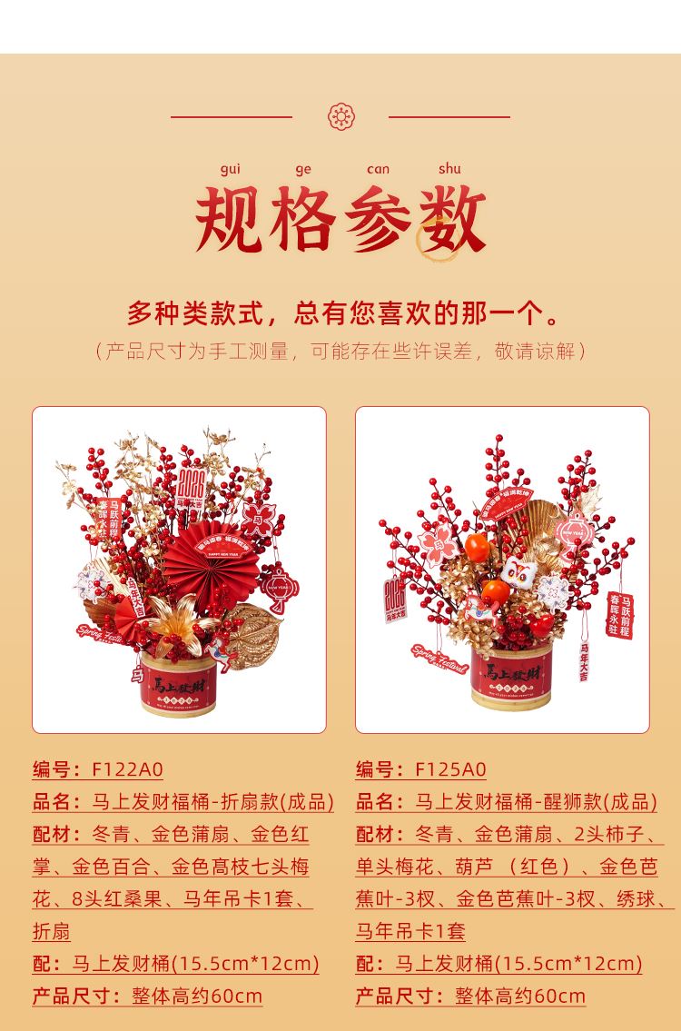 产品:福禄纳财新中式福桶-成品 编码:F126A0 规格: 桶18*20.5cm 整体高60cm 宽58cm 材料:金色蝴蝶兰-9头、7头网胡蝶兰、金色鹅掌、亮片闪粉插枝、金色蒲扇、金色马蹄莲、红色冬青、8头红桑果、单只金贵叶、金色凤尾、金色佛珠、金色三叉葫芦、金色花生叶、纸葫芦、马年吊卡一套 特别注意:报价只对应主图款,详情页其他报价请具体联系