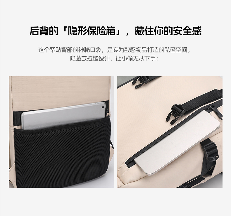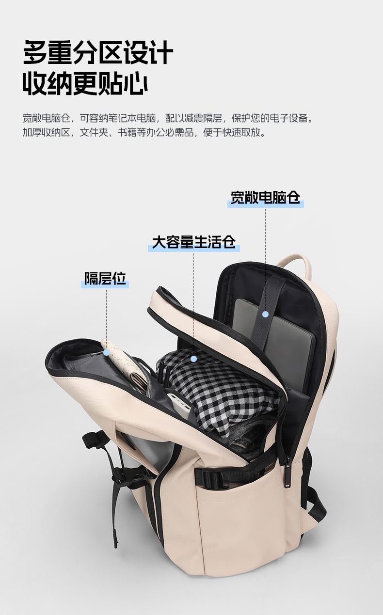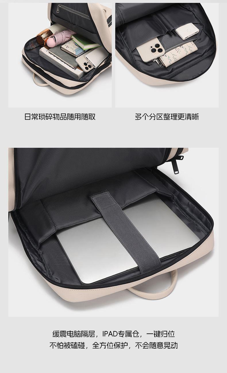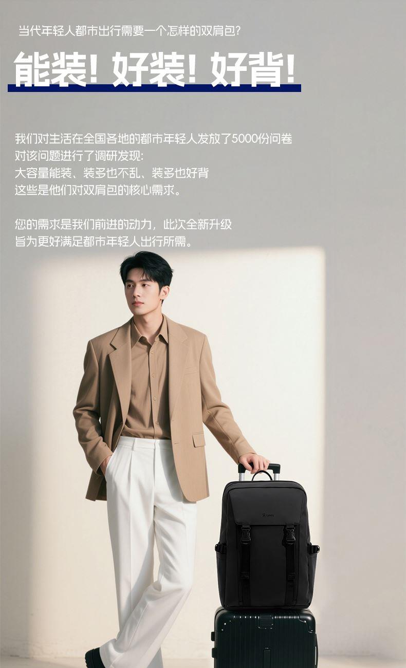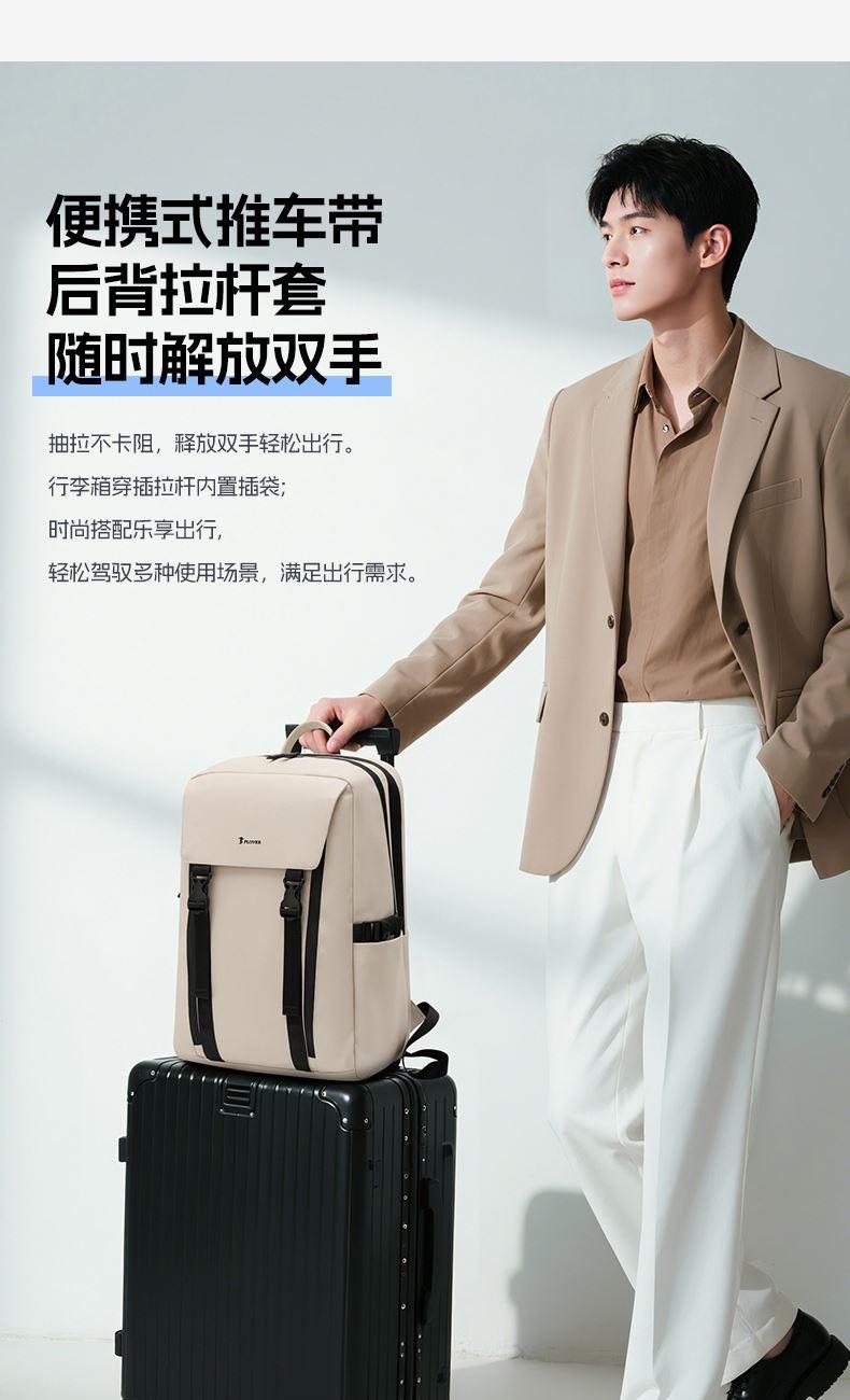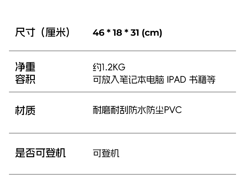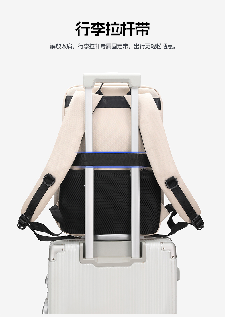 1.耐磨耐刮防水防尘PVC 2.内部暗拉链袋,电脑隔层 3.舒适手提 4.侧袋可放水杯/雨伞 5.前置双按插扣 6.后置套拉杆固定带