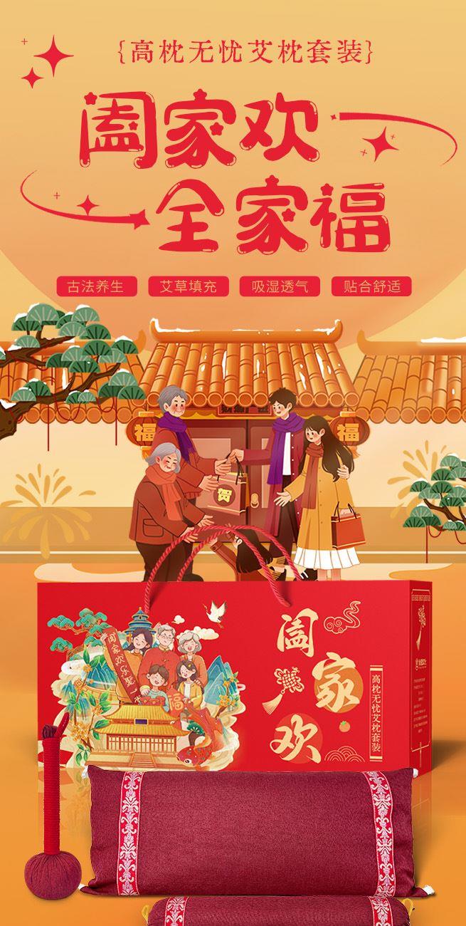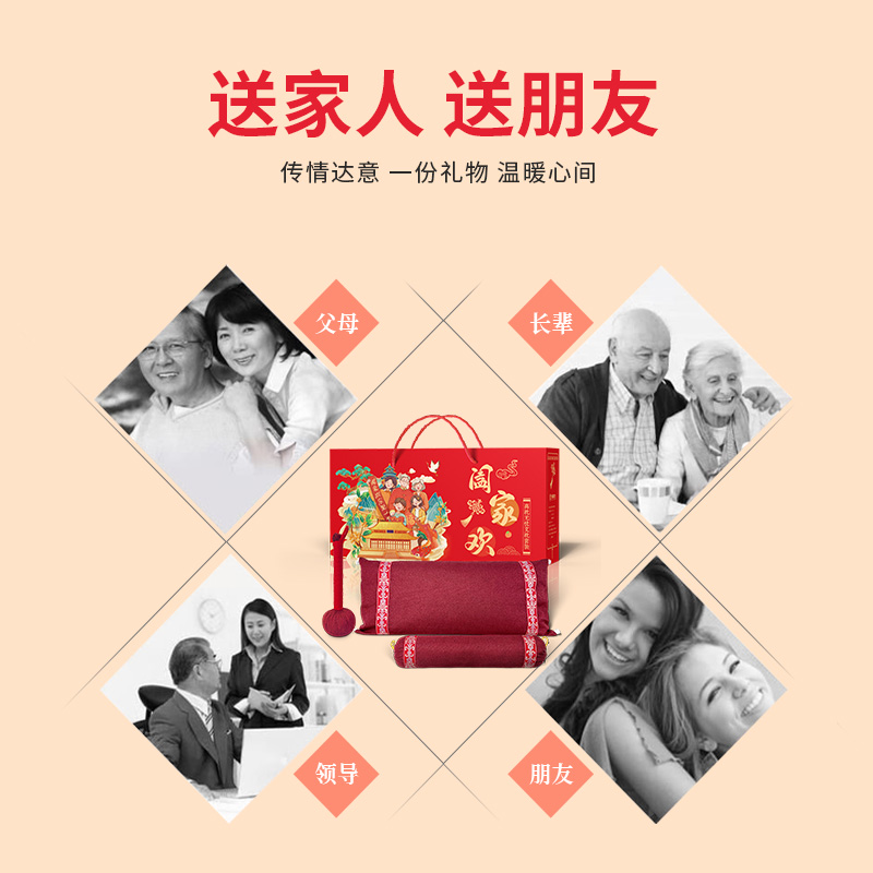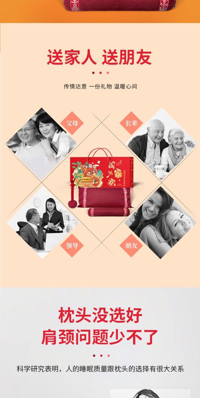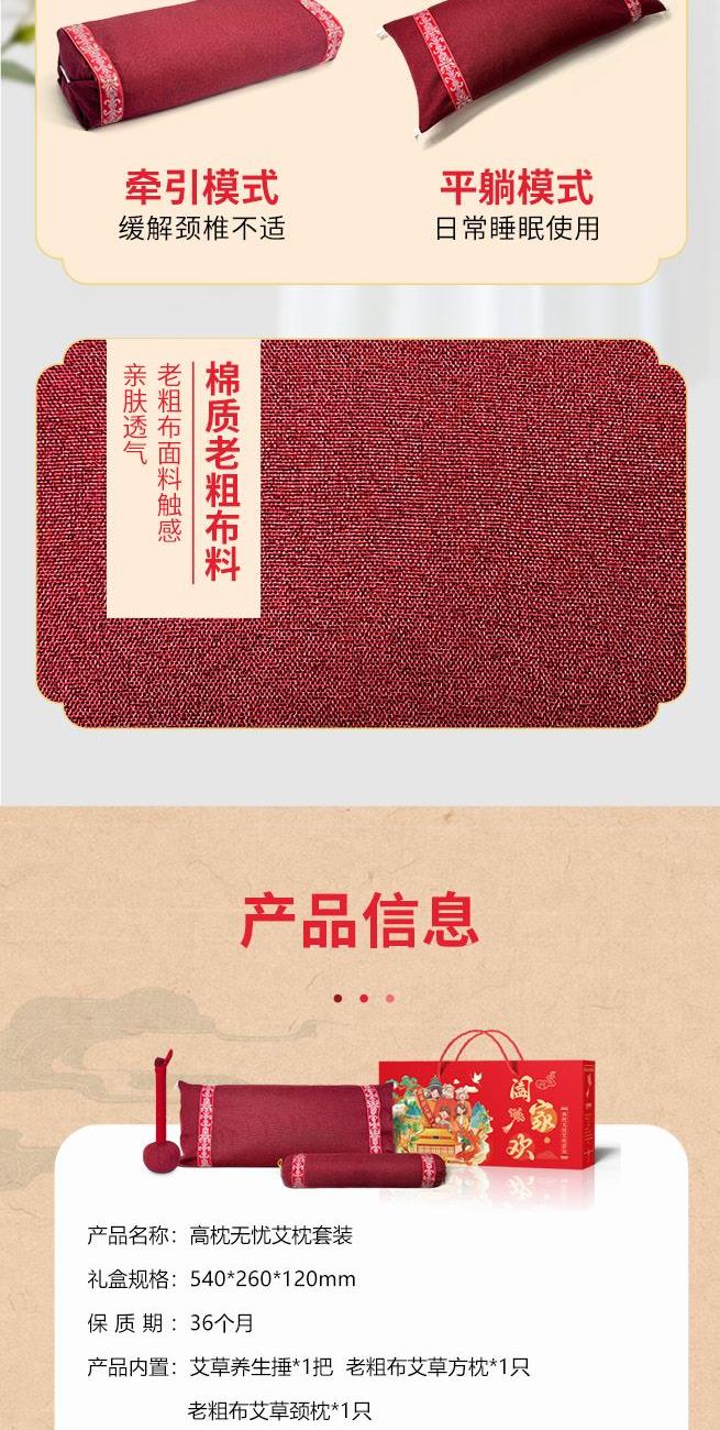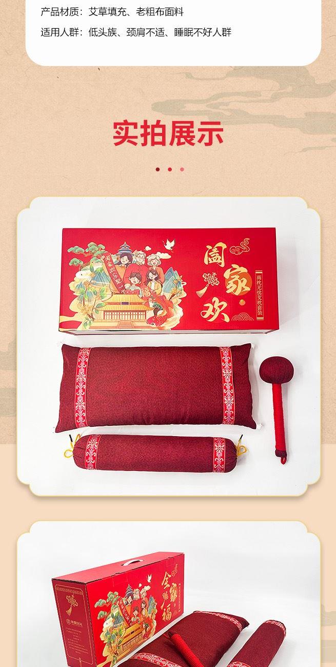 产品主题:阖家欢乐聚一堂 礼盒规格:540mm*260mm*120mm 产品配置:养生艾草按摩捶*1把 老粗布养生枕*1只 老粗布颈椎枕*1只 产品卖点: 1、产品套装包含养生枕、颈椎枕和养生锤,一套解决家居健康需求。 2、养生枕两侧设卡扣,牵引模式、睡眠模式随心转换,颈椎枕拉伸颈椎,艾草锤日常按摩捶打。 3、产品内芯填充以艾草为主的十余味破壁粉碎中草药,安神舒眠,温经通络。 4、红色喜庆礼盒,同色系产品,红红火火,更适合送礼。 5、产品主题全家福阖家欢,献礼团圆时刻。