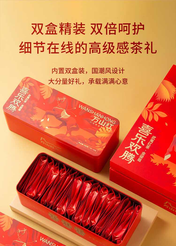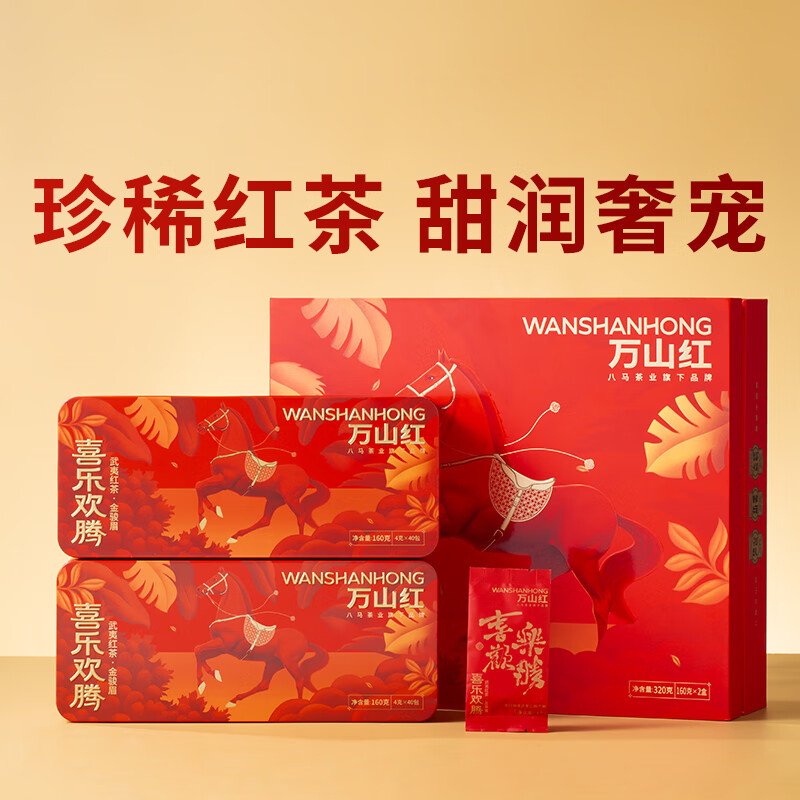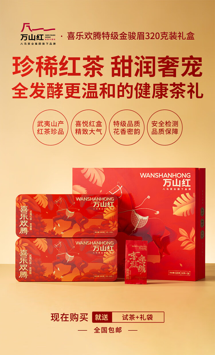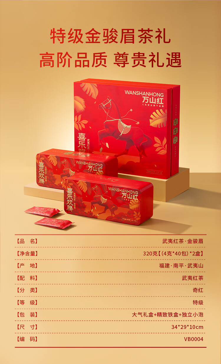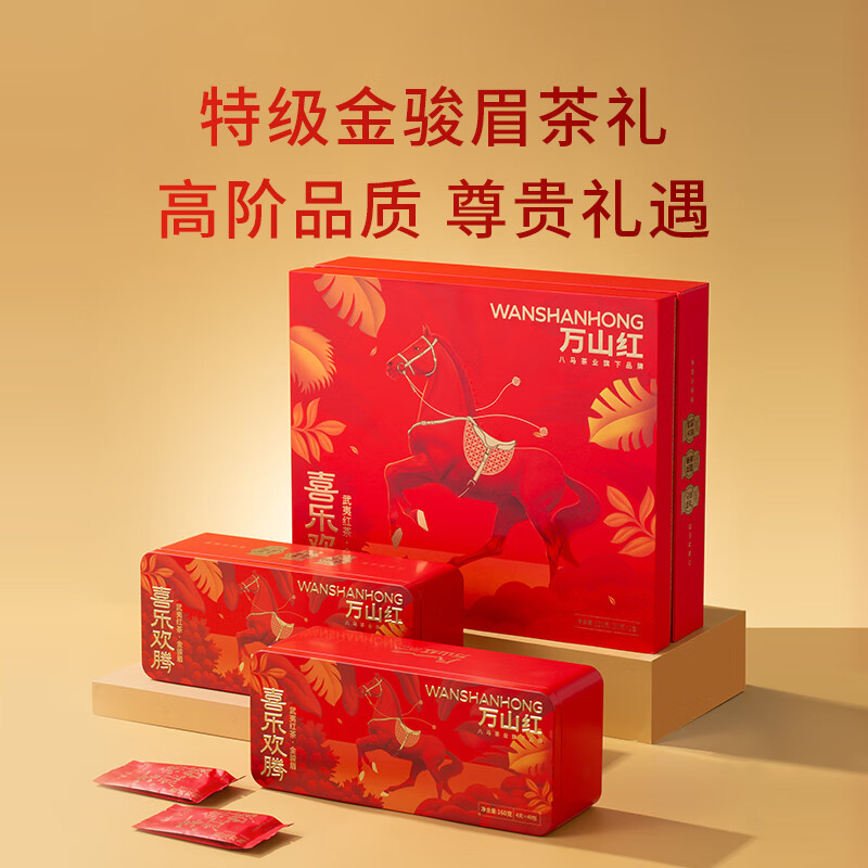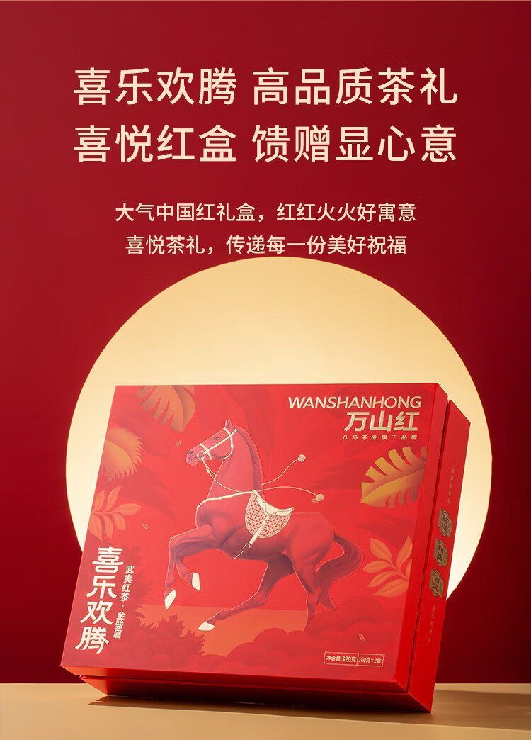 礼盒内配: 金骏眉160克*2 净含量:320克 单罐内配:335 金骏眉200克 净含量:200g 推荐理由: 自饮一罐,送礼一盒 金骏眉产品卖点 - 产地优势:源自福建武夷山核心原产地,正宗红茶产区保障品质。 - 品类价值:红茶新贵金骏眉,发酵充足,口感温和健康,饮用体验佳。 - 产品形态:超值罐装,净含量200克,存储便捷,满足自用与送礼需求。 喜乐欢腾礼盒产品卖点 - 产品定位:红茶礼盒,甜润奢宠口感,彰显品质与格调。 - 礼盒设计:“喜乐欢腾”主题包装,红金配色搭配骏马元素,视觉喜庆且富有质感,适配节日、商务等送礼场景。