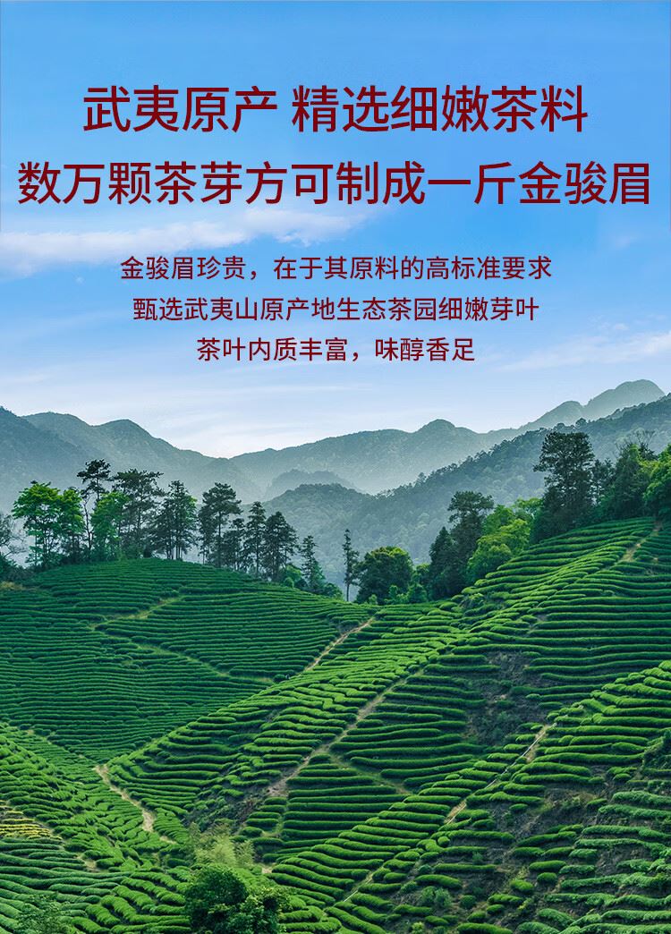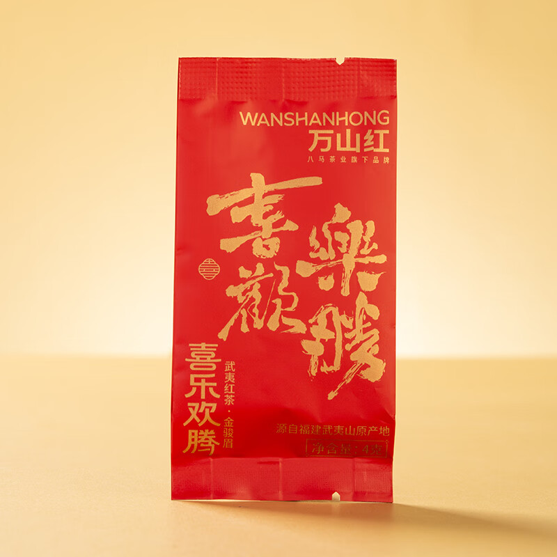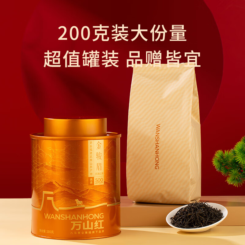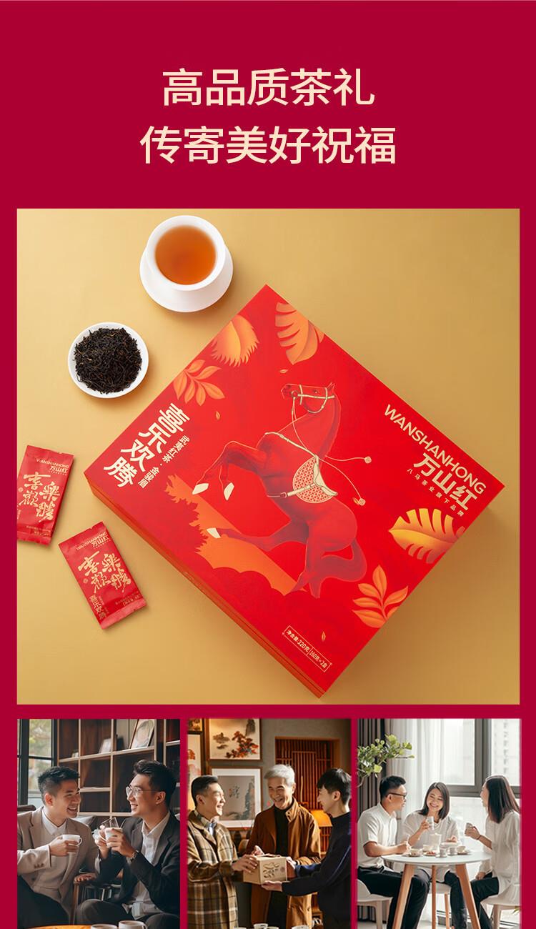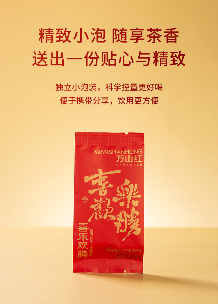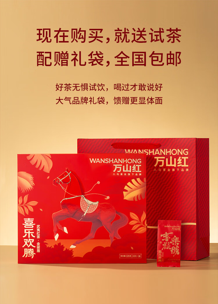 礼盒内配: 金骏眉160克*2 净含量:320克 单罐内配:335 金骏眉200克 净含量:200g 推荐理由: 自饮一罐,送礼一盒 金骏眉产品卖点 - 产地优势:源自福建武夷山核心原产地,正宗红茶产区保障品质。 - 品类价值:红茶新贵金骏眉,发酵充足,口感温和健康,饮用体验佳。 - 产品形态:超值罐装,净含量200克,存储便捷,满足自用与送礼需求。 喜乐欢腾礼盒产品卖点 - 产品定位:红茶礼盒,甜润奢宠口感,彰显品质与格调。 - 礼盒设计:“喜乐欢腾”主题包装,红金配色搭配骏马元素,视觉喜庆且富有质感,适配节日、商务等送礼场景。