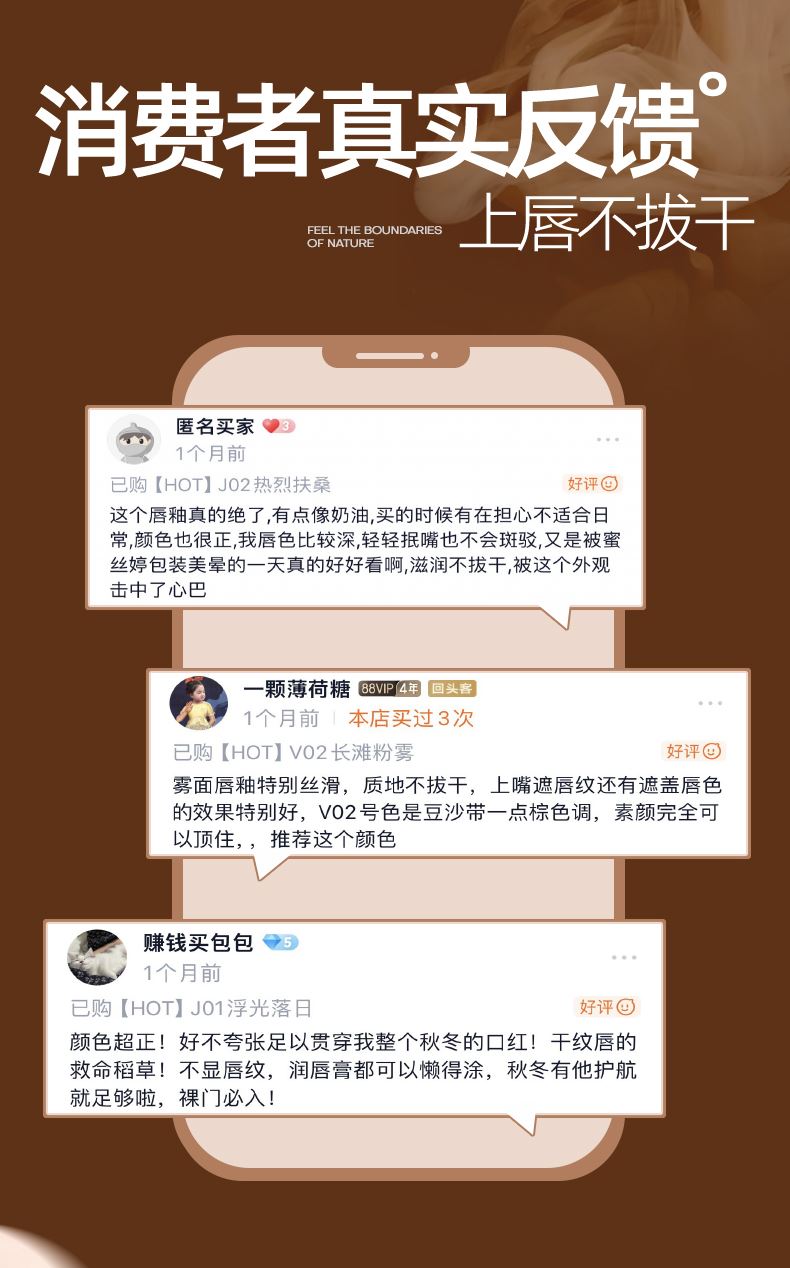 一、2大妆效: 霜转轻雾、水光嘟嘟 1)霜转雾面款带来丝滑绒绒触感,同时轻薄柔焦,持色不拔干: 01 一抿霜转雾,越抿越滑 • 触唇由霜转雾,一抿激活柔焦粒子,雾感弥漫 • 「熔岩奶咖」般绵密丝滑 02 越抿越润,不拔干不卡纹 • 外哑内润,抚平唇纹 • 玻尿酸入妆,干唇友好 04 融入泰妆精髓 专研低饱和奶咖色系 • 比口棕更显白嫩,比红调更提气色 2)水光款平衡水光唇釉的黏腻感和嘟嘟唇妆效: 01 1%丰唇肽入妆,一抿冻感亮嘟嘟 • 精华凝冻成膜,不粘不腻不拉丝 • 足量添加1%丰唇肽,立显饱满嘟嘟 02 三重奢养精华油,8H持续水嘟嘟 • 持续养护双唇,卸妆后依然软软嫩嫩 03 清透高遮盖,深唇也能嫩嘟嘟 • 专研高显色配方,薄涂即可高覆盖 • 一抹即卸不染唇 04 融入泰妆精髓 专研奶咖色系 • 比口棕更显白嫩,比红调更提气色