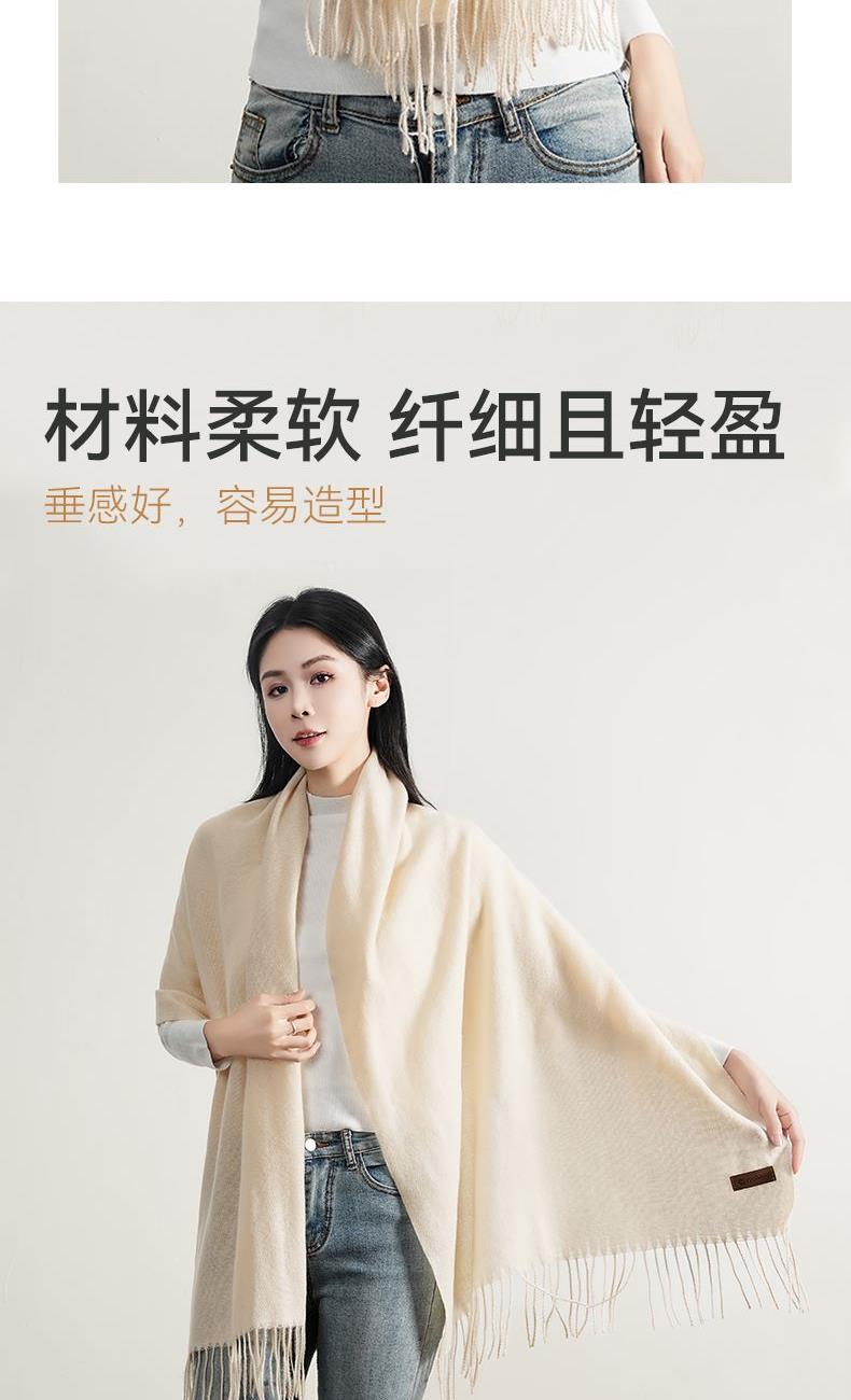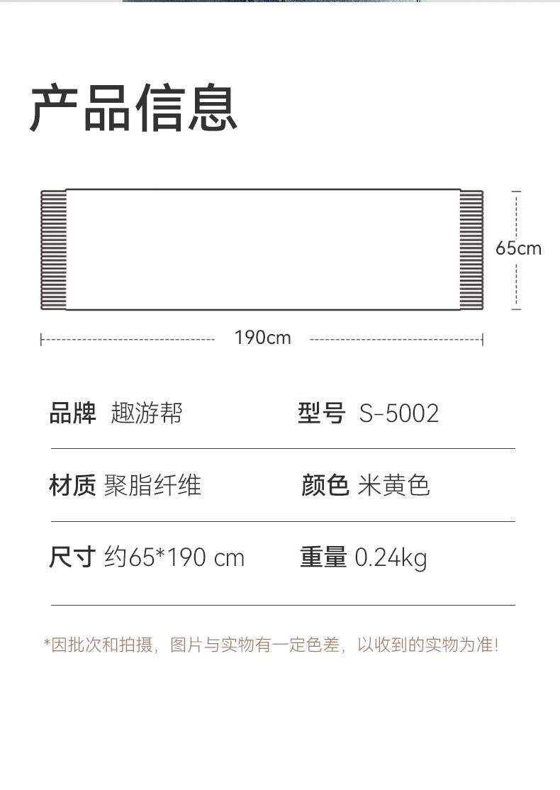 材质 聚脂纤维 颜色 米黄色 尺寸 约65*190 cm 重量 约350g 材料柔软纤细且轻盈 流苏修边设计不易开线 垂感好,容易造型 结构紧密,保暖性好