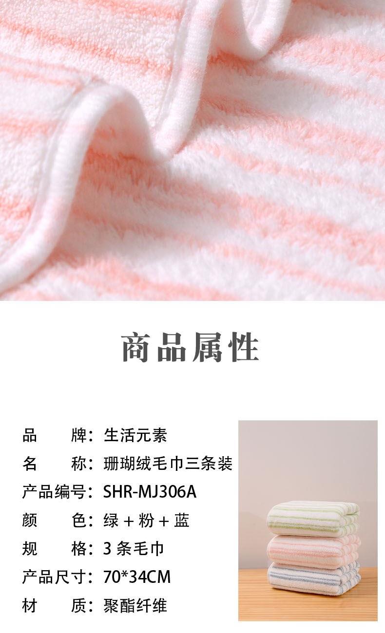 生活元素珊瑚绒毛巾三条装SHR-MJ306A绿+粉+蓝