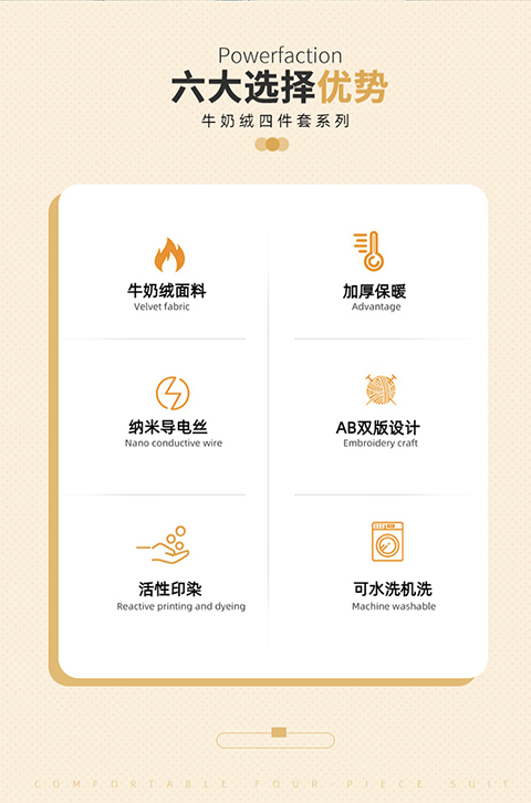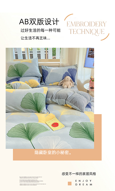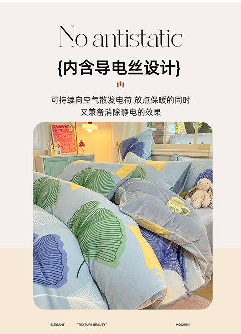 面料:加厚牛奶绒 工艺:AB双版设计 活性印染 规格:被套:200*230cm 床单230*245cm 枕套48*74cm*2 双面高克重牛奶绒面料,手感好绒毛细长,让您享受暖暖的感觉。 面料中植入导电丝,导出静电,呵护舒适睡眠。 新一代活性印染技术,精美印花设计,色彩莹润饱满,带来动人表现力!