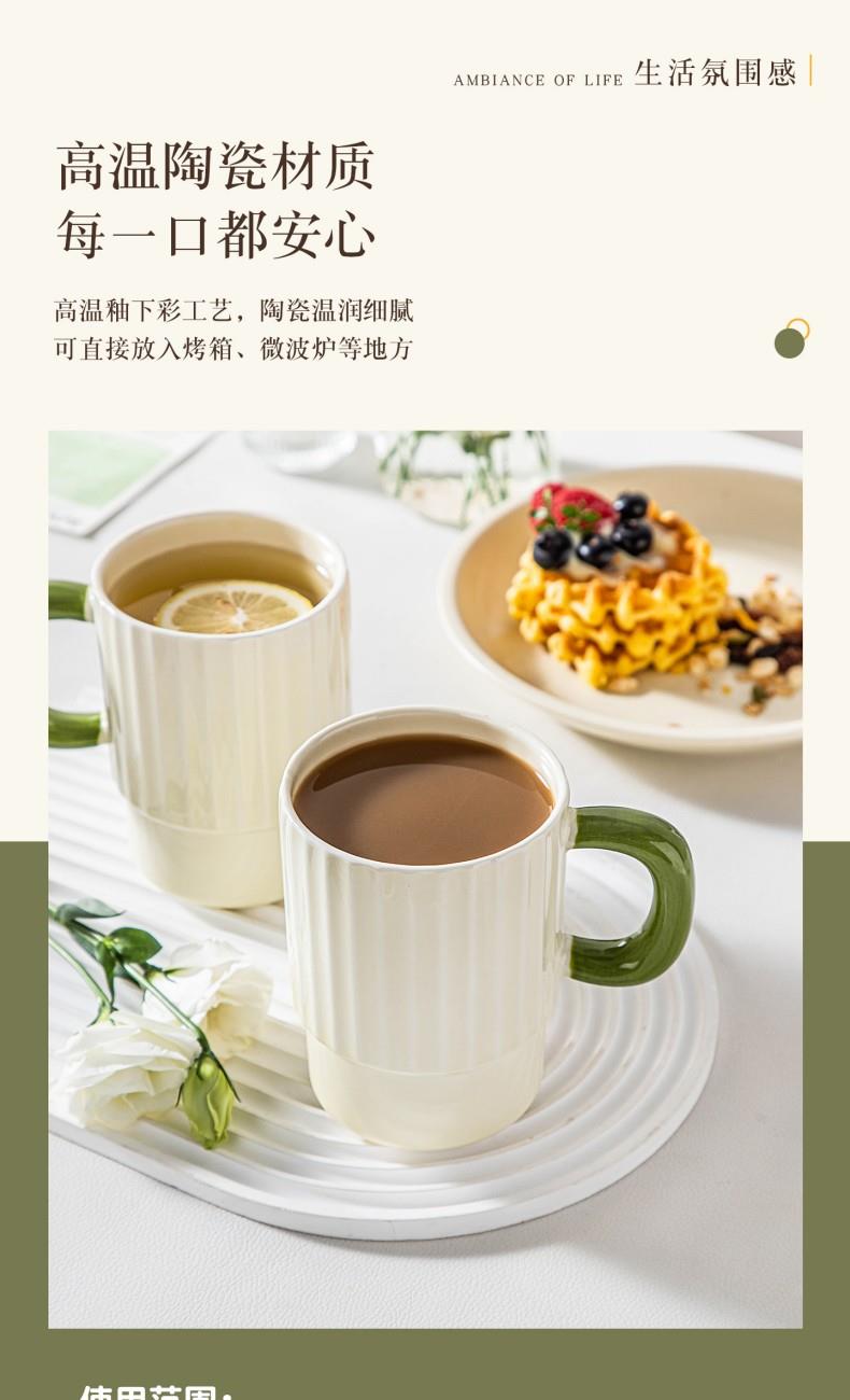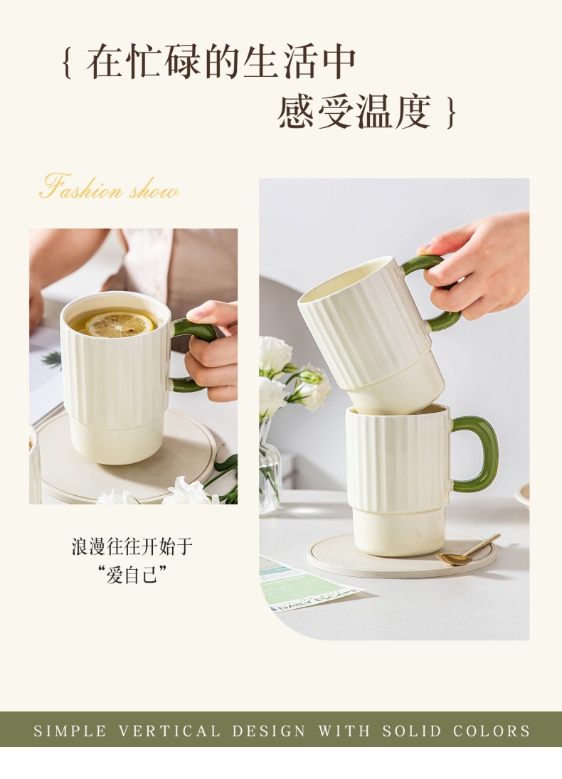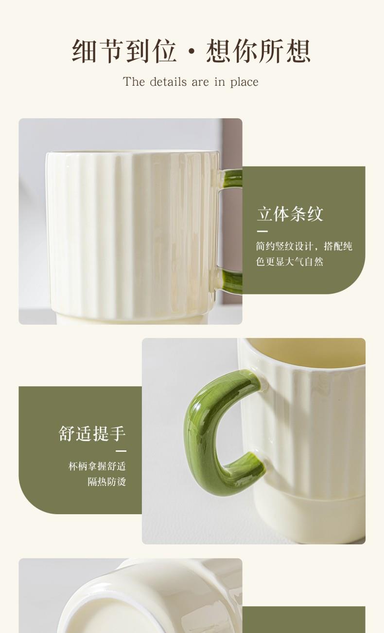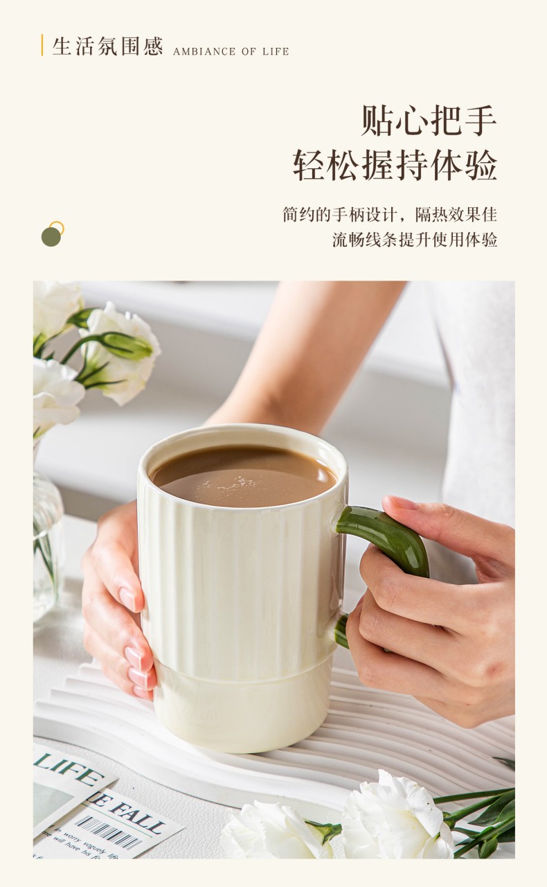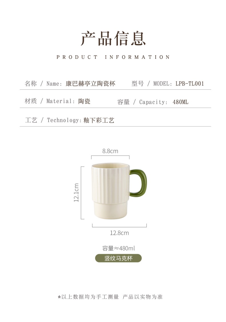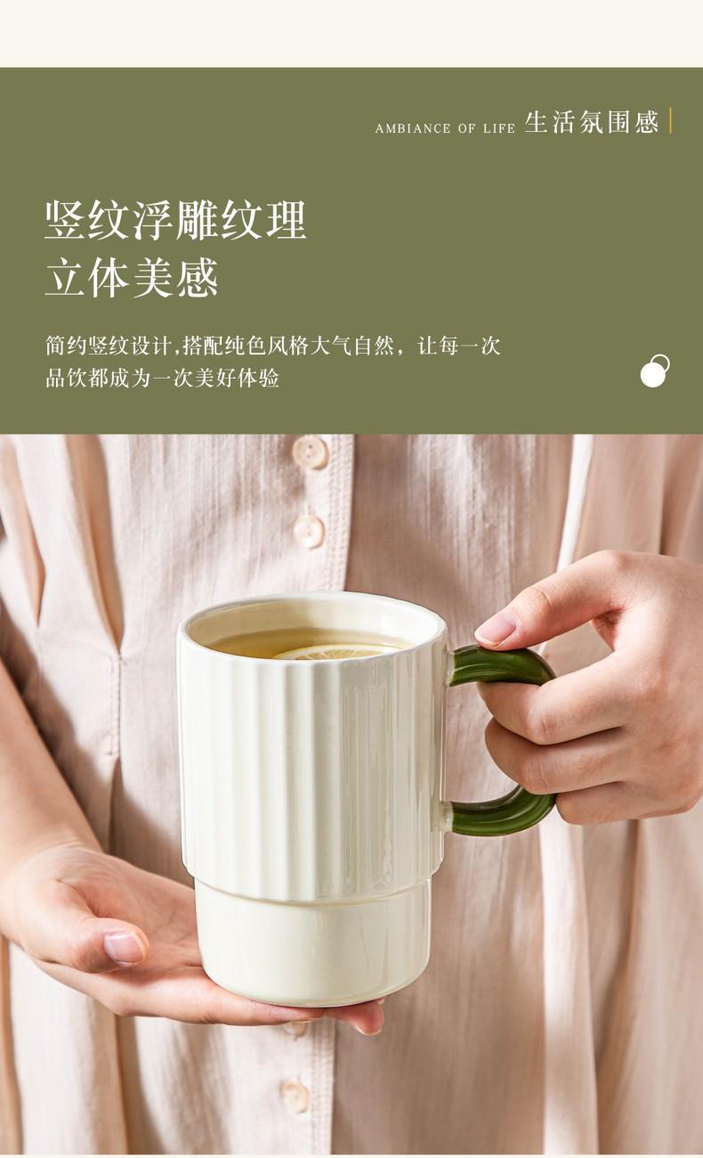 【材质】陶瓷 【规格】480ml 【包装方式】彩盒 【彩盒尺寸】130*97*128mm 【重量】0.5kg 【条码】6957929941584 【配置】480ml陶瓷杯*1 釉上彩中高温800度,食用安全 杯身凹凸纹路,不规则定制,更具时尚感 颜色搭配清新靓丽,送礼更合适