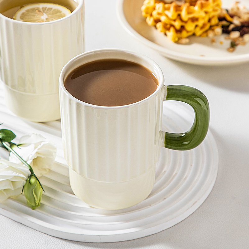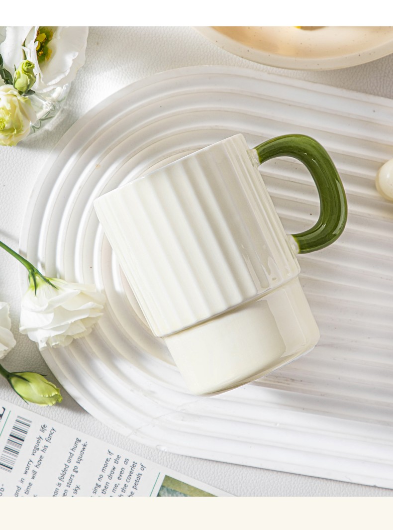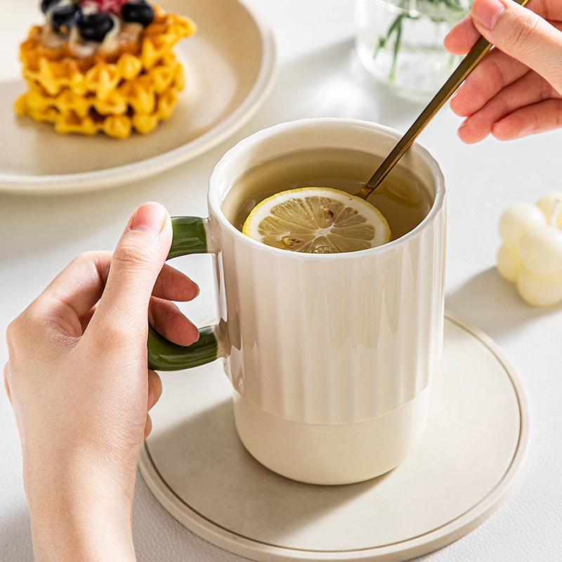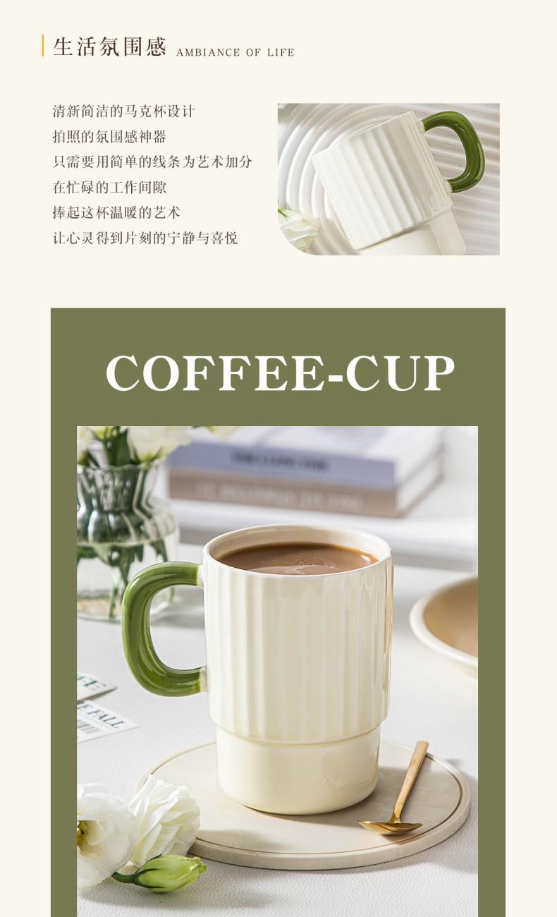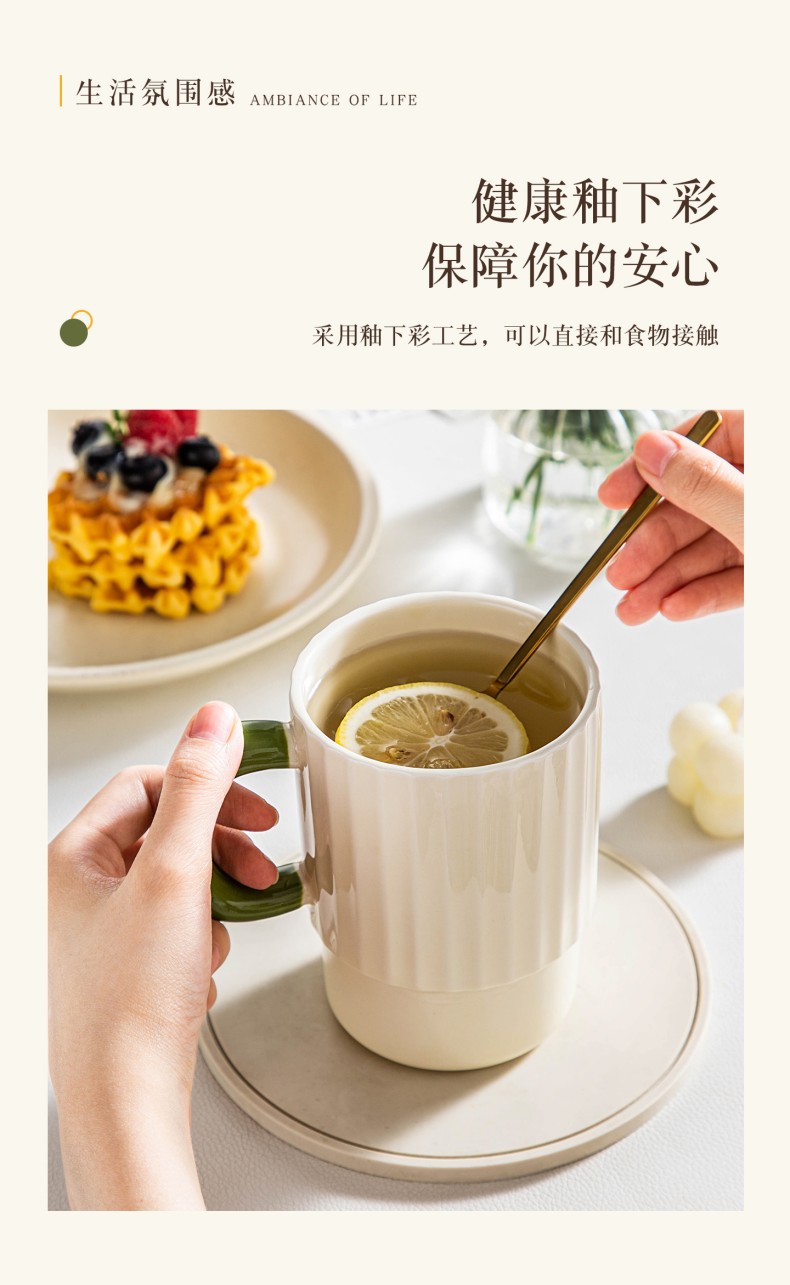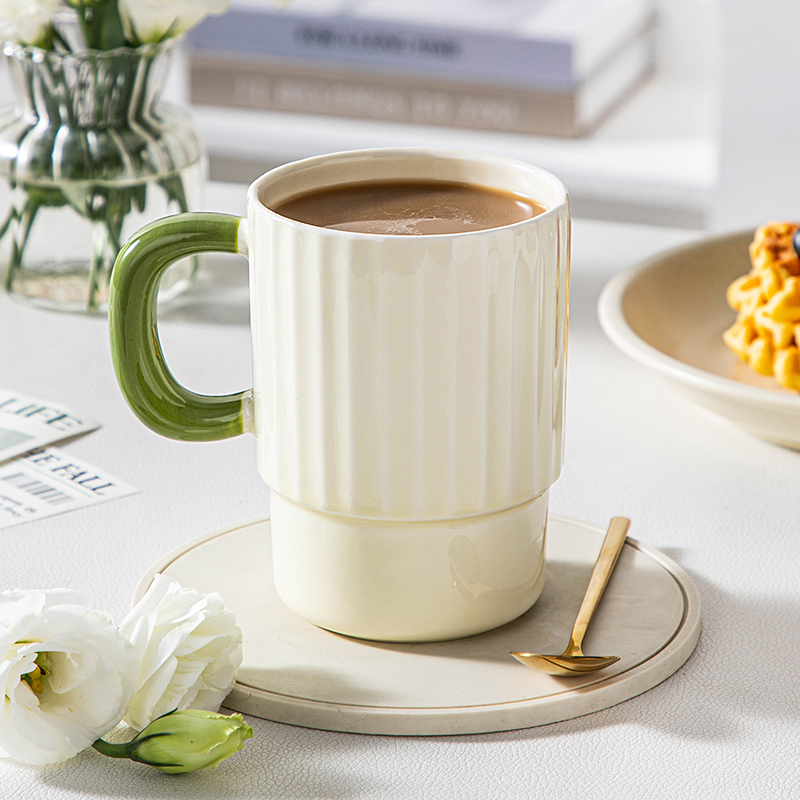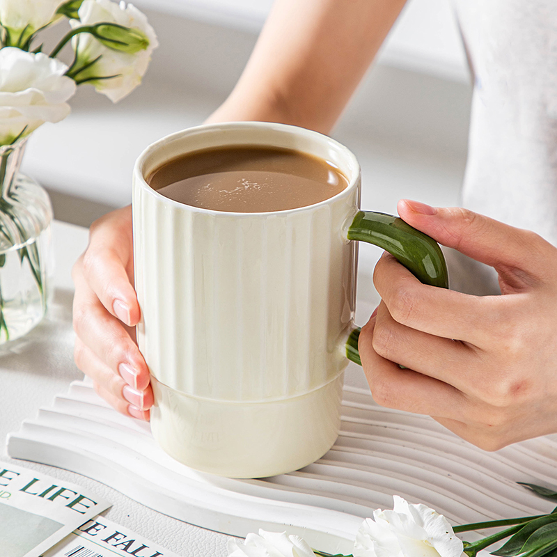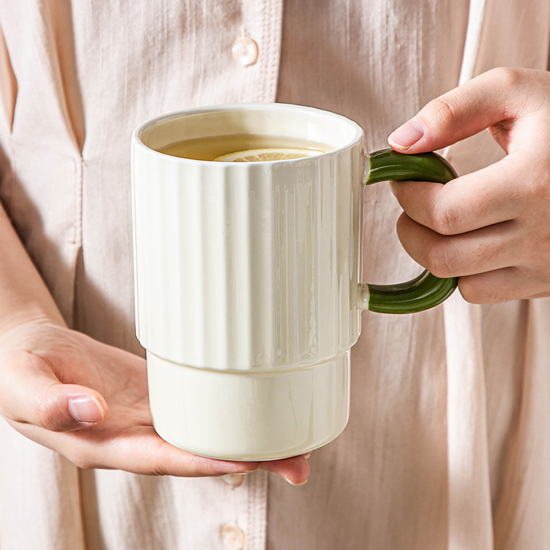 【材质】陶瓷 【规格】480ml 【包装方式】彩盒 【彩盒尺寸】130*97*128mm 【重量】0.5kg 【条码】6957929941584 【配置】480ml陶瓷杯*1 釉上彩中高温800度,食用安全 杯身凹凸纹路,不规则定制,更具时尚感 颜色搭配清新靓丽,送礼更合适