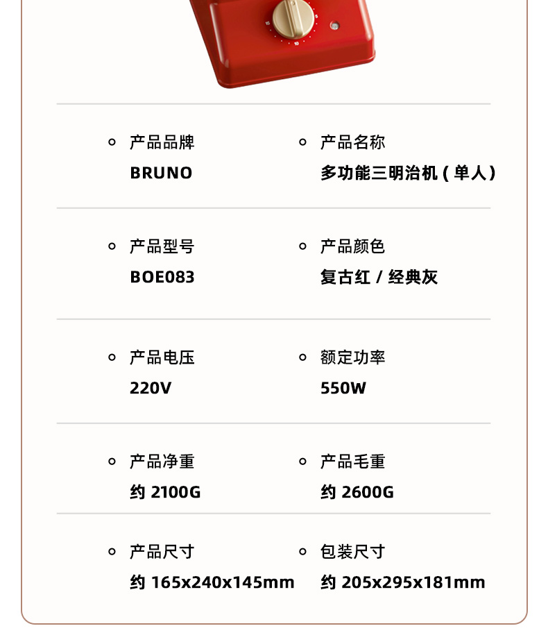 产品型号:BOE083 产品颜色:复古红 产品电压:220V 额定功率:550W 产品净重:约2.1KG 产品毛重:约2.6KG 产品尺寸:约165*240*145mm 包装尺寸:约205*295*181mm
