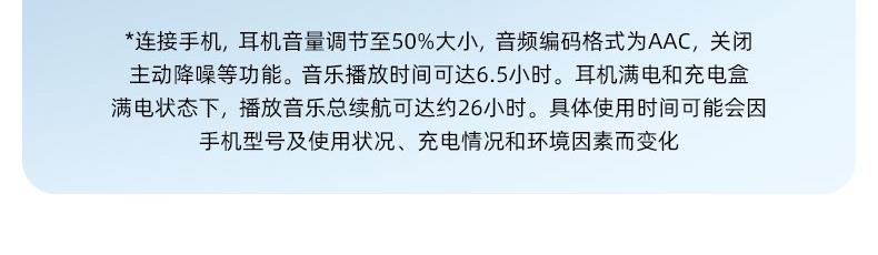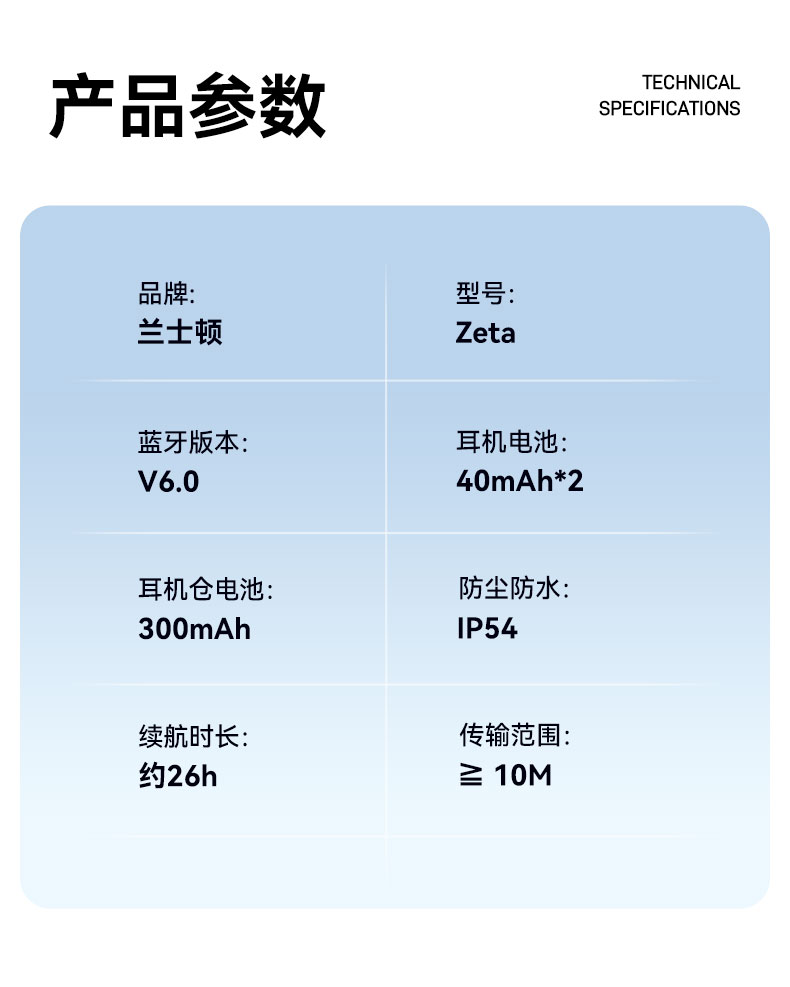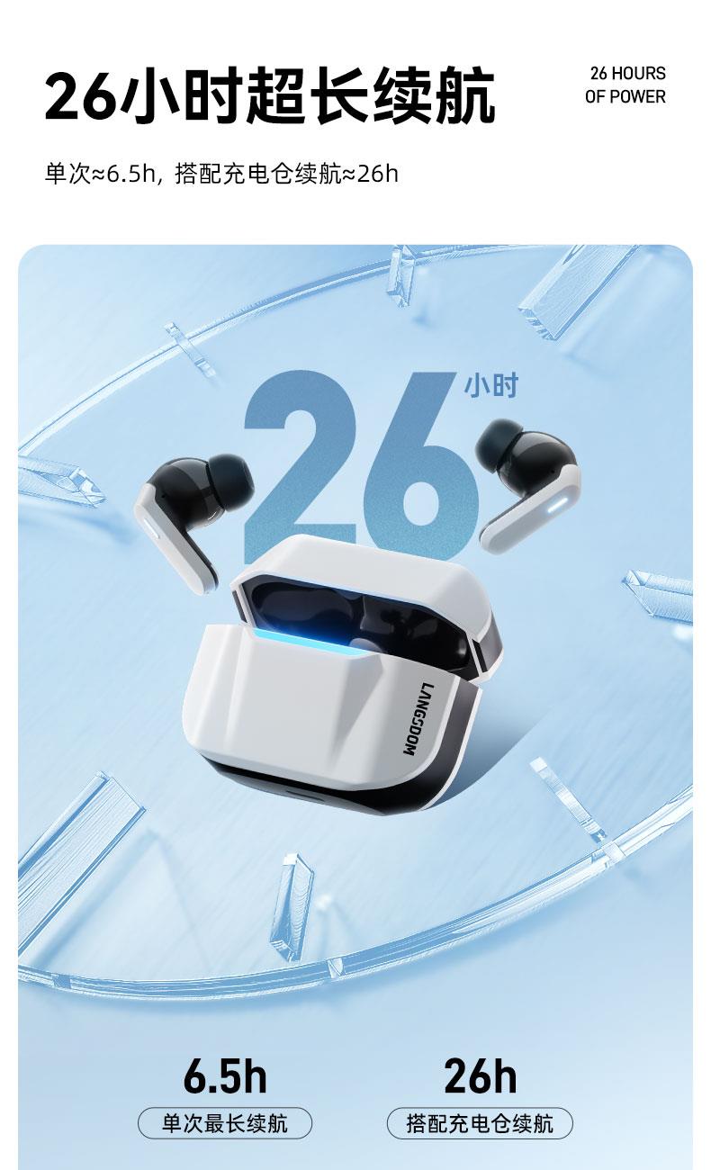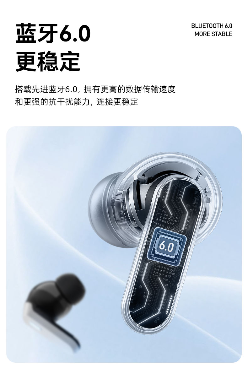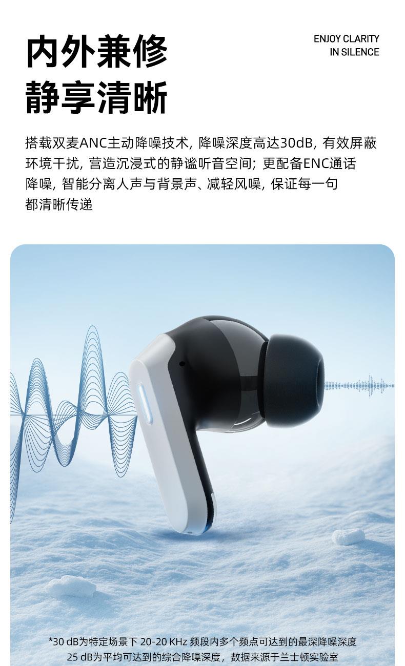颜色:月光白/月影灰 电池容量:40mAh*2/300mAh 包装尺寸:120*120*52mm 外箱尺寸:550*545*265mm 续航时间:26小时 充电时间:1.5小时 蓝牙版本:V6.0 防水级别:IP54 充电盒曲面设计,耳机硅胶耳帽舒适 10mm动圈复合膜,低频澎湃音量强 ANC双麦降噪30db,支持通透模式 IP54防尘防水,雨汗场景适用 连兰士顿APP,可查耳机自定义设置 单次用6.5h,总续航26h少充电 游戏模式45ms低延时,音画同步 蓝牙6.0,传速快抗干扰音质好