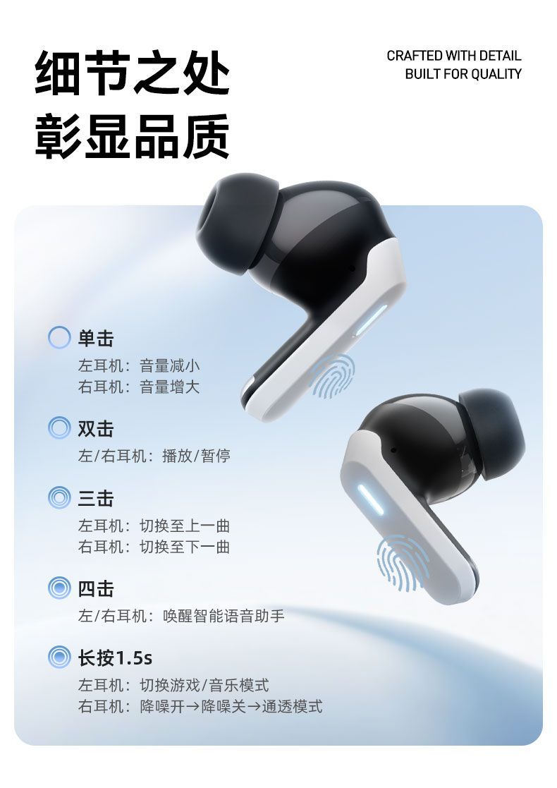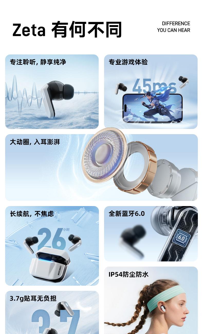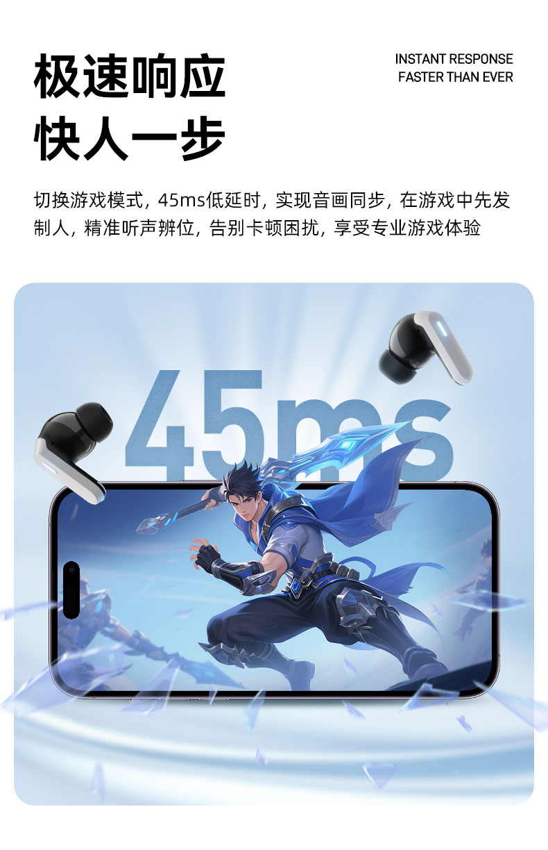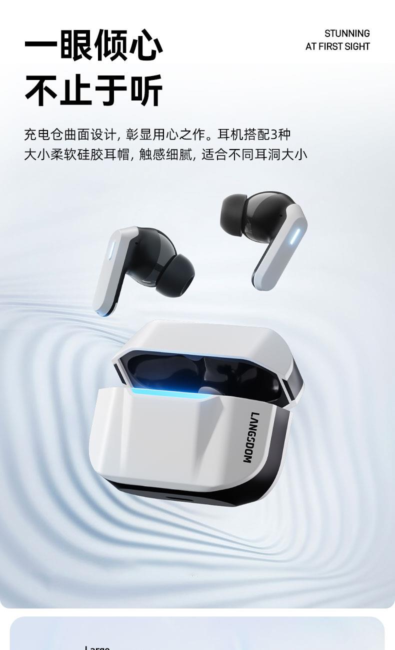 颜色:月光白/月影灰 电池容量:40mAh*2/300mAh 包装尺寸:120*120*52mm 外箱尺寸:550*545*265mm 续航时间:26小时 充电时间:1.5小时 蓝牙版本:V6.0 防水级别:IP54 充电盒曲面设计,耳机硅胶耳帽舒适 10mm动圈复合膜,低频澎湃音量强 ANC双麦降噪30db,支持通透模式 IP54防尘防水,雨汗场景适用 连兰士顿APP,可查耳机自定义设置 单次用6.5h,总续航26h少充电 游戏模式45ms低延时,音画同步 蓝牙6.0,传速快抗干扰音质好