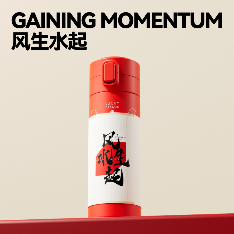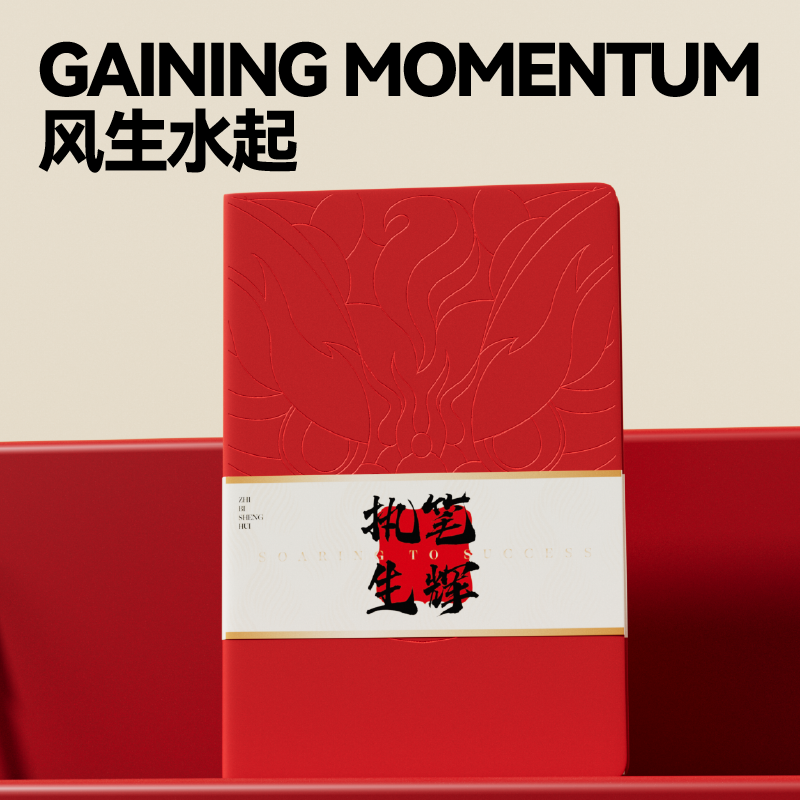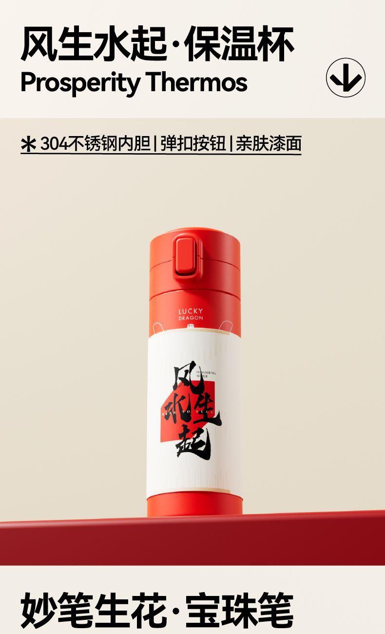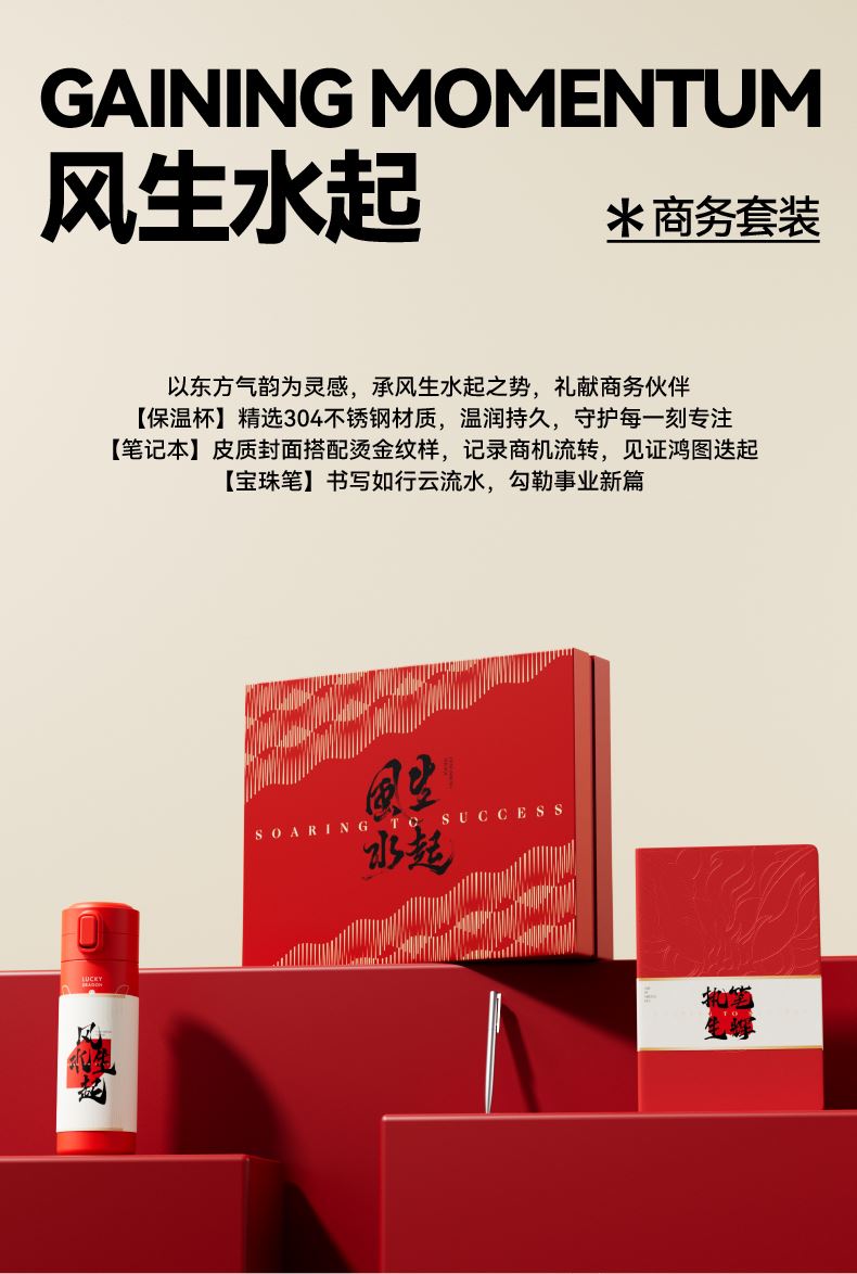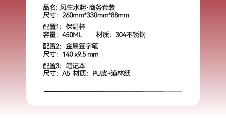 以东方气韵为灵感,承风生水起之势,礼献商务伙伴 保温杯:精选304不锈钢材质,温润持久,守护每一刻专注; 笔记本:皮质封面搭配烫金纹样,记录商机流转,鸿图迭起; 宝珠笔:书写如行云流水,勾勒事业新篇 配置1:风生水起·保温杯 材质:304 容量:450ml 配置2:妙笔生花·宝珠笔 尺寸:140 x9.5 mm 配置3:执笔生辉·笔记本 尺寸:A5