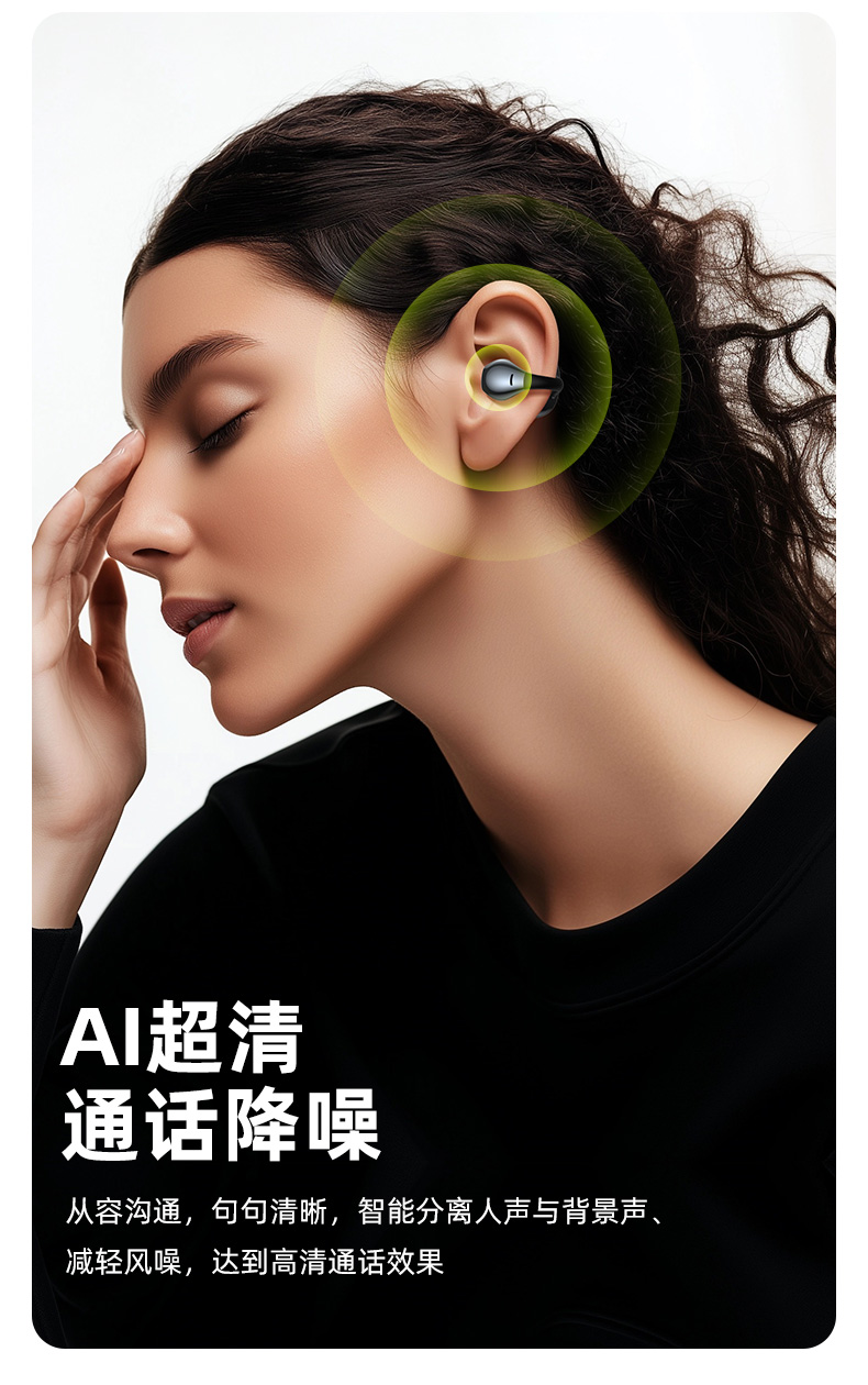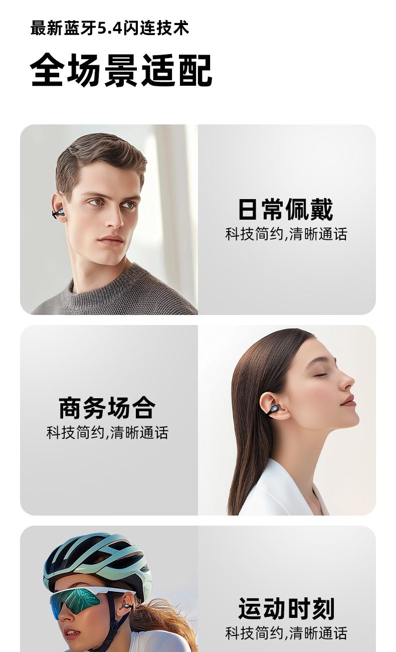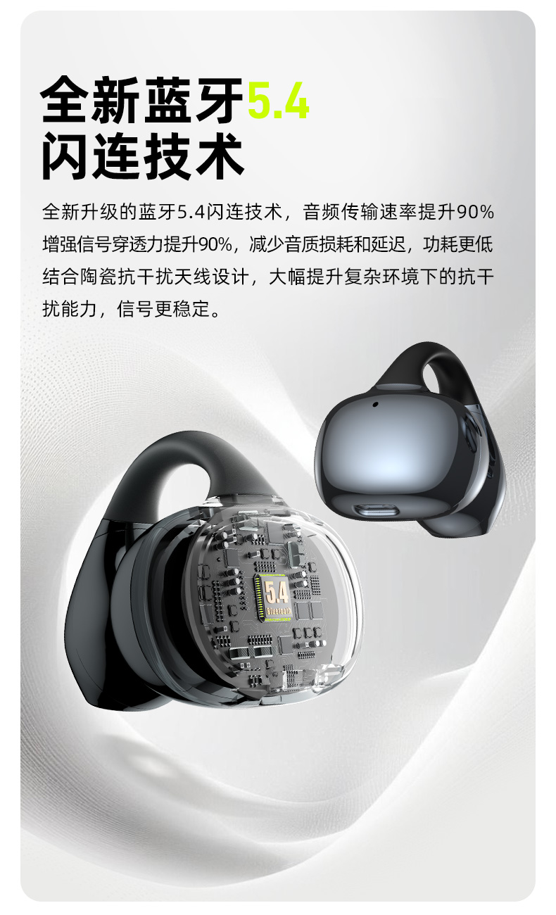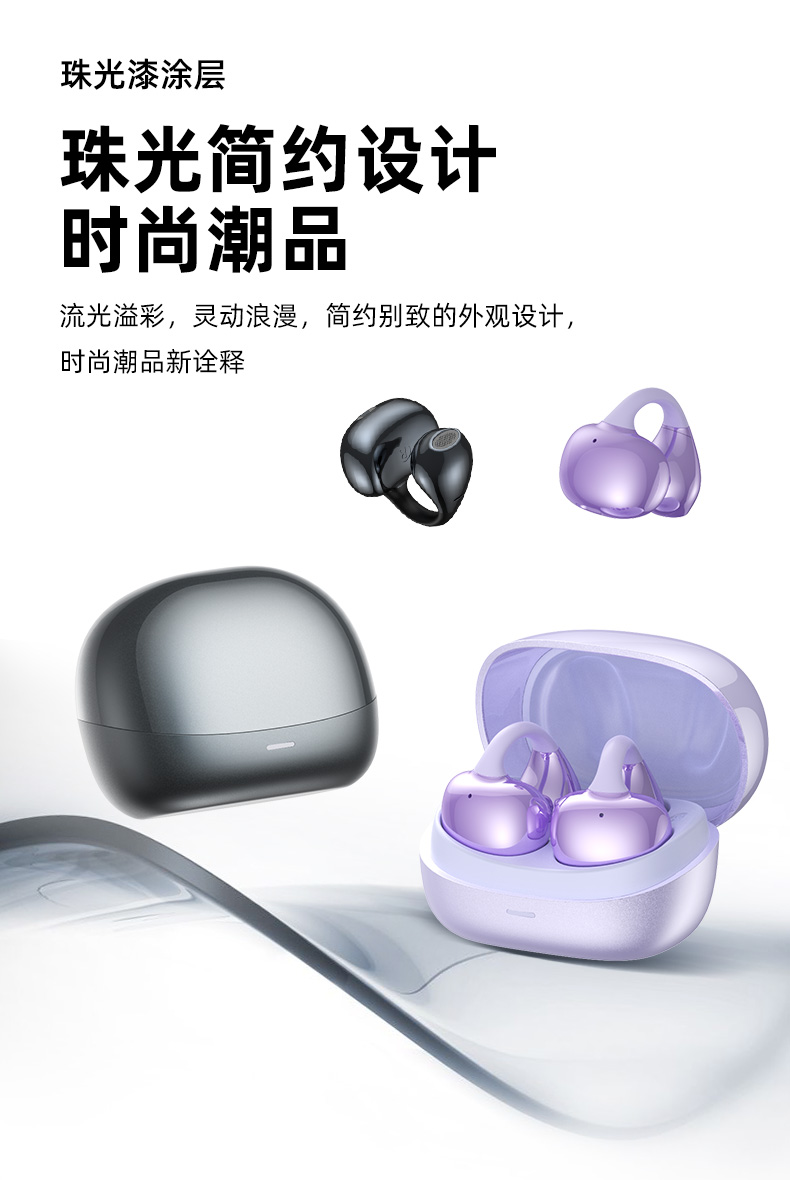颜色:幻夜紫/雾岚灰 电池容量:50mAh*2/400mAh 包装尺寸:120*120*52mm 外箱尺寸:550*545*265mm 续航时间:32小时 充电时间:1.5小时 蓝牙版本:V5.4 防水级别:IPX4 亮面质感,既是耳机也是穿搭耳饰 开放不入耳,5.2g轻盈无负担 千+人耳数据,硅胶贴合兼容眼镜党 12mm动圈+定向传声,漏音少音质佳 IPX4防水,应对日常小雨汗液 单次8h续航,充电仓总续32h AI通话降噪,人声清晰沟通顺