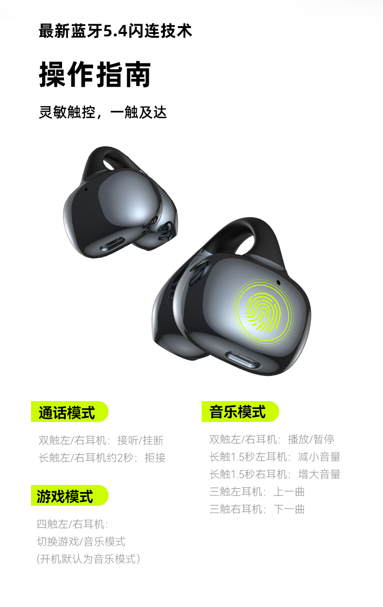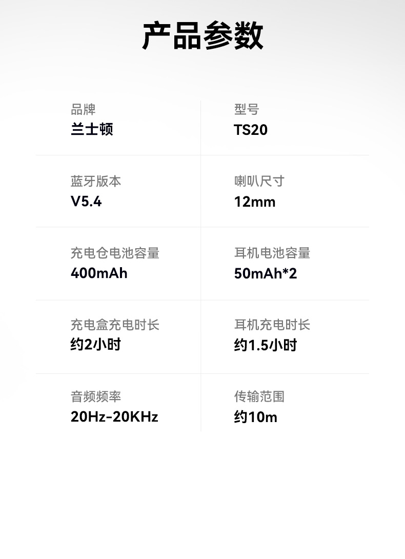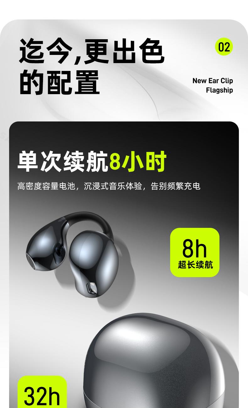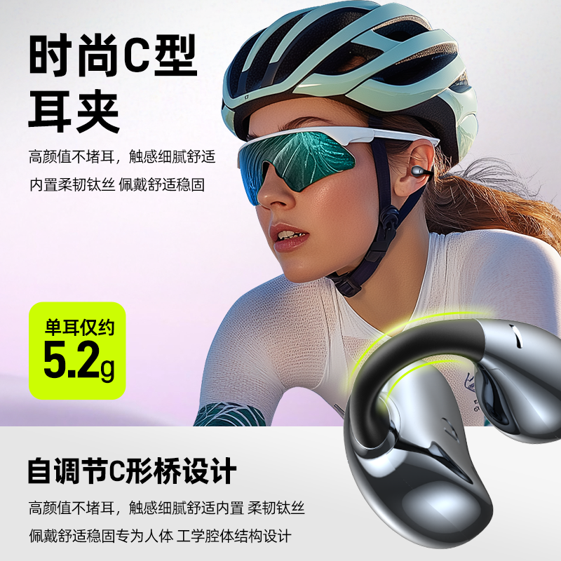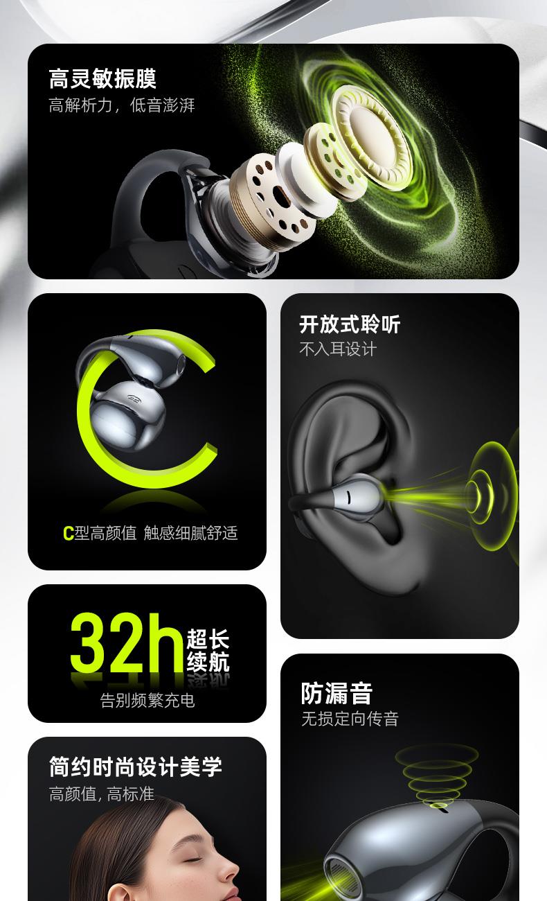 颜色:幻夜紫/雾岚灰 电池容量:50mAh*2/400mAh 包装尺寸:120*120*52mm 外箱尺寸:550*545*265mm 续航时间:32小时 充电时间:1.5小时 蓝牙版本:V5.4 防水级别:IPX4 亮面质感,既是耳机也是穿搭耳饰 开放不入耳,5.2g轻盈无负担 千+人耳数据,硅胶贴合兼容眼镜党 12mm动圈+定向传声,漏音少音质佳 IPX4防水,应对日常小雨汗液 单次8h续航,充电仓总续32h AI通话降噪,人声清晰沟通顺