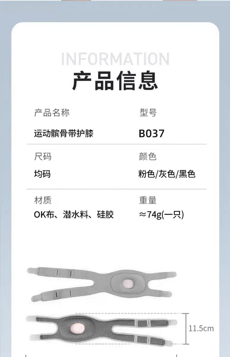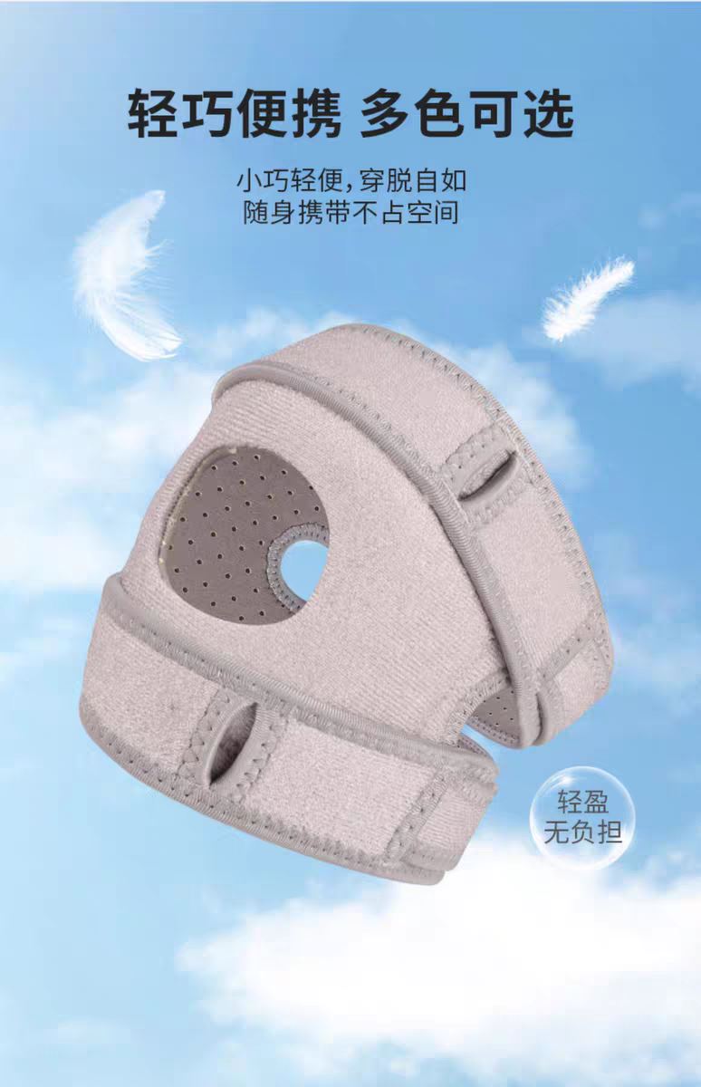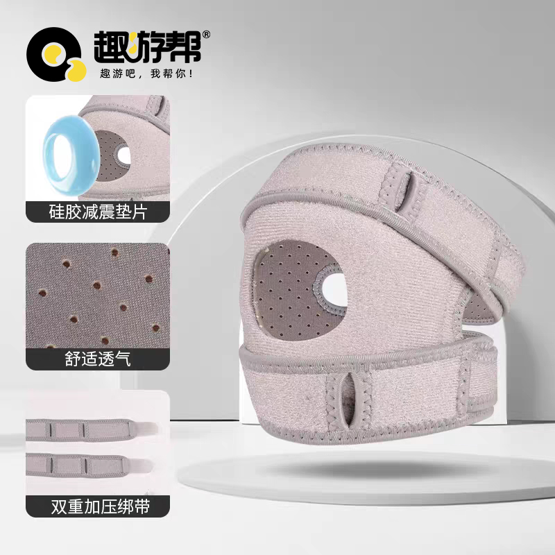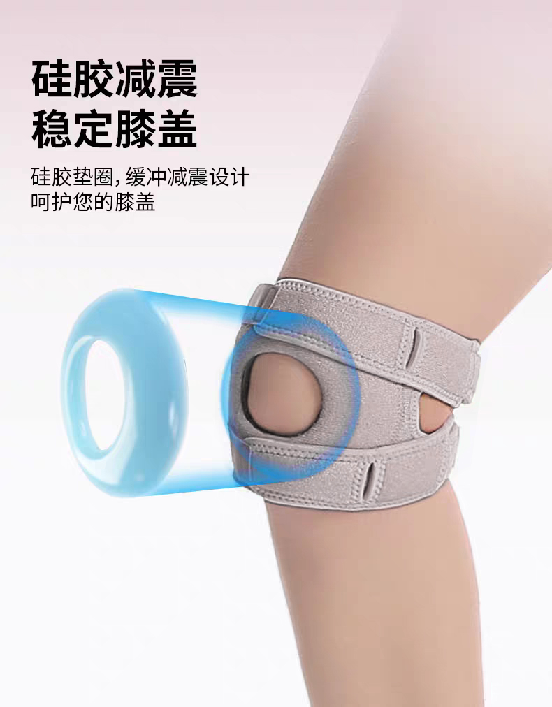 材质 硅胶圈 ok布 颜色 浅灰色 尺寸 53*10cm 重量 0.1kg 专为运动设计 升级硅胶缓震垫片能在运动时对膑骨产生固定 支撑效果强,能缓冲过多的冲击力 降低因跳跃或频繁弯曲造成不适