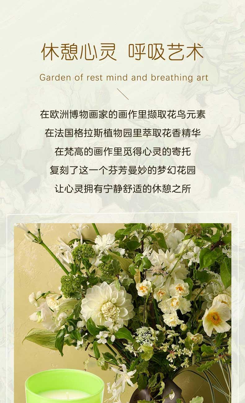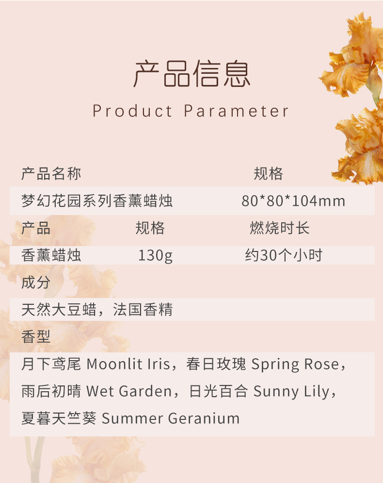 香薰蜡烛:130g 香型: 雨后初晴 Wet Garden 日光百合 Sunny Lily 夏暮天竺葵 Summer Geranium 春日玫瑰 Spring Rose 月下鸢尾 Moonlit Iris