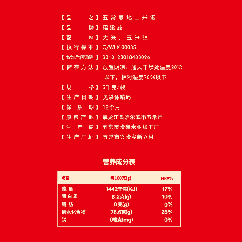 包装:真空袋装 执行标准:Q/WLX 0003S 保质期:12个月 质量等级:优质一级 产地:黑龙江五常市 产品尺寸:300mm*240mm*80mm 推荐理由: 1、PICC人保承保产品。 2、稻田24小时实时监控。 3、智慧农业系统。 4、当月现磨新米发货。 5、独立溯源码。 6、双层真空保鲜。