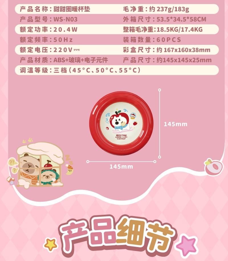 毛净重:约237g/183g 产品型号:WS-N03 外箱尺寸:53.5*34.5*58CM 额定功率:20.4W 整箱毛净重:18.5KG/17.4KG 额定频率:50Hz 额定电压:220V 彩盒尺寸:约167x160x38mm 产品材质:ABS+玻璃+电子元件 产品尺寸:约145x145x25mm 调温等级:三档(45°C、50°C、55°C) 备注:本产品整箱发货
