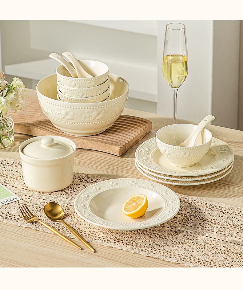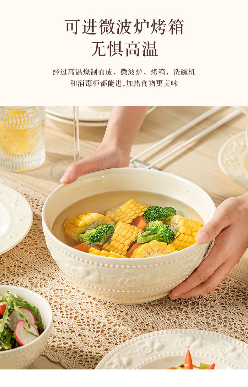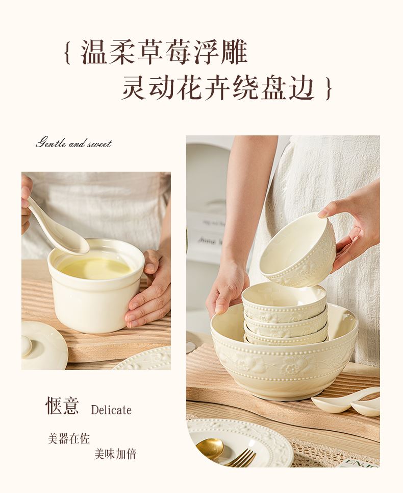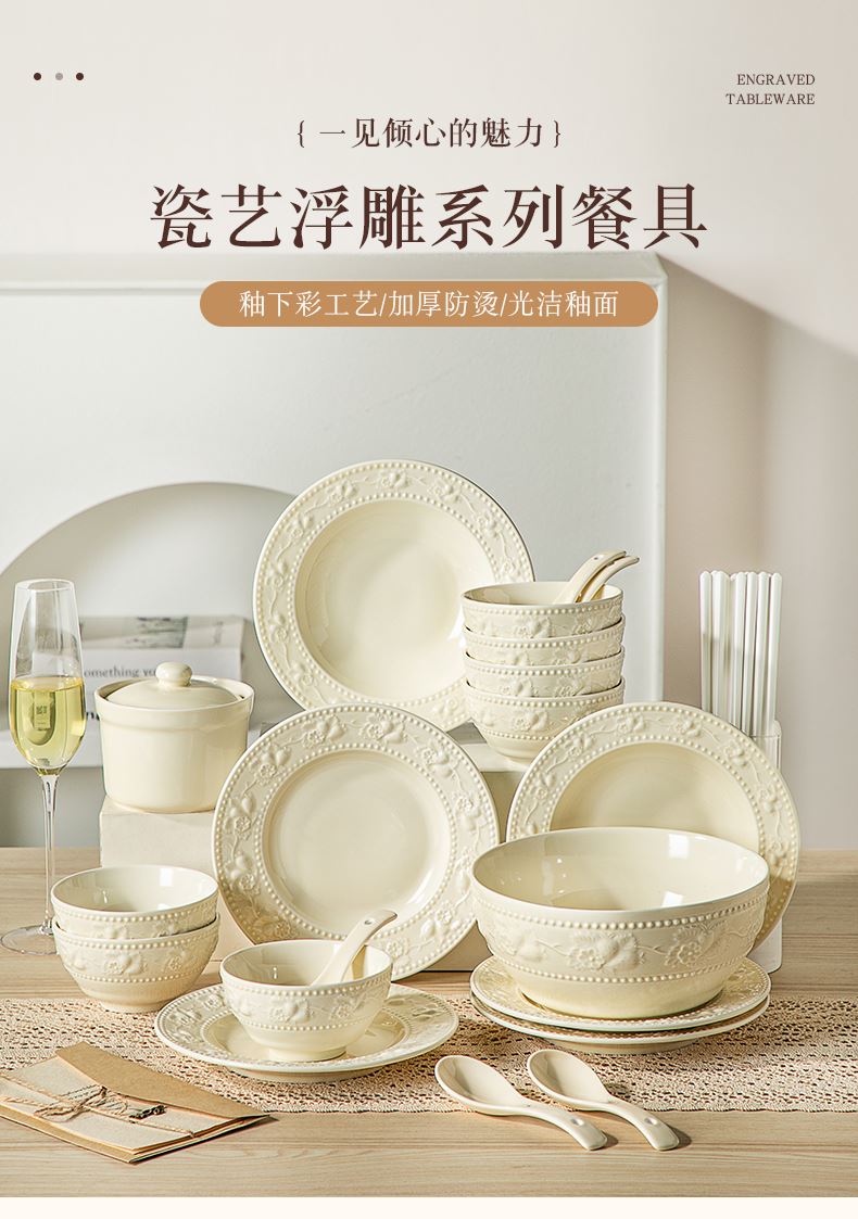 【材质】陶瓷 【颜色】米色 【包装方式】彩盒 【外箱尺寸】404x165x284mm 【重量】3.2kg 【条码】6957929941331 【配置】4.5寸小碗*4,8寸浅盘*1,8寸深盘*1,勺子*4,300ml炖盅*1 精选优质陶土,高温烧制,釉面光滑易清洗,省时省力,即刻干净如新,可进烤箱、微波炉,洗碗机,釉下花色永不褪色,更健康,使用更安全; 细腻的浮雕工艺,在餐具上悄然绽放,轻轻触摸,指尖能感知到的脉络纹理,那是匠人们倾注的心血与深情。 优质瓷质,质地温润如玉,不仅触感舒适,更具出色的耐用性。高温烧制让色彩经久不褪,浮雕的立体感历久弥新。清洗时,光滑的表面也能让污渍无所遁形,轻松打理.