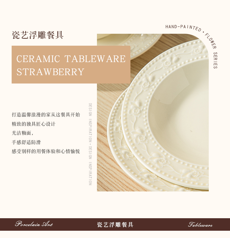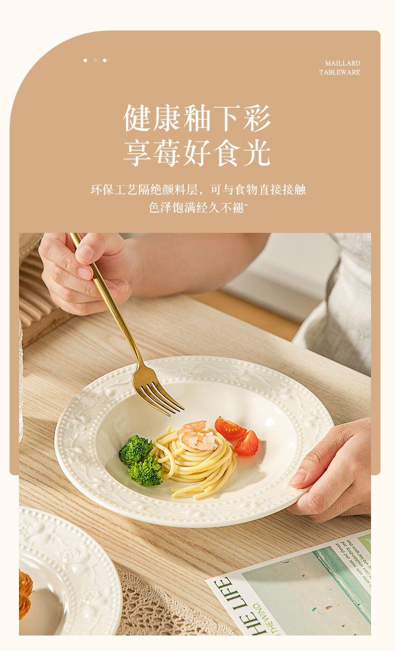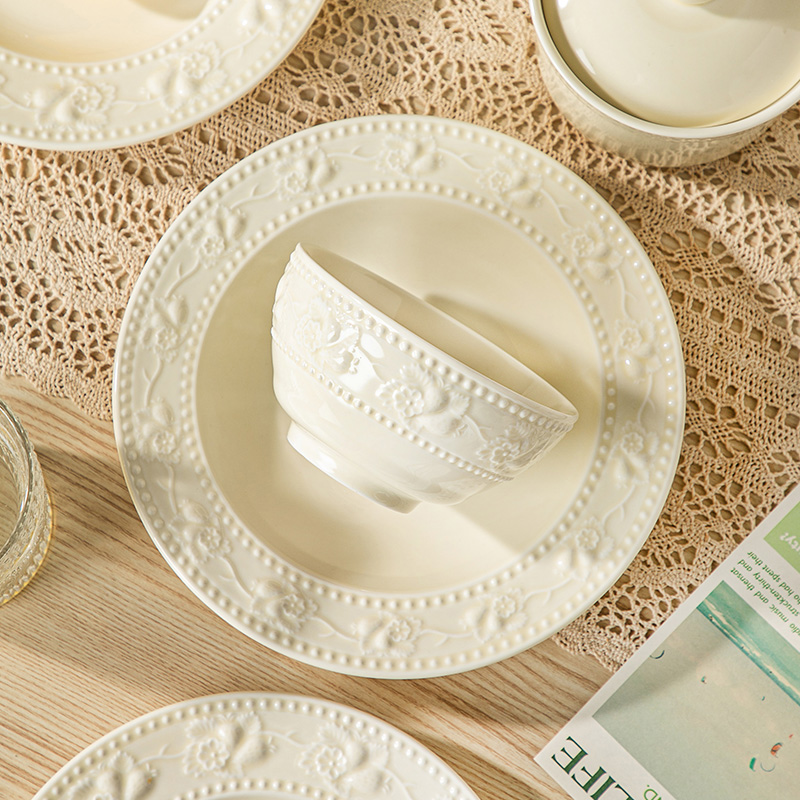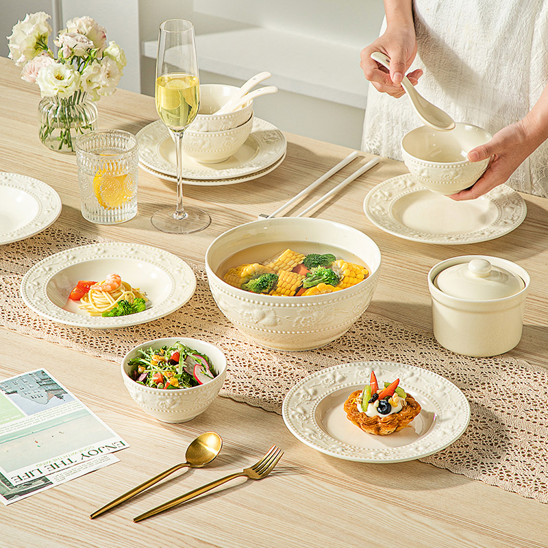 【材质】陶瓷 【颜色】米色 【包装方式】彩盒 【外箱尺寸】404x165x284mm 【重量】3.2kg 【条码】6957929941331 【配置】4.5寸小碗*4,8寸浅盘*1,8寸深盘*1,勺子*4,300ml炖盅*1 精选优质陶土,高温烧制,釉面光滑易清洗,省时省力,即刻干净如新,可进烤箱、微波炉,洗碗机,釉下花色永不褪色,更健康,使用更安全; 细腻的浮雕工艺,在餐具上悄然绽放,轻轻触摸,指尖能感知到的脉络纹理,那是匠人们倾注的心血与深情。 优质瓷质,质地温润如玉,不仅触感舒适,更具出色的耐用性。高温烧制让色彩经久不褪,浮雕的立体感历久弥新。清洗时,光滑的表面也能让污渍无所遁形,轻松打理.